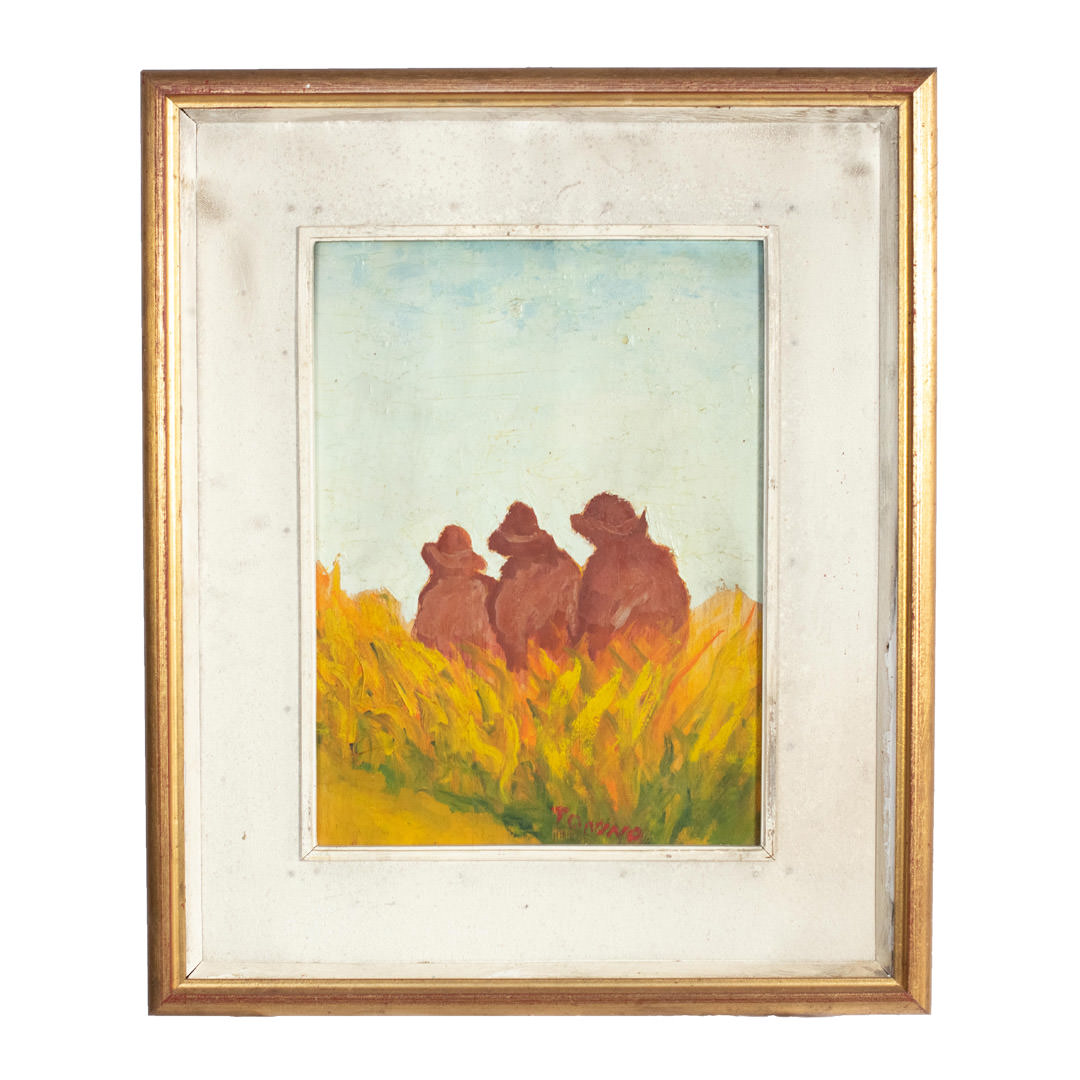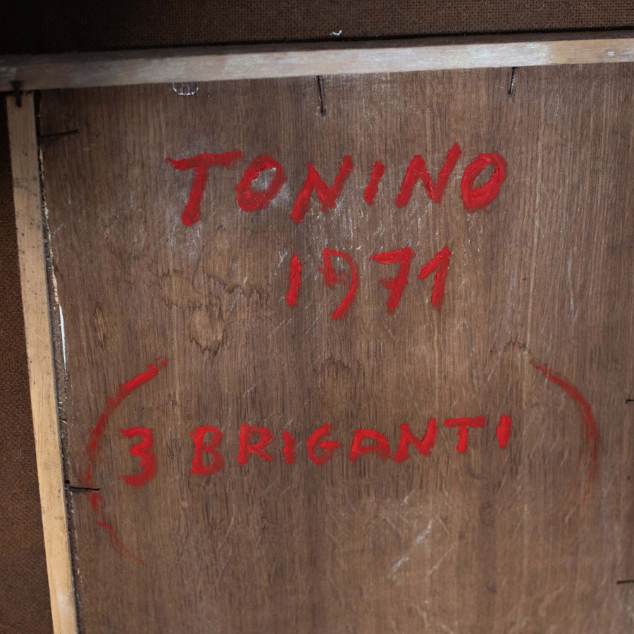 firmato in basso a destra Tonino; iscrizione sul retro della tavola 'Tonino 1971 (3 briganti)'