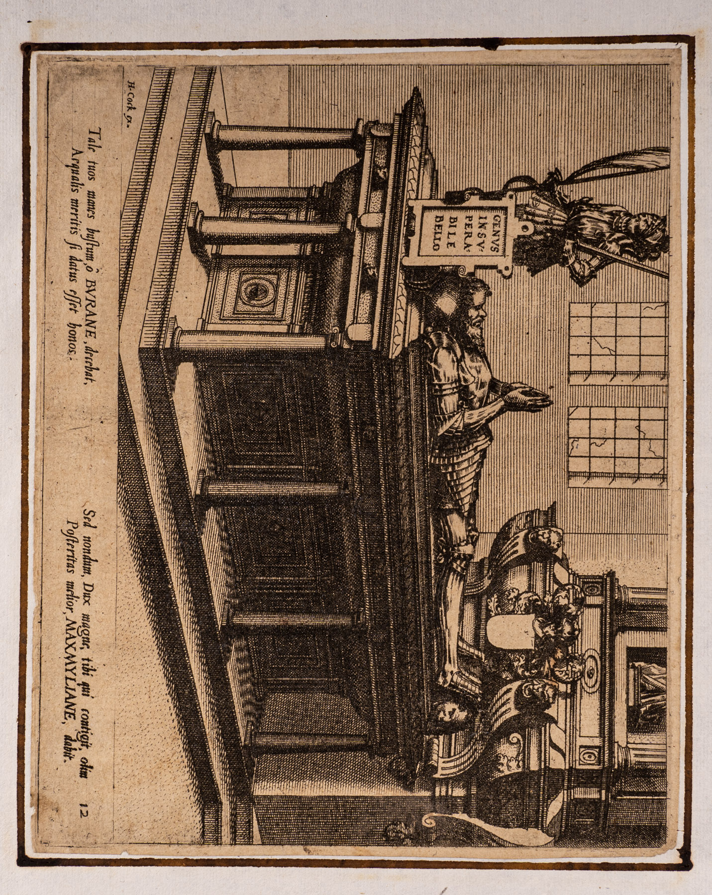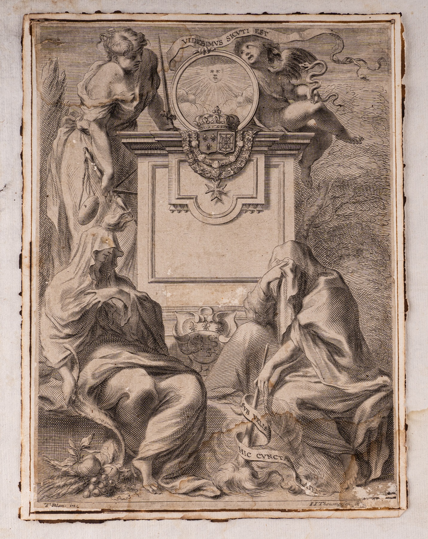 Johann Jakob Thourneyser (1636-1711), raffigurazione allegorica da un dipinto di Thomas Blanchet, XVII secolo, incisione all'acquaforte su carta vergellata applicata a cartoncino di epoca più tarda, cm 21,5x16, firmato sul fondo 'T. Blan in:/ I.I. Thourneyser'.