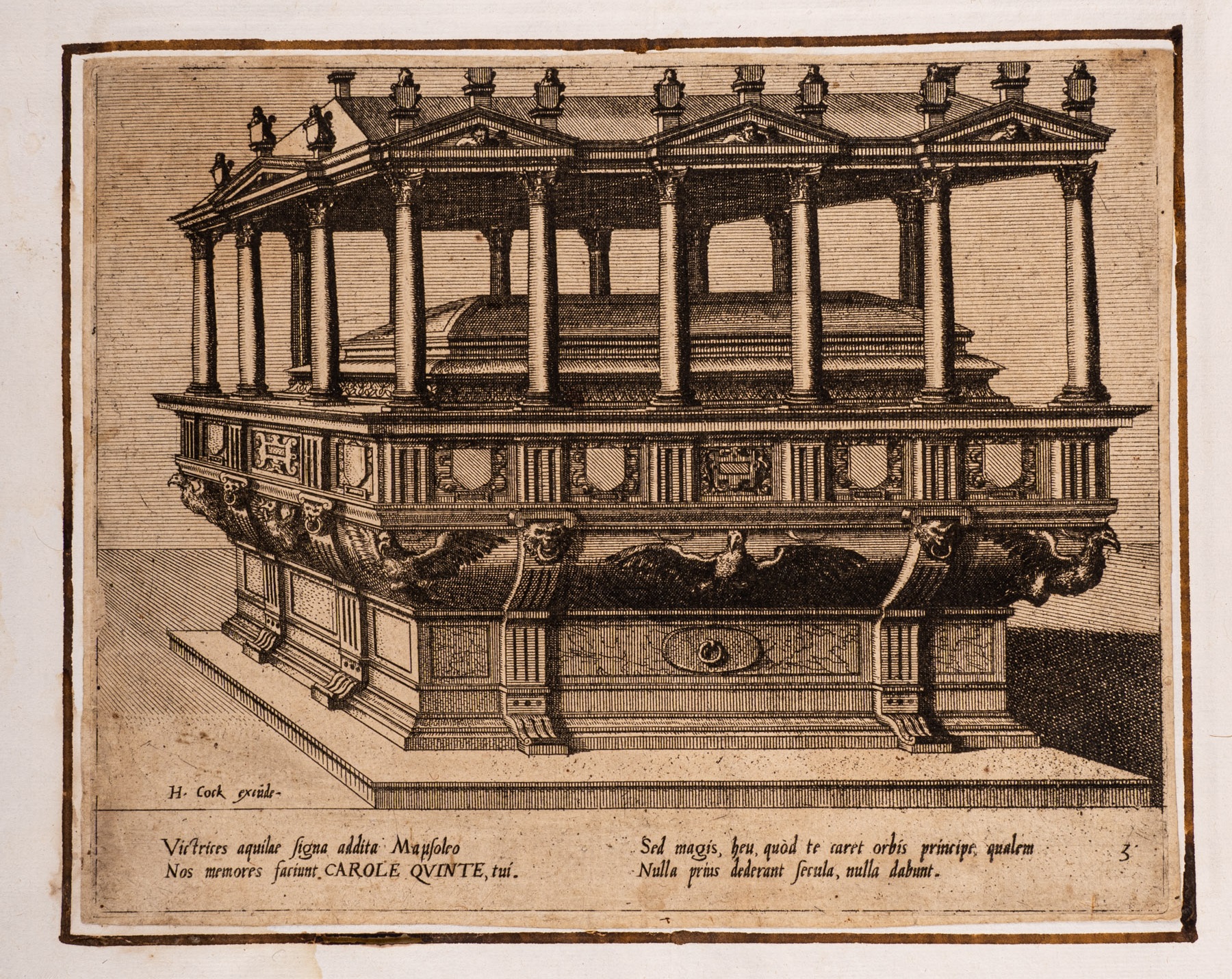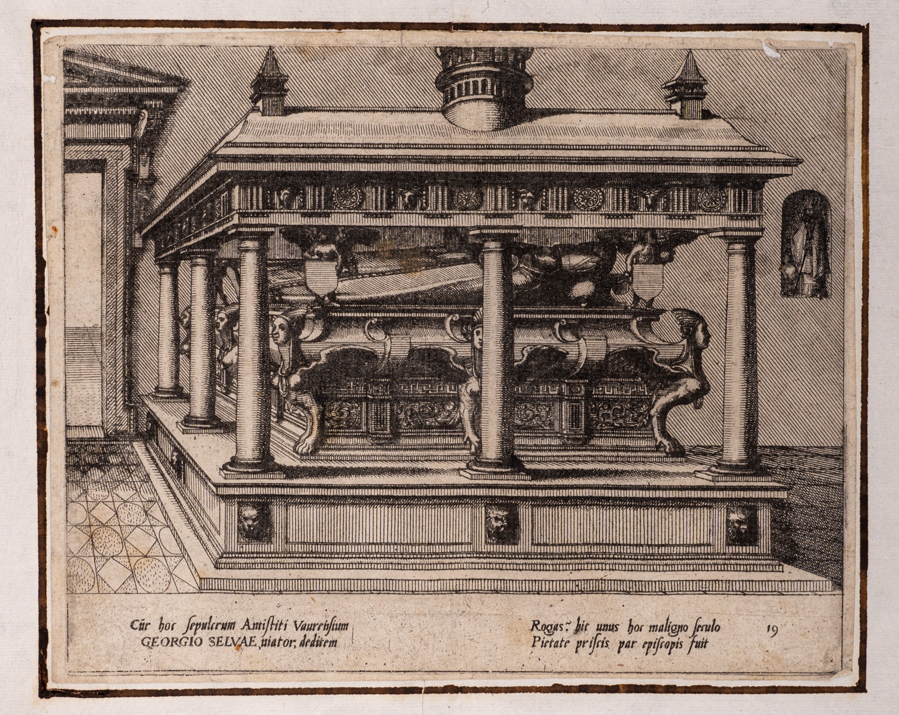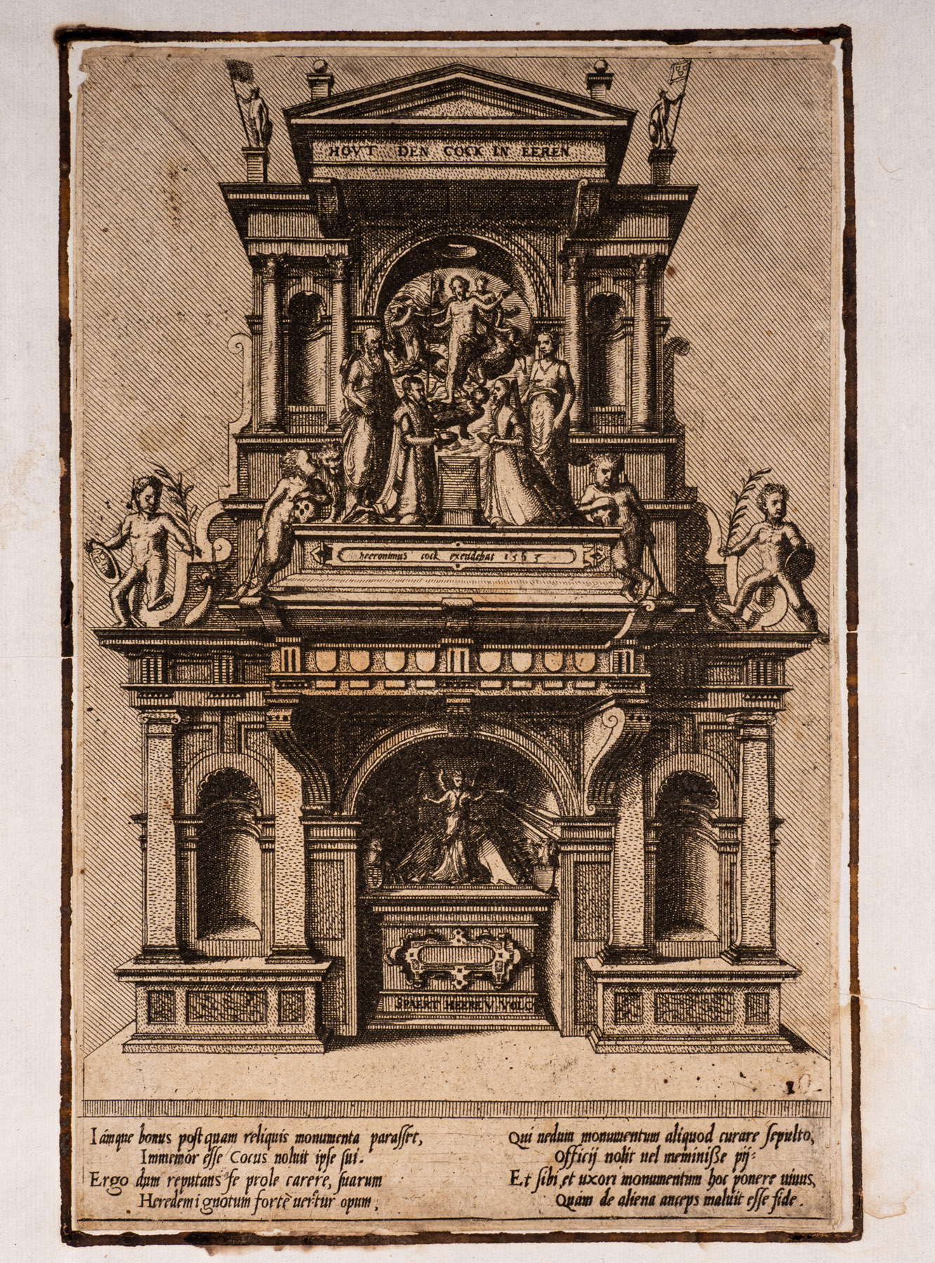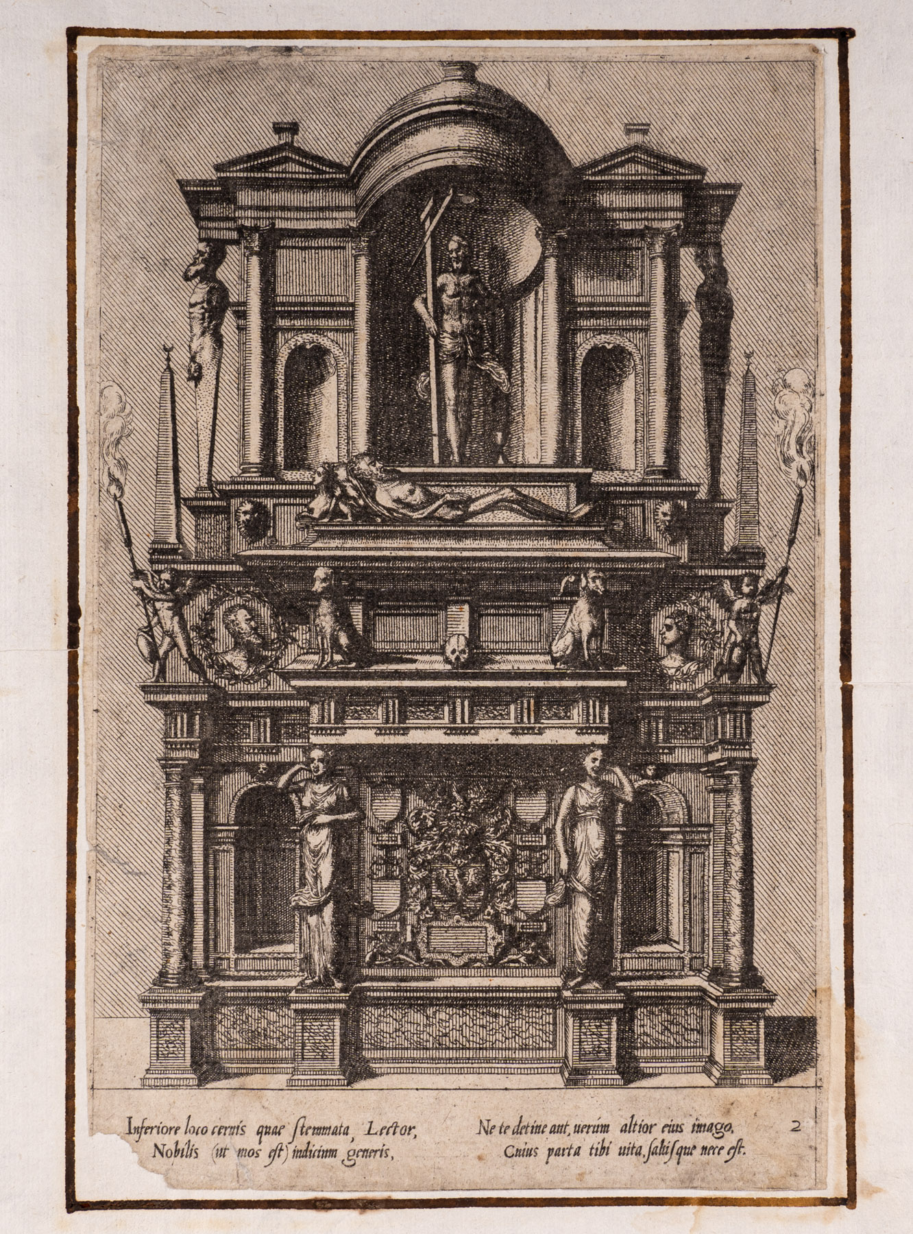Hieronymus Cock (1518 - 1570), Serie di 18 incisioni raffiguranti tombe monumentali, XVI secolo, incisione a bulino su carta vergellata applicata a cartoncino di epoca più tarda, cm 17x21.