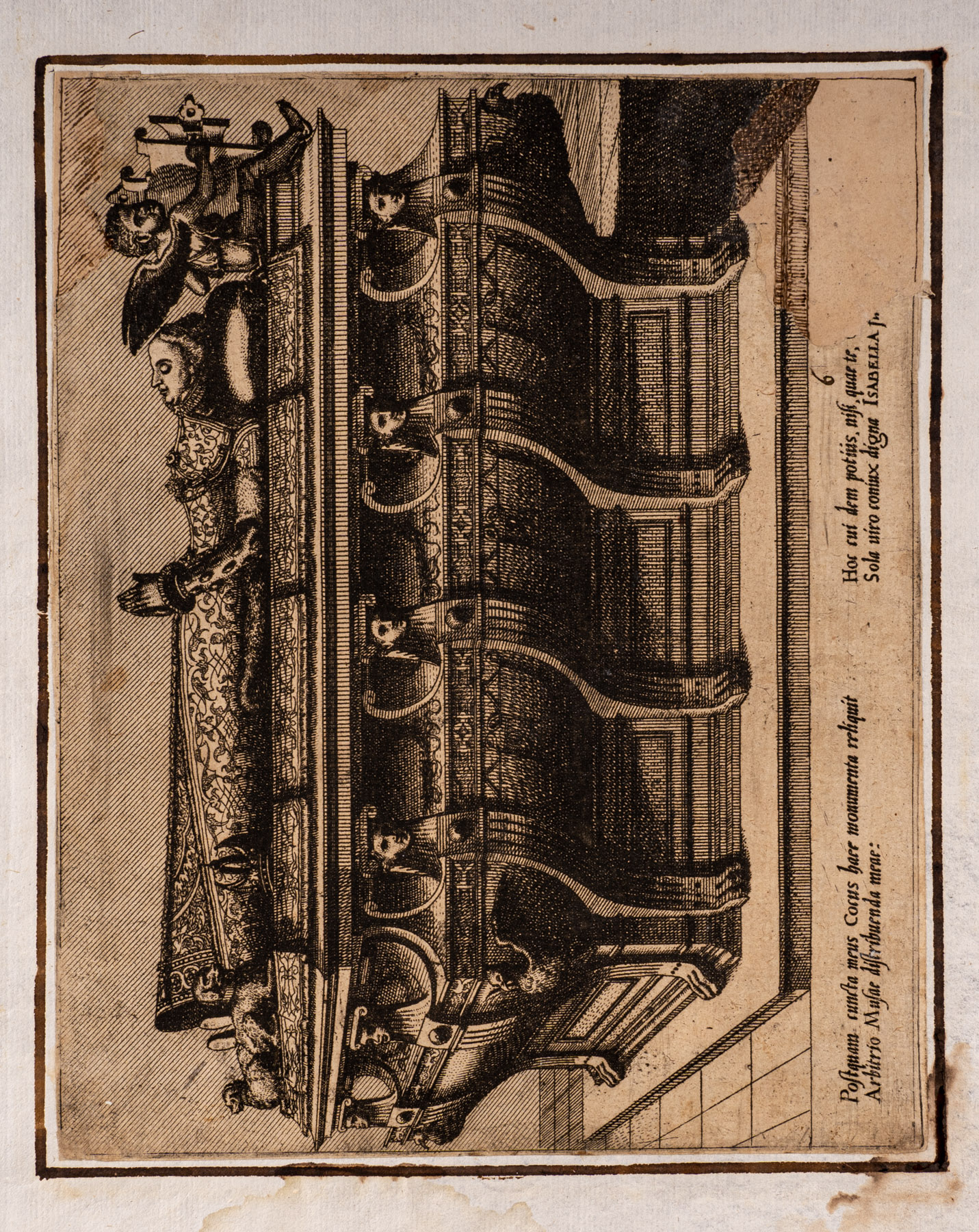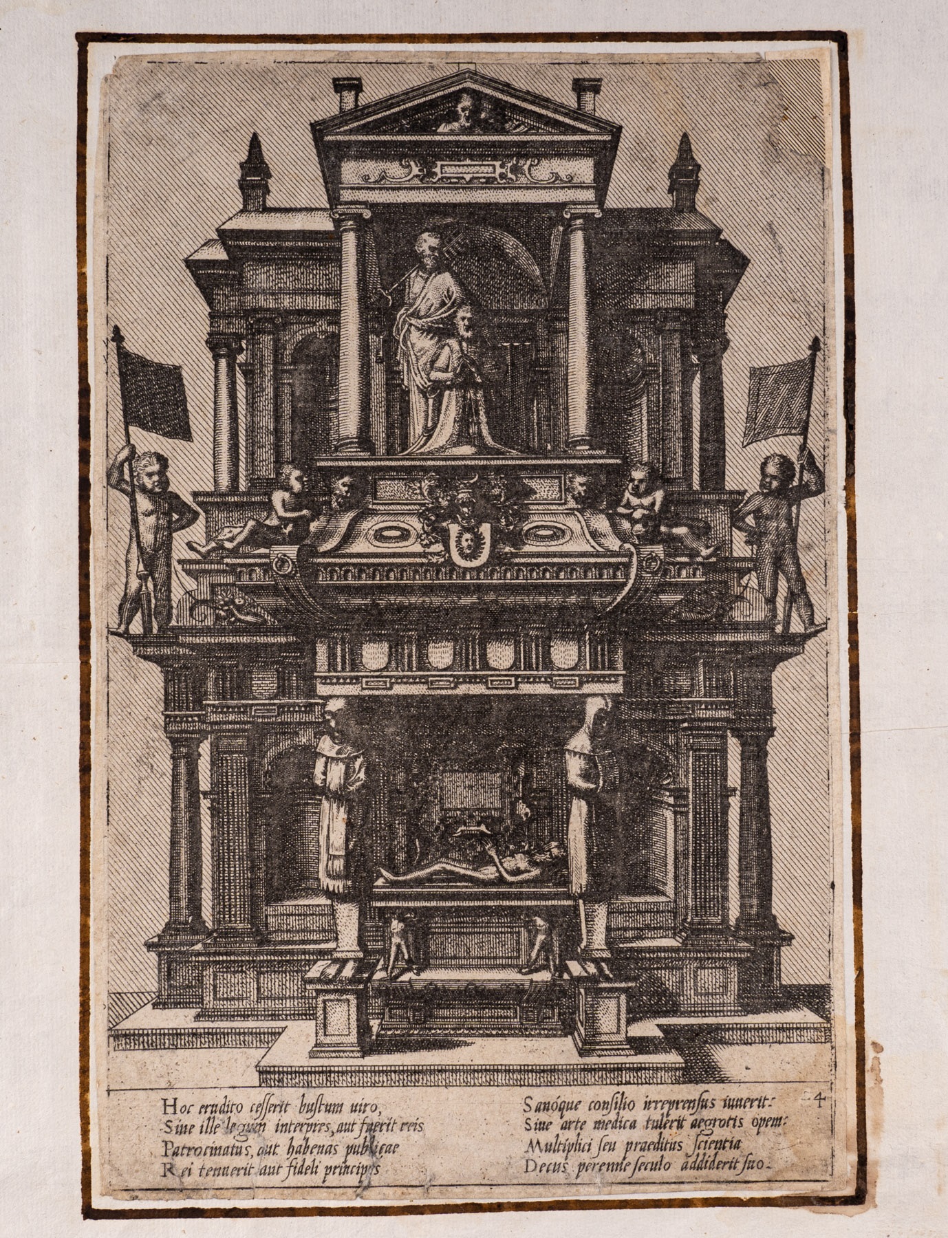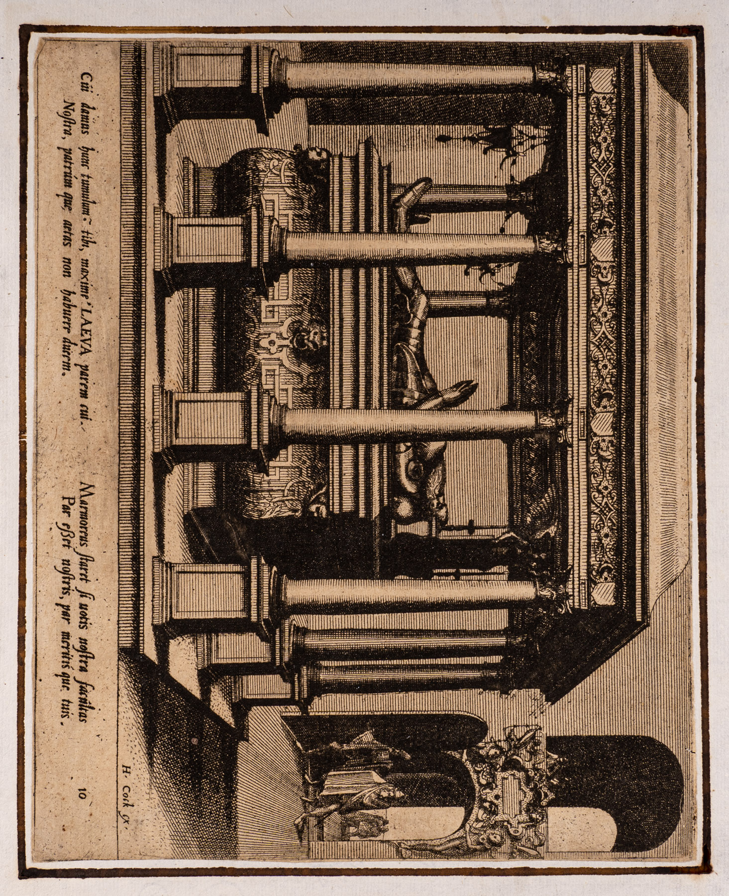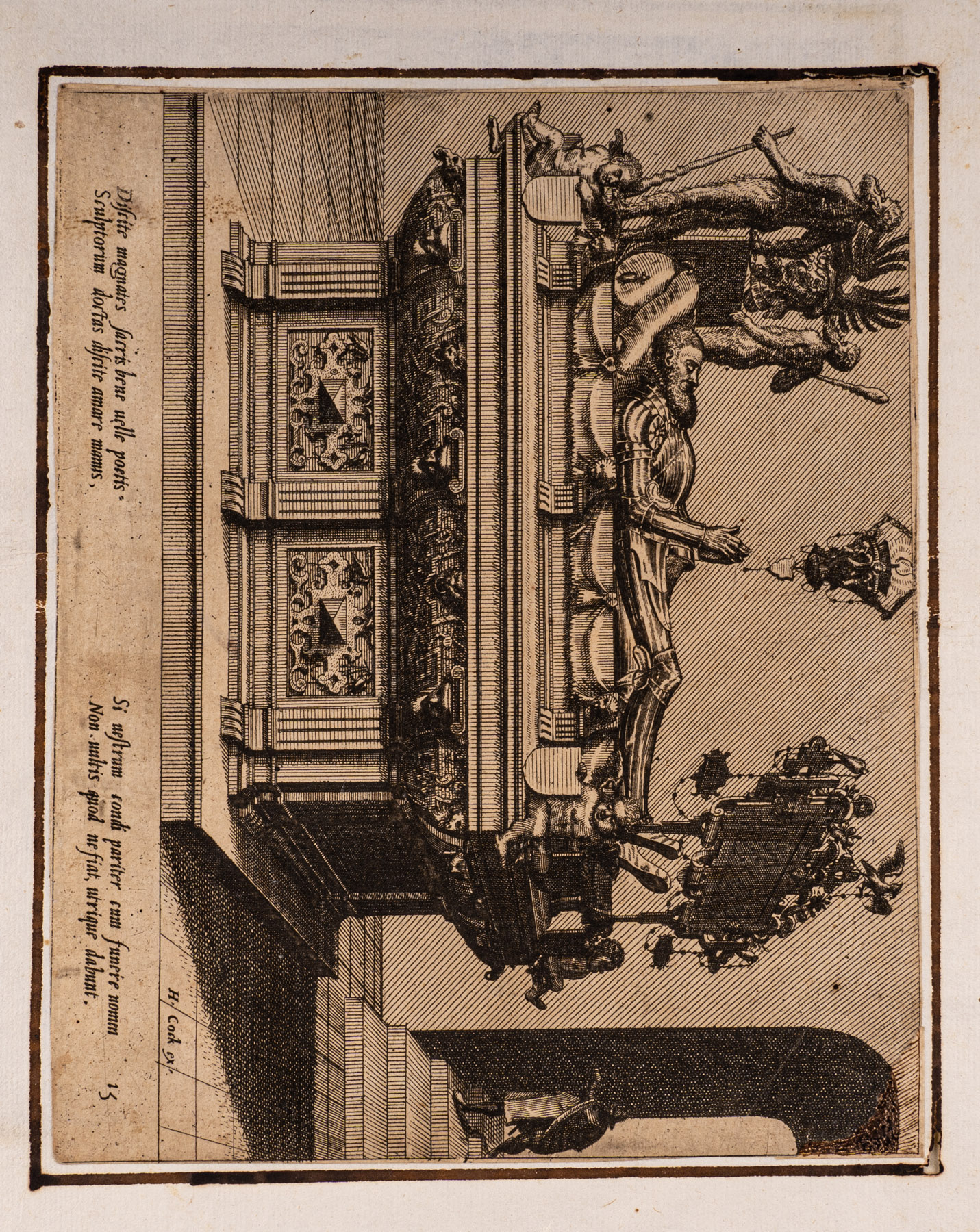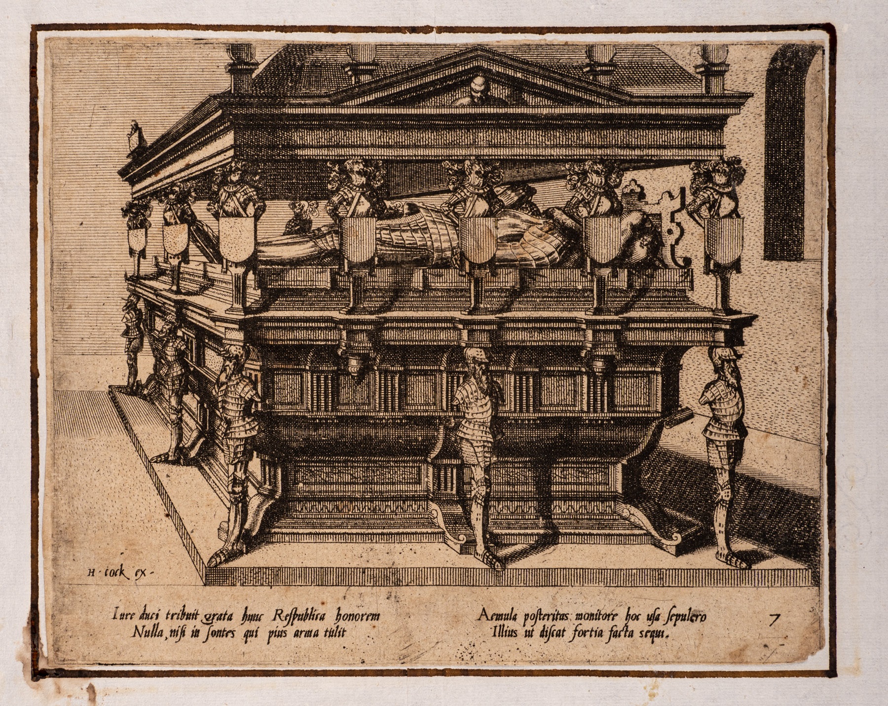 Hieronymus Cock (1518 - 1570), Serie di 18 incisioni raffiguranti tombe monumentali, XVI secolo, incisione a bulino su carta vergellata applicata a cartoncino di epoca più tarda, cm 17x21.
