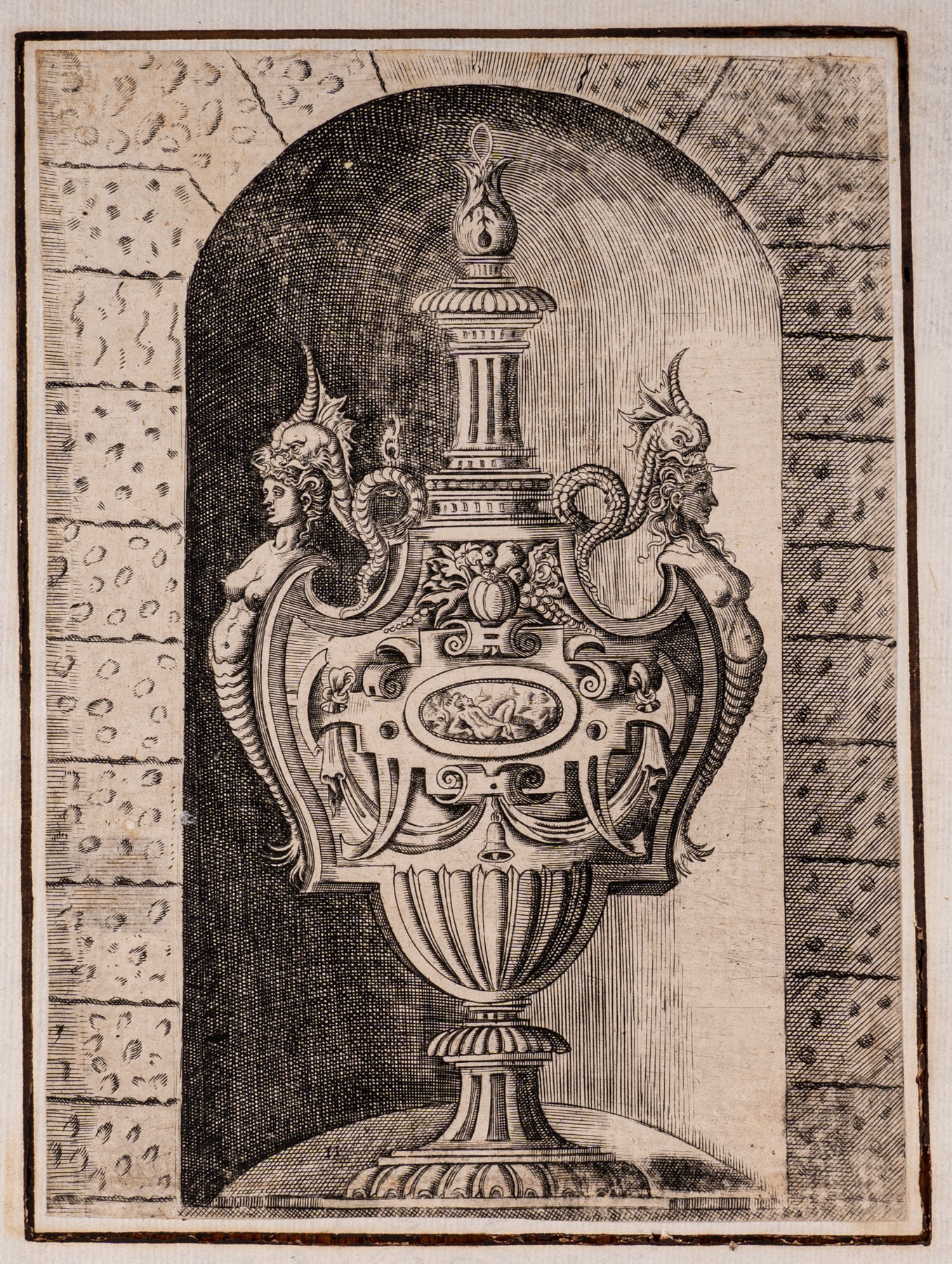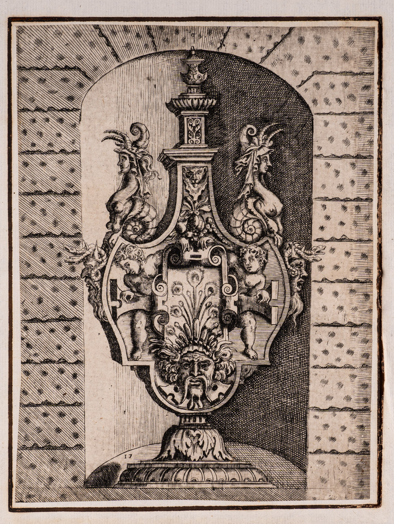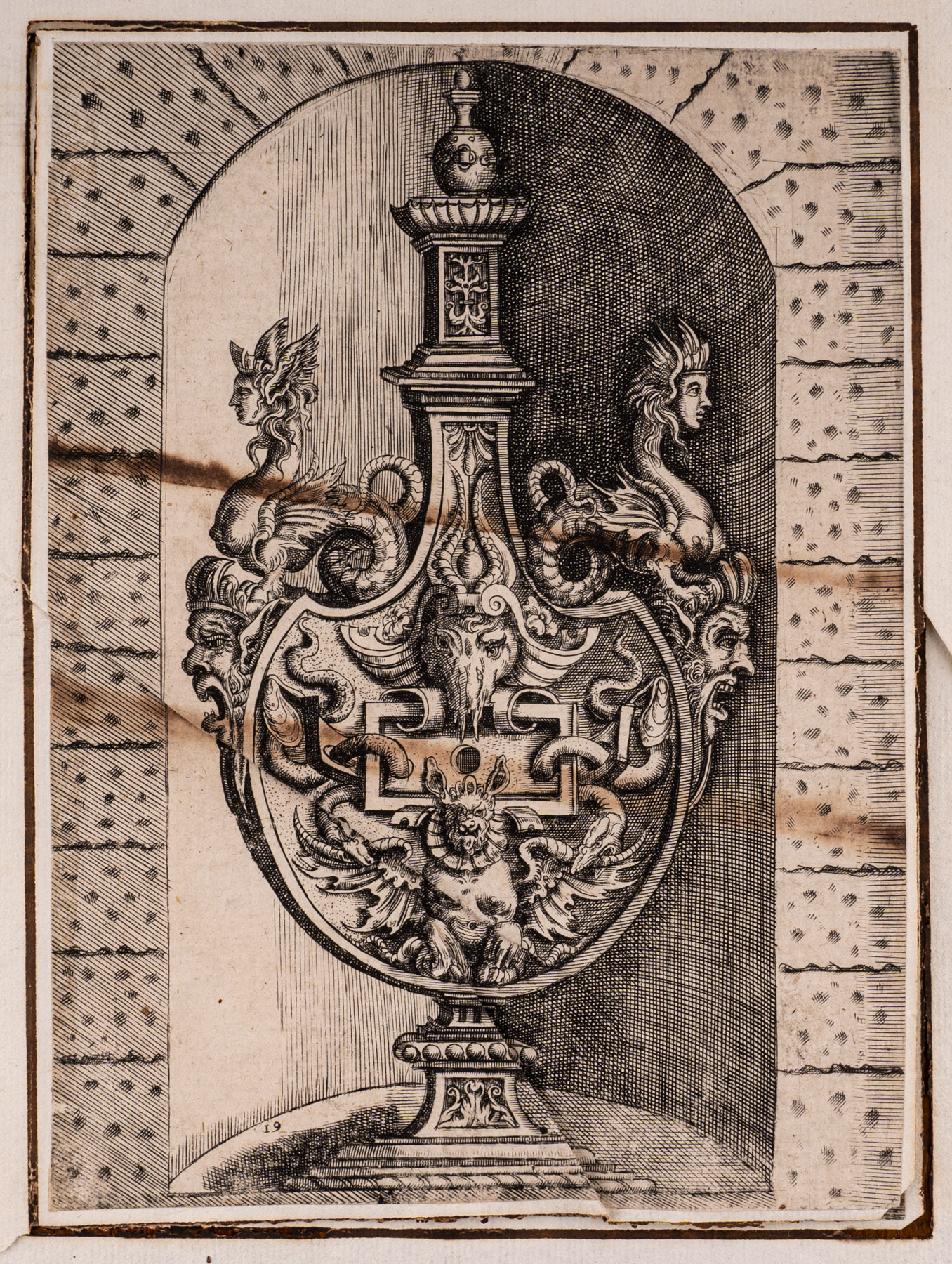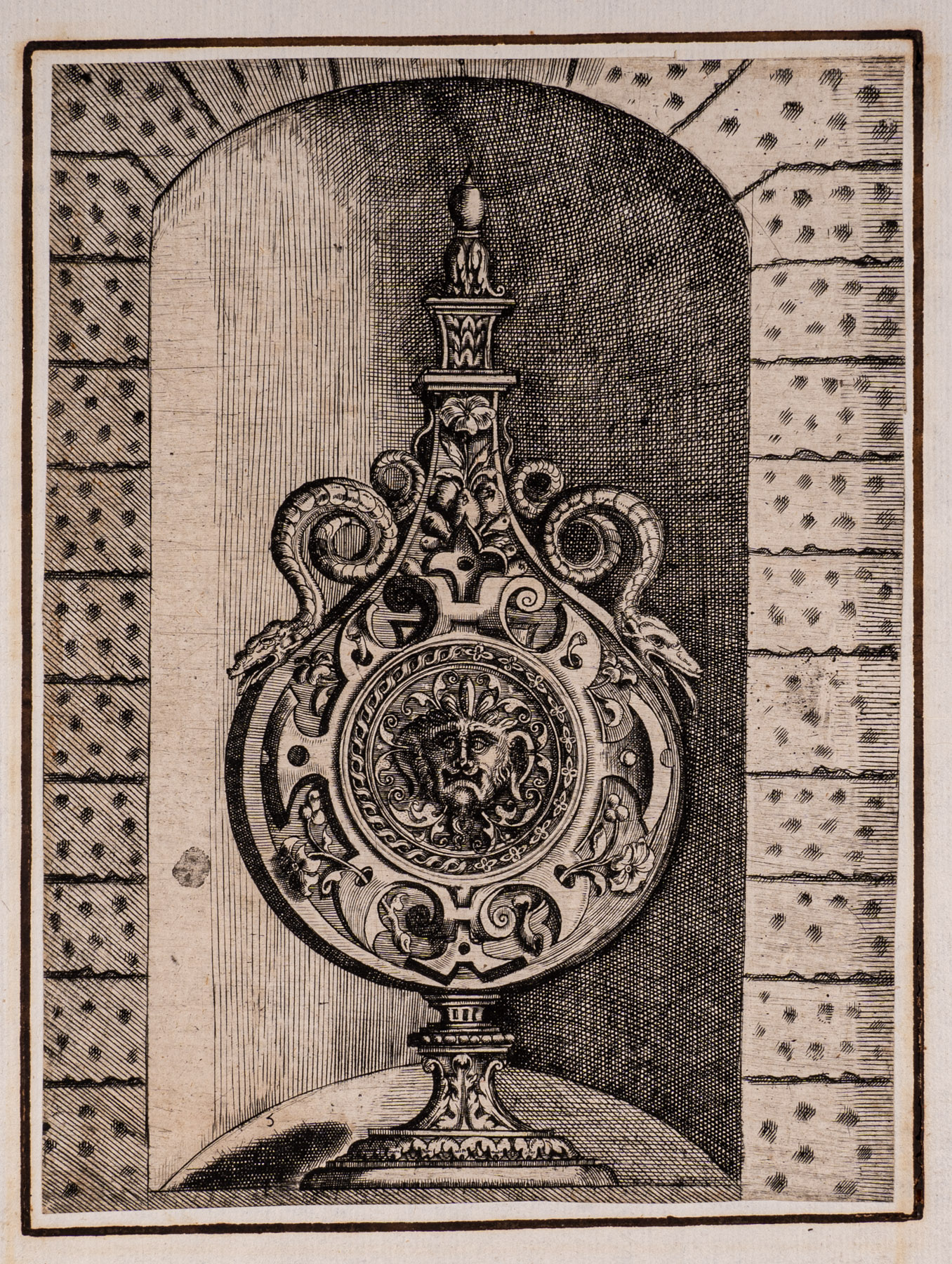 Serie di 17 incisioni con reliquiari decorati a grottesca, XVI secolo, incisione a bulino su carta vergellata applicata a cartoncino di epoca più tarda, cm 19x14.
