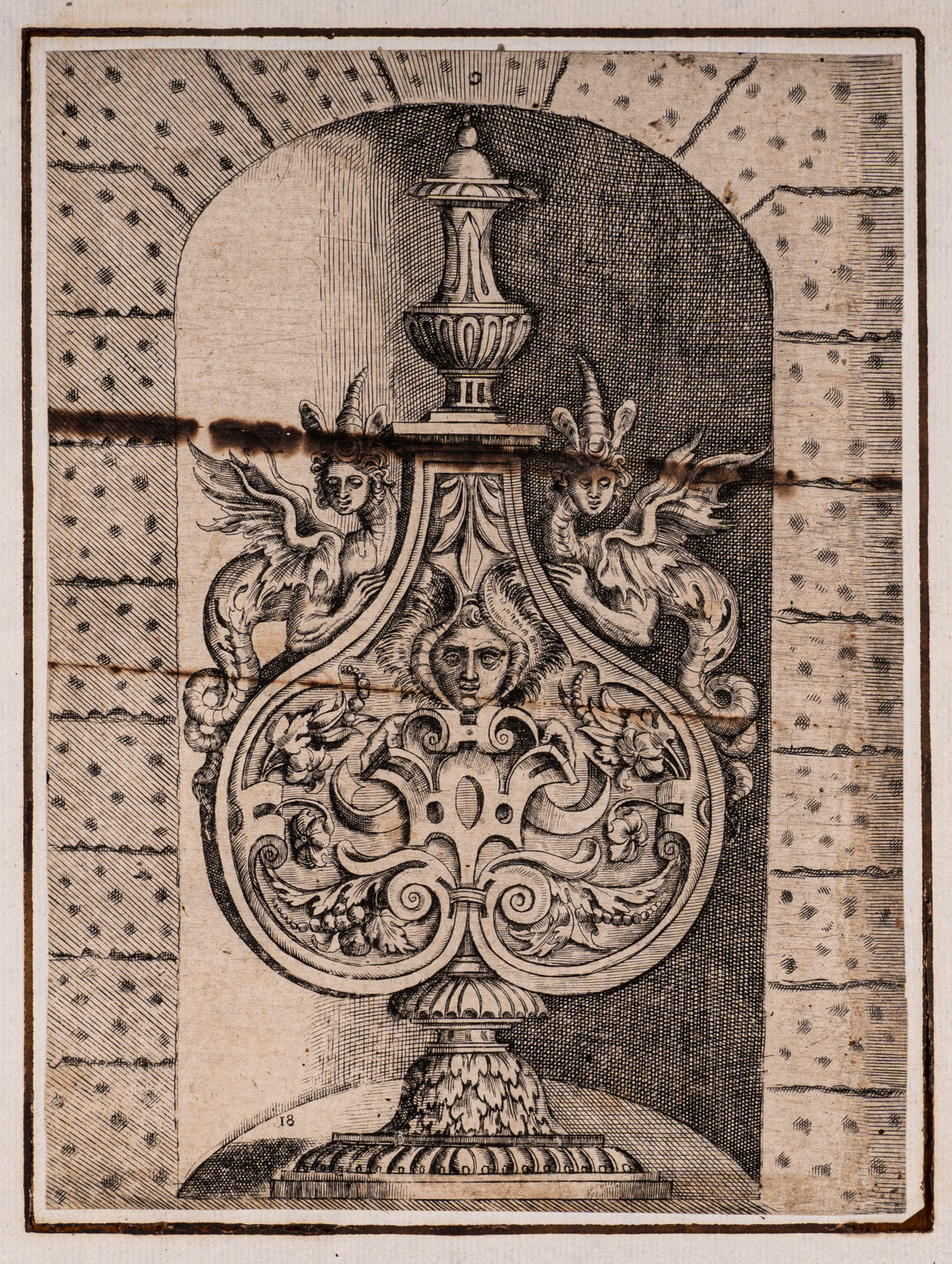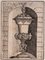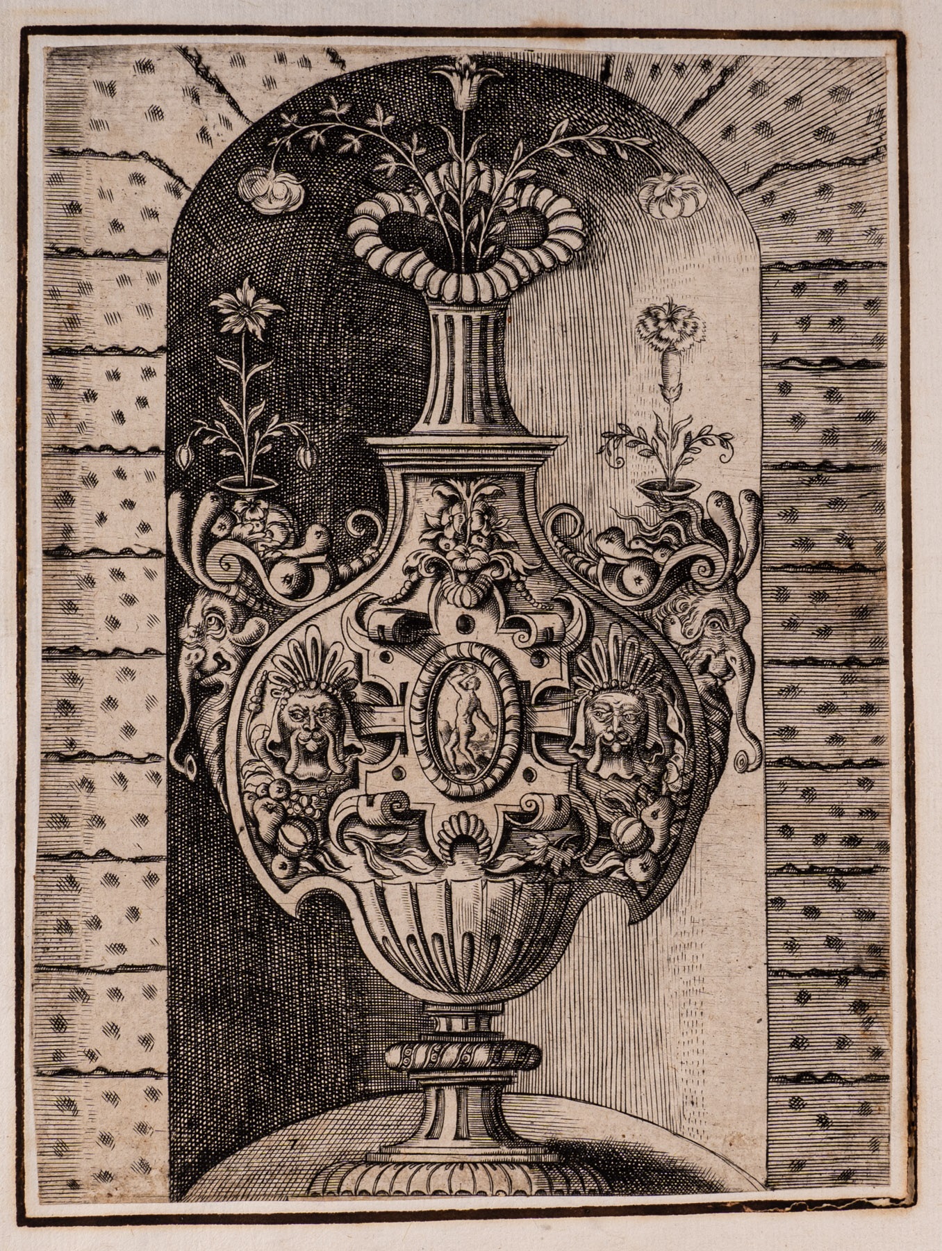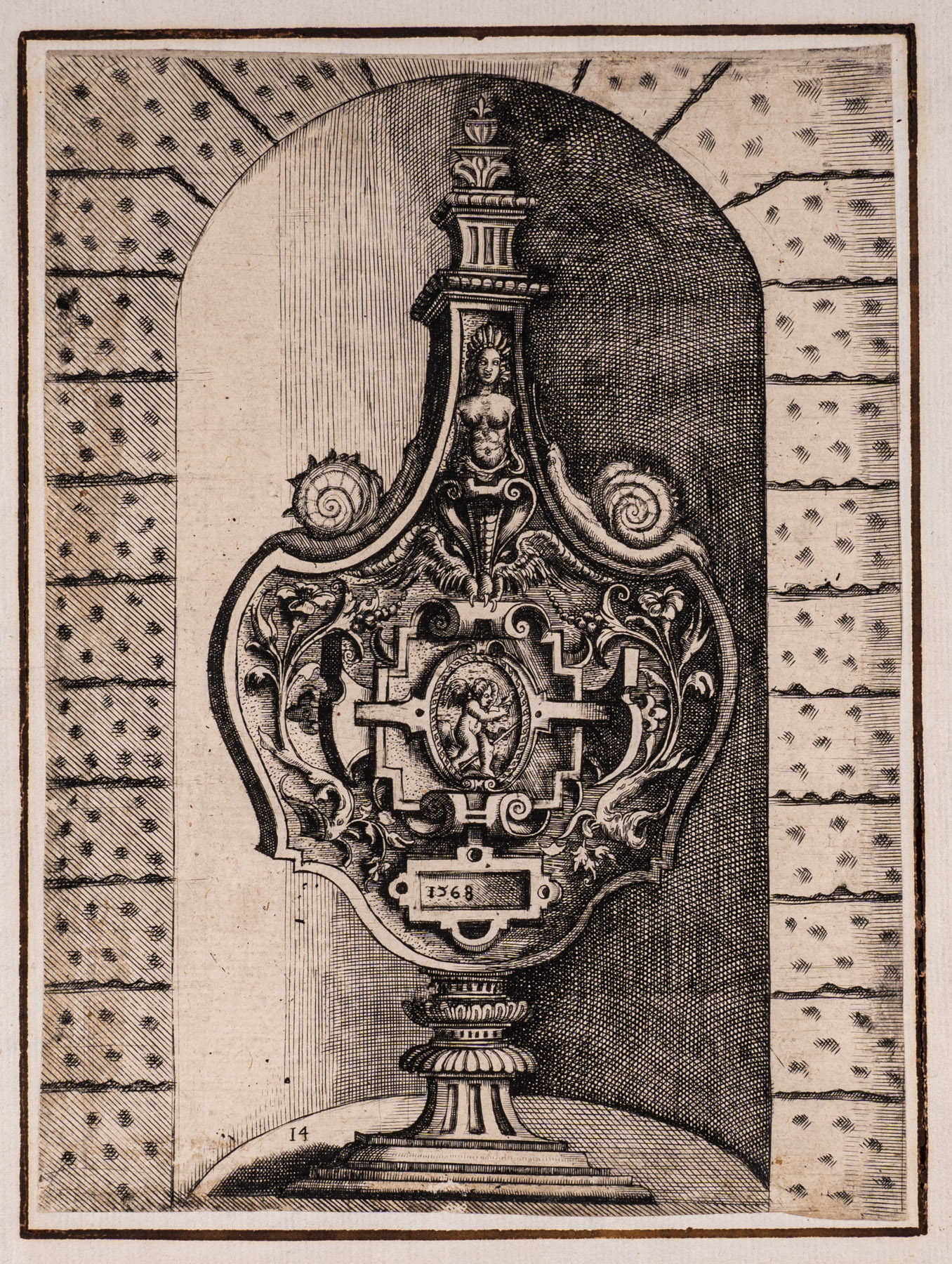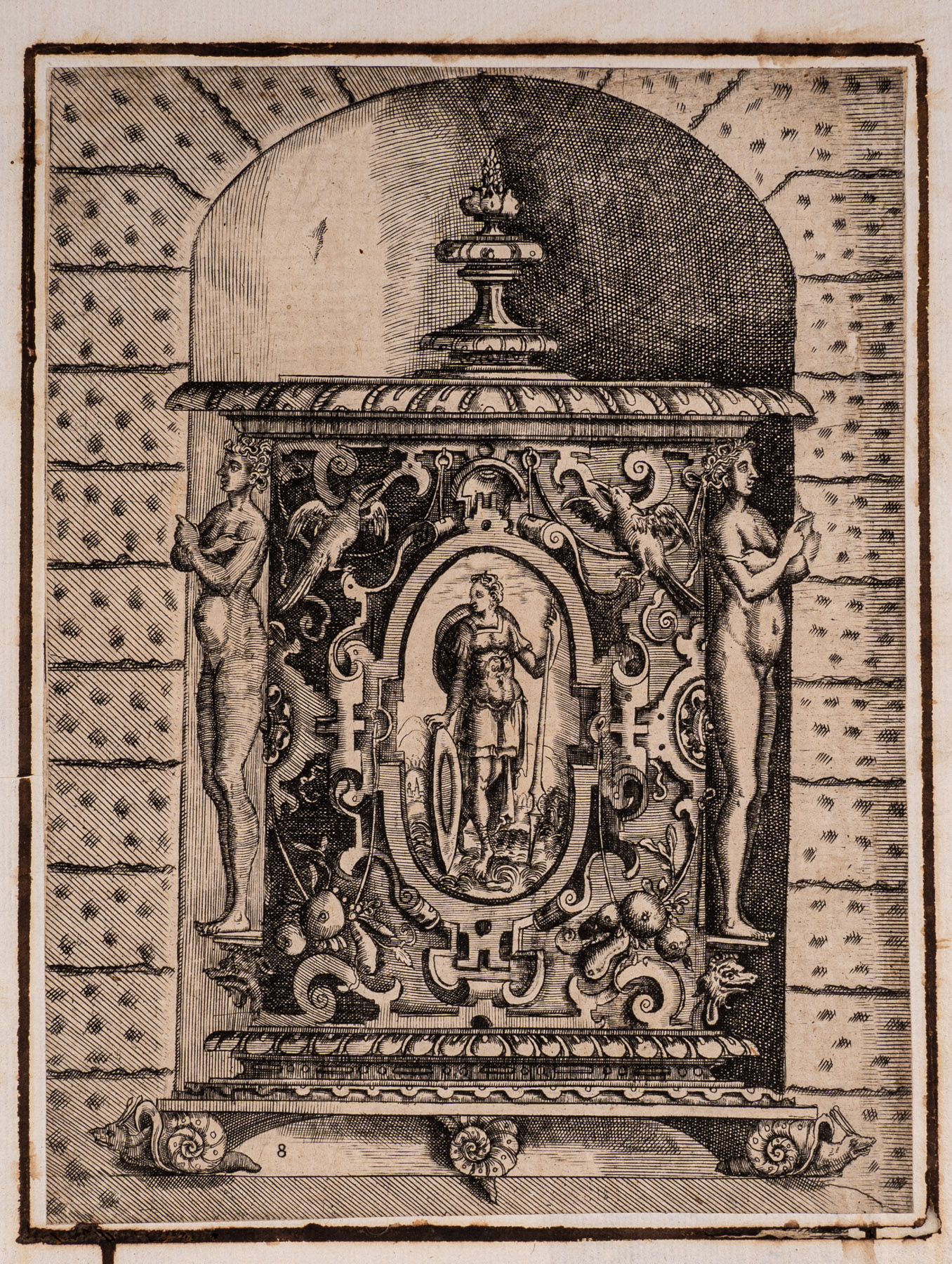 Serie di 17 incisioni con reliquiari decorati a grottesca, XVI secolo, incisione a bulino su carta vergellata applicata a cartoncino di epoca più tarda, cm 19x14.