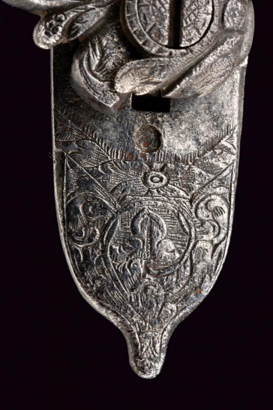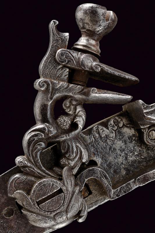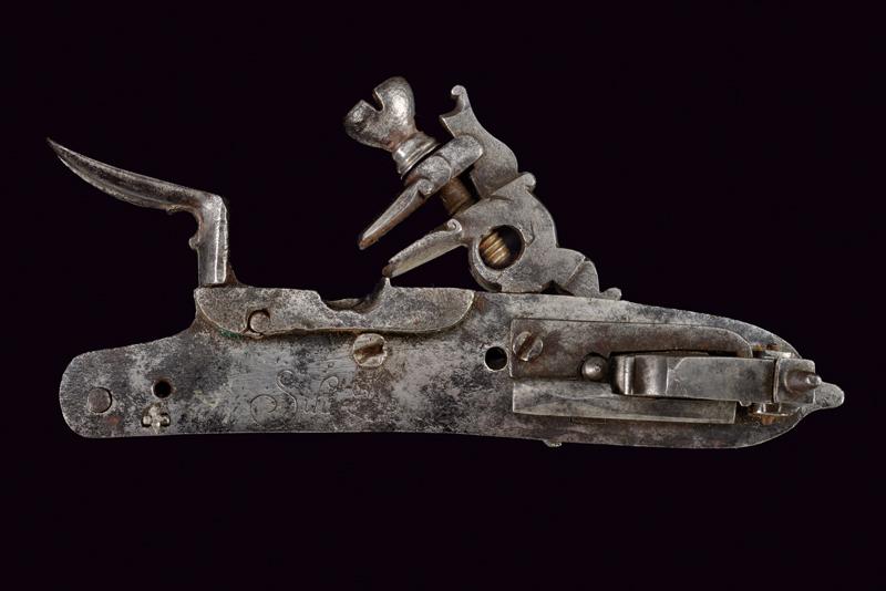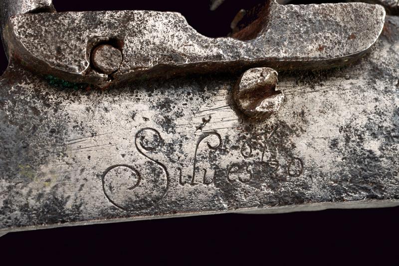 Batteria a pietra alla romana firmata Silvestro, datazione: Seconda metà del XVII Secolo provenienza: Italia centrale, Con cartella piatta recante alla codetta resti di intagli e incisioni a racemi su fondo a trattini. Bel cane lavorato a trafori a due elementi che si intrecciano, intagliati a racemi. Intaccature. Sul retro la firma 'Silvestro'. Barbiroli riporta un Silvestro Giovanni di Monte San Savino (Arezzo) documentato nel 1670. Vedi 'Repertorio Storico degli Archibugiari Italiani' pag. 498. lunghezza plate 16 cm.