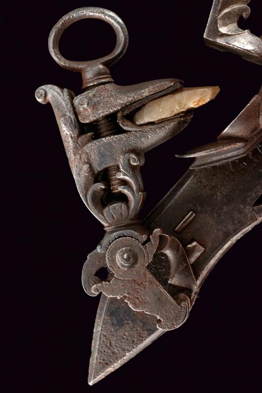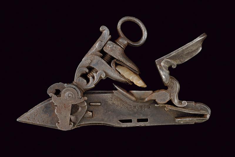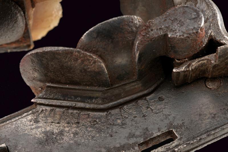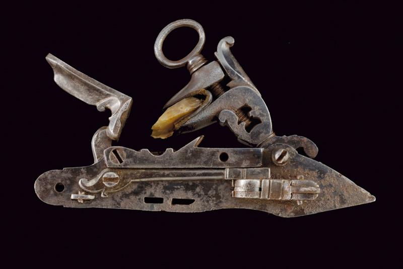 Batteria a pietra alla micheletta, datazione: fine del XVIII Sec. provenienza: Italia o Spagna, Cartella piatta a bordi scantonati con delineature. Briglia del cane con incisioni e sagomature a foglie. Il cane con collo traforato. Scodellino con parascintille, martellina con incisioni. Intaccature, piccola mancanza alla molla della martellina, mollone mancante. Sotto allo scodellino la firma 'MAT CAR'. lunghezza plate 13,5 cm.