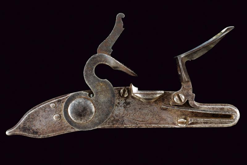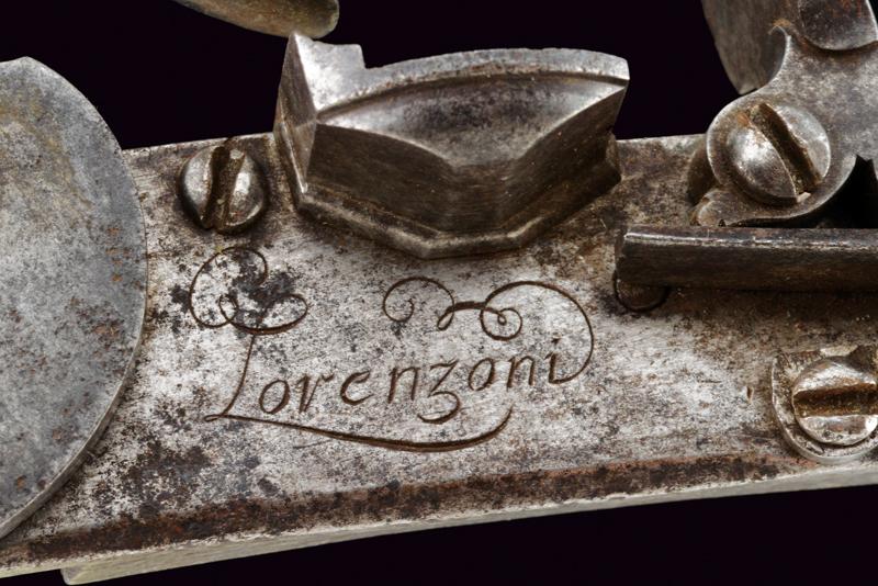 Batteria a pietra alla moderna firmata Lorenzoni, datazione: Prima metà del XVIII Secolo provenienza: Firenze, Cartella piatta con bordi scantonati. Cane a collo di cigno, piatto, mancante di vite del morsetto e ganascia superiore. Scodellino con piccolo parascintille. Al centro della piastra la firma 'Lorenzoni' fra volute. Per Michele Lorenzoni di Firenze, attivo sino ai primi quattro decenni del XVIII secolo e noto soprattutto per i suoi sistemi a ripetizione, vedi 'Repertorio Storico degli Archibugiari Italiani' di Barbiroli: pag. 333. lunghezza plate 16,2 cm.