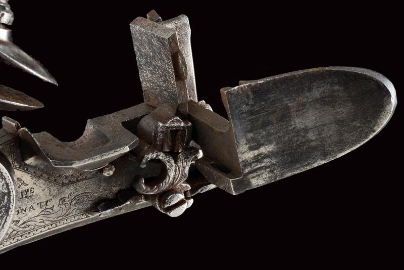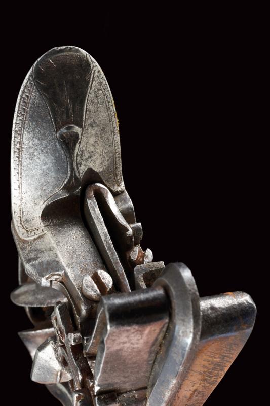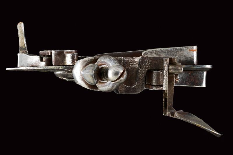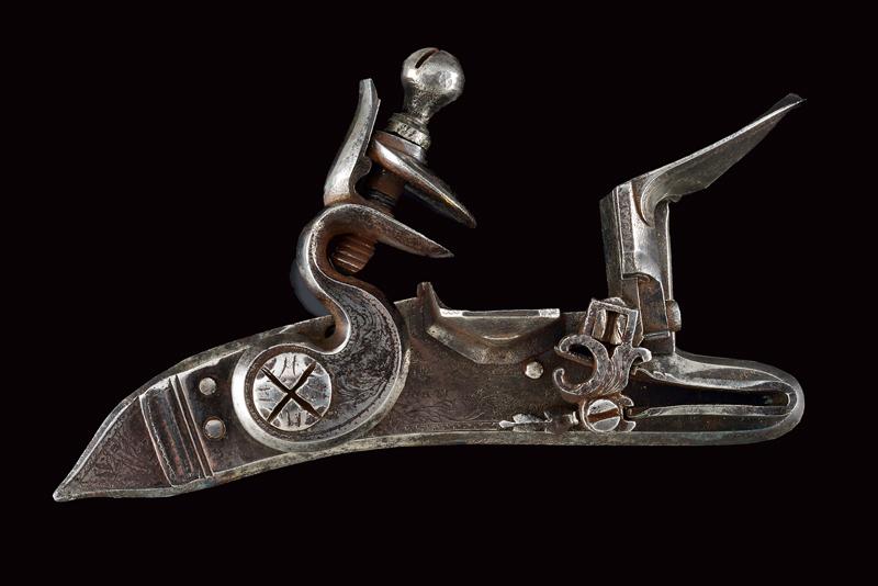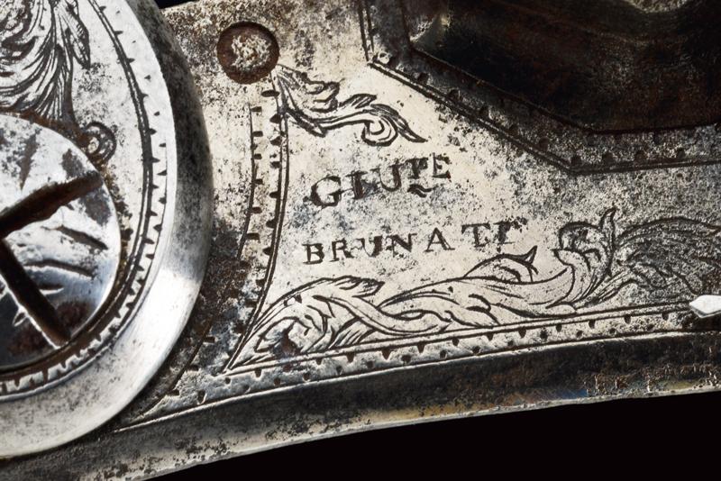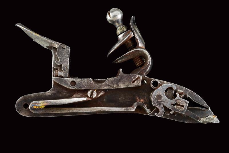 Interessante batteria a pietra alla moderna firmata Brunati, con sicura, datazione: provenienza: Italia settentrionale, Cartella piatta a bordi scantonati, con codetta ribassata recante incisione a trofei. Al centro cornici e fiorami che circondano la firma 'GIU.PE BRUNATI' (Giuseppe Brunati?). Qualche intaccatura. Anche il cane con cornicette e fiorami. La martellina con interessante sistema di sicura a rotazione laterale. Non comune. Barbiroli riporta alcuni Brunati, armaioli milanesi, di varie epoche, ma nessuno con il nome di Giuseppe. Vedi 'Repertorio Storico degli Archibugiari Italiani', pag. 139. lunghezza 15,5 cm.