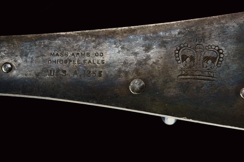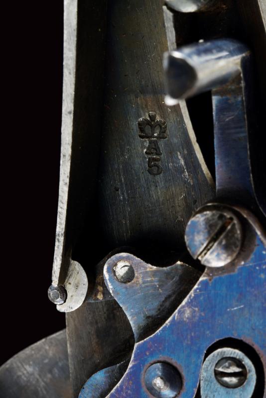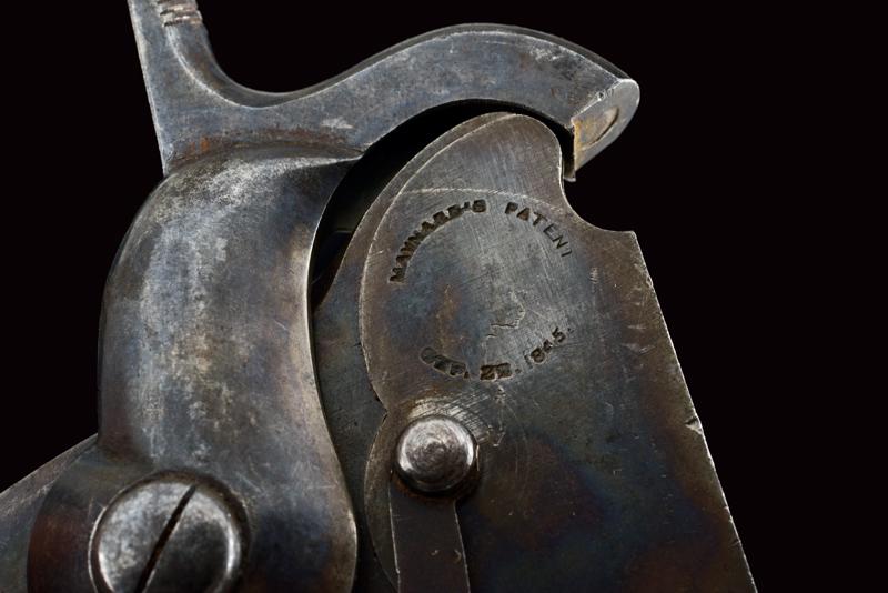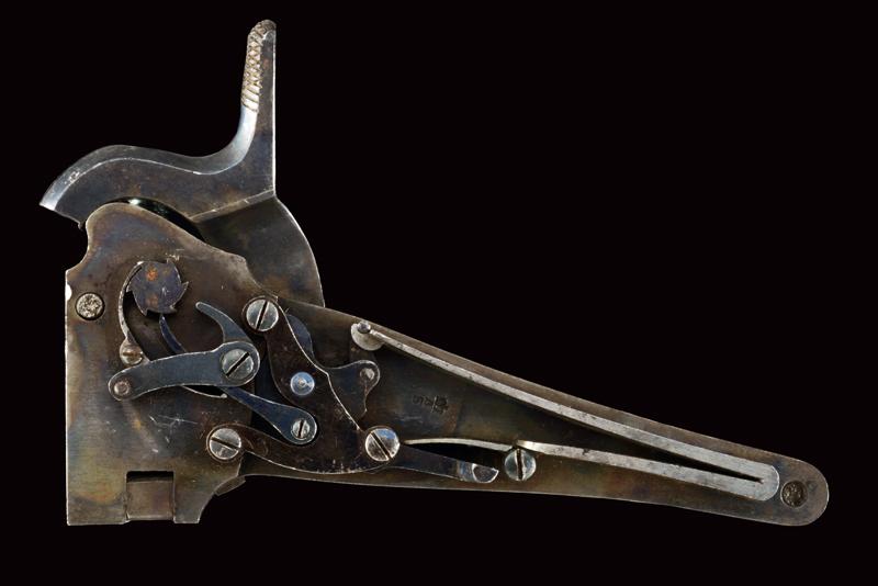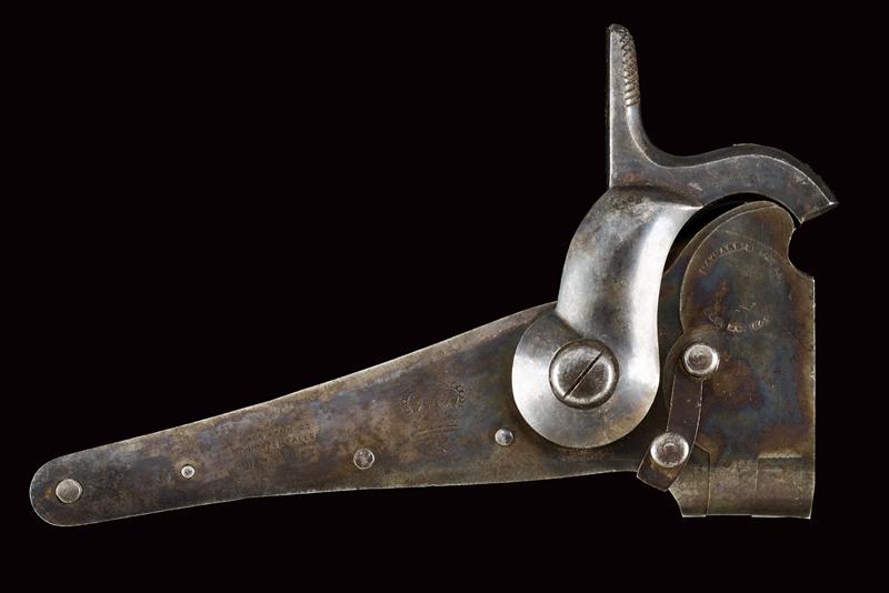 Batteria per fucile con sistema Maynard, datazione: Metà del XIX Secolo provenienza: Regno Unito, In ferro, con meccanica funzionante. Il blocco anteriore marcato 'MYANARD'S PATENT' e con brevetto del 1845. La cartella con corona britannica sormontante 'VxR' e con marcatura del produttore statunitense Mass. Arms. Punzone britannico sul retro. Alcune componenti interne conservano parte della brunitura. lunghezza 13,7 cm.