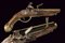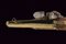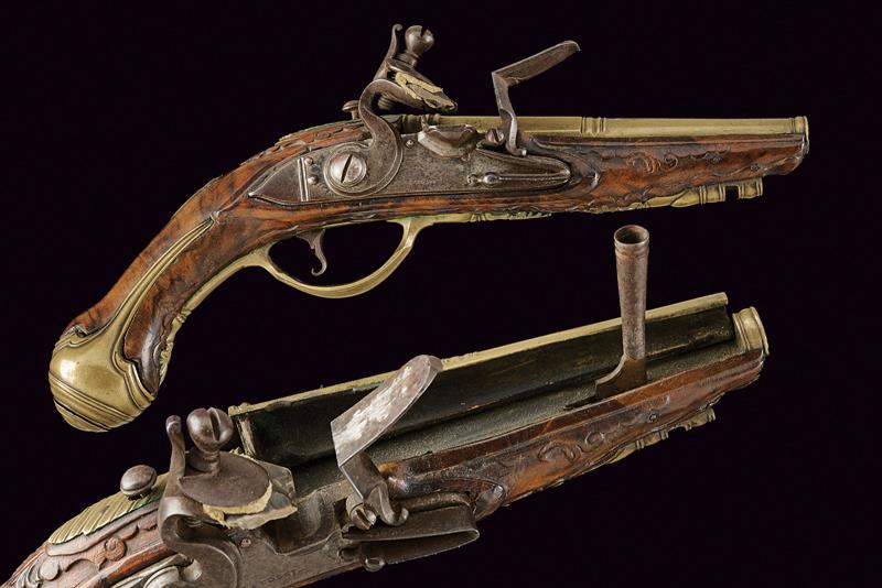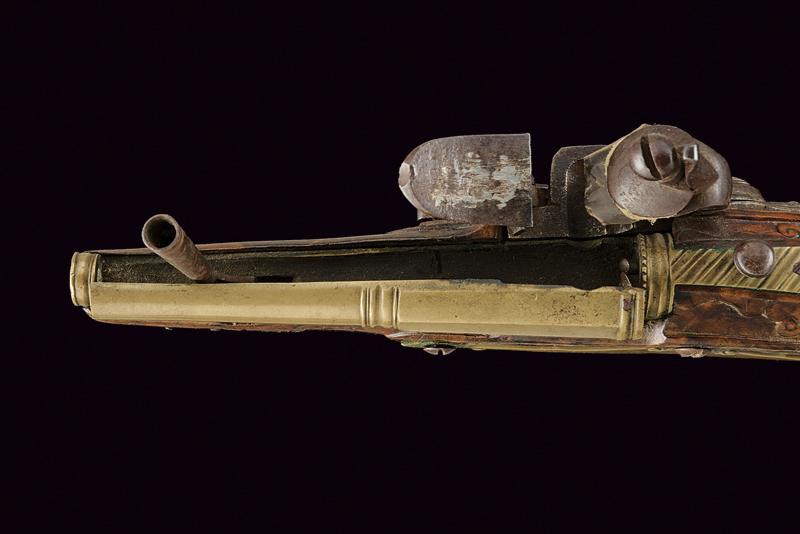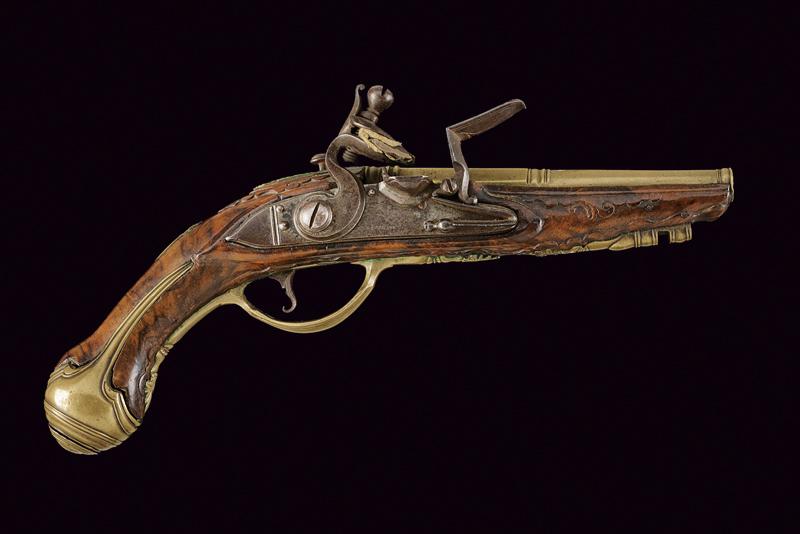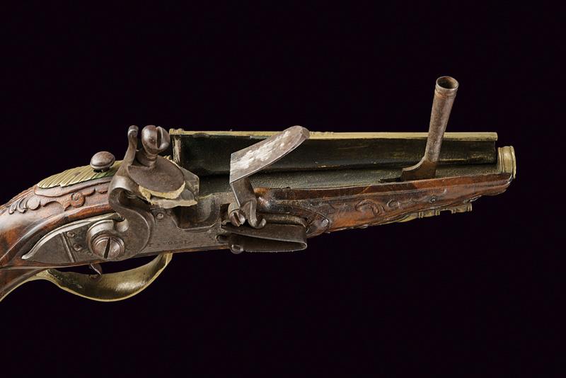 Bell'accendiesca a pietra focaia a forma di pistola, datazione: fine del XVIII Sec. provenienza: Brescia, Canna in bronzo a due ordini, codetta decorata a scanalature oblique e munito di bottone per l'apertura. Batteria in ferro firmata 'F. COGGI'. Cassa intera in legno scolpito a motivi floreali con fornimenti in ottone. Bacchetta mancante. Molto raro. lunghezza 23 cm.