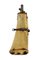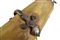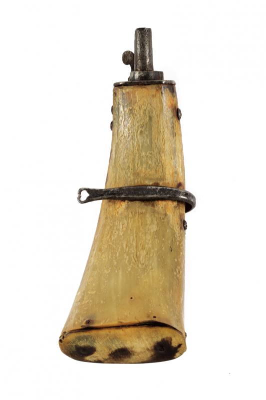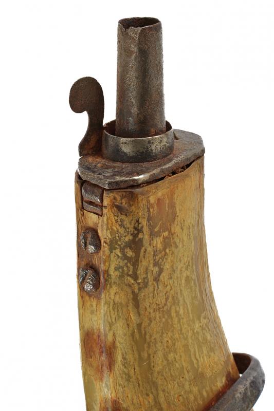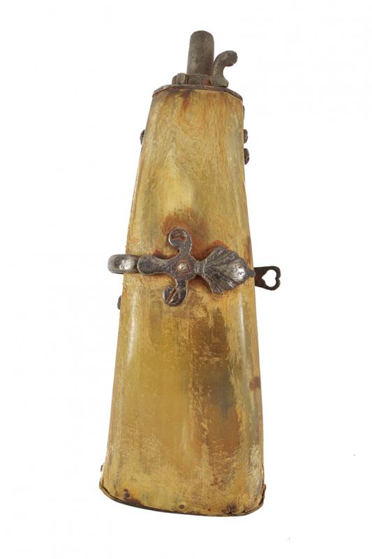 Fiasca da polvere in corno, datazione: fine del XVII Sec. provenienza: Spagna, Corpo in corno di vacca, pressato e incurvato, di taglia media. Fornimenti in ferro. Gancio in ferro con base intagliata a foglia e fissata al corpo con due viti. Il gancio stesso con traforo a cuore. Il cannello in ferro (la molla bloccata) di forma troncoconica. Anche il fondo in corno di vacca. lunghezza 28,5 cm.