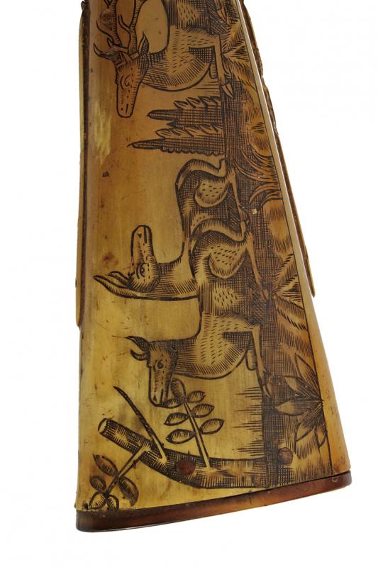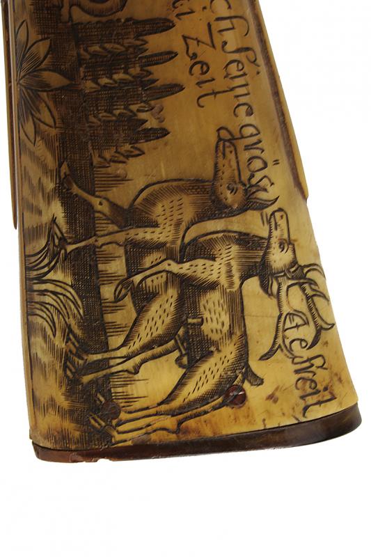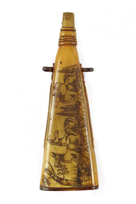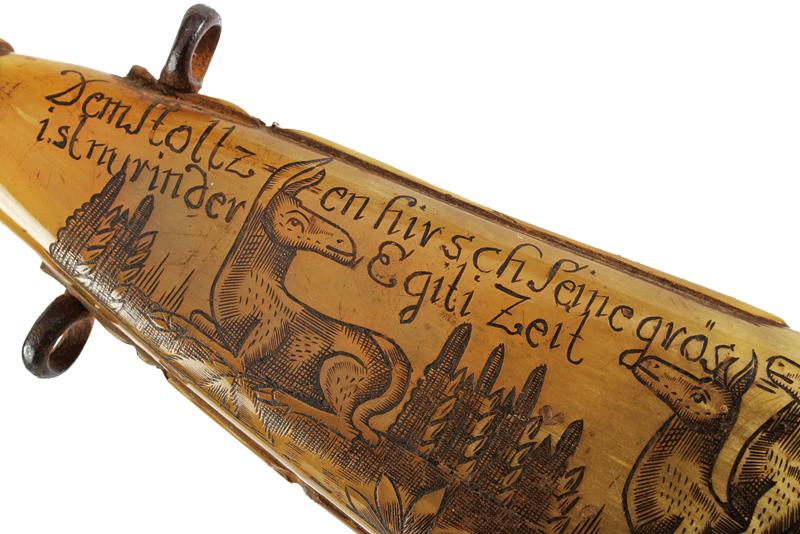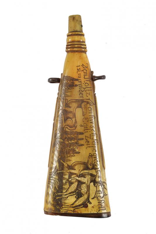Interessante fiasca da polvere incisa e con iscrizioni, datazione: Prima metà del XVIII Secolo provenienza: Germania, Il corpo in corno pressato, di forma triangolare, il cannello intagliato ad anellature. Un lato reca effige di una cerbiatta e un cervo nell'atto dell'accoppiamento, l'iscrizione che la sormonta 'iscrizione fa riferimento a Sant'Egidio che, secondo una nota leggenda di origine medievale, si nutrì del latte di una cerva inviata dal Signore. Sul retro un'altra scena di bucolica con effige di cervi. Sui fianchi due campanelle in ferro. Il fondo sempre in corno. lunghezza 20,3 cm.