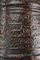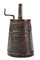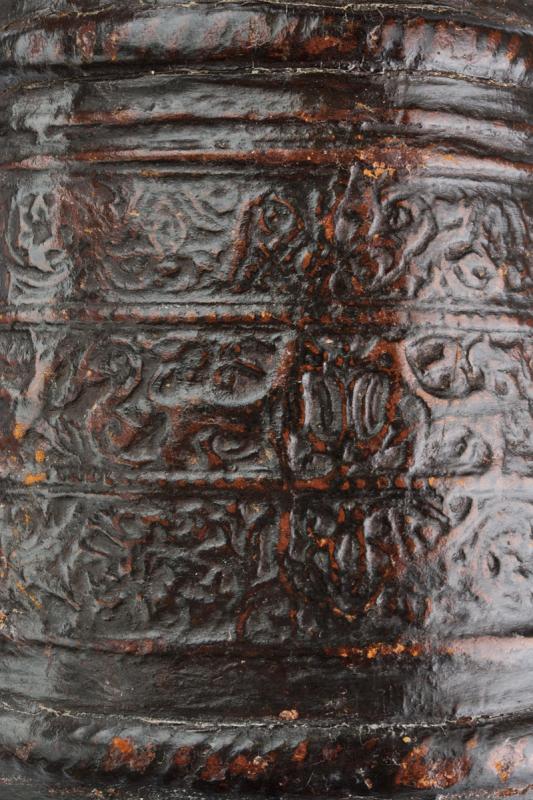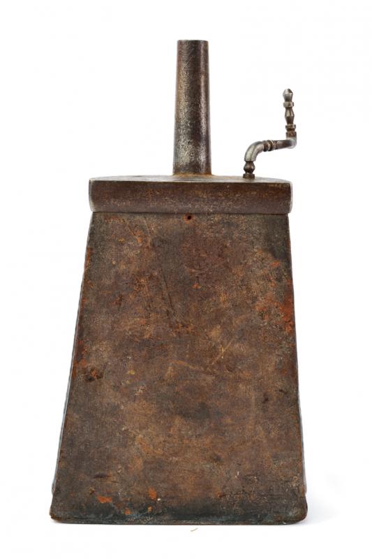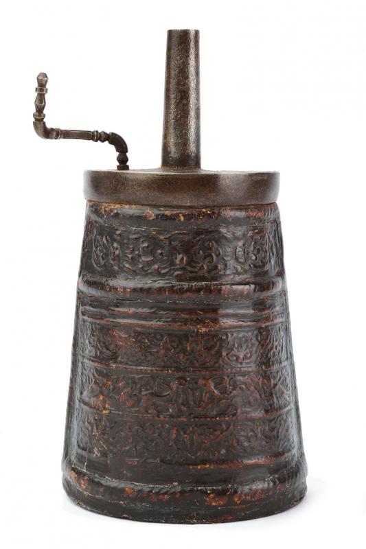 Elegante fiasca da polvere decorata in rilievo, datazione: XVII/XIX Secolo provenienza: Italia del Nord, Corpo in ferro, convesso sul lato anteriore, piatto sul retro, di forma rastremata verso l'alto. Tutta la superficie del serbatoio rivestita di cuoio bruno finemente ornato sul lato anteriore con impressioni rilievate effigianti mascheroni, racemi ed animali riprodotti specularmente sui due lati. Il coperchio superiore sempre in ferro. La leva di chiusura girevole ma non funzionante, lavorata a nodi e di forma controcurvata. Il cannello di forma troncoconica. Un originale del '600 o una bellissima copia ottocentesca? altezza 21 cm.