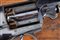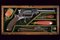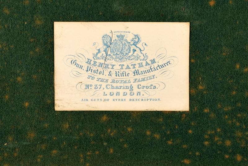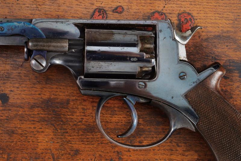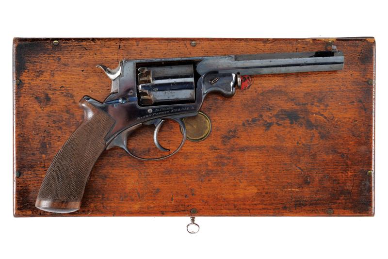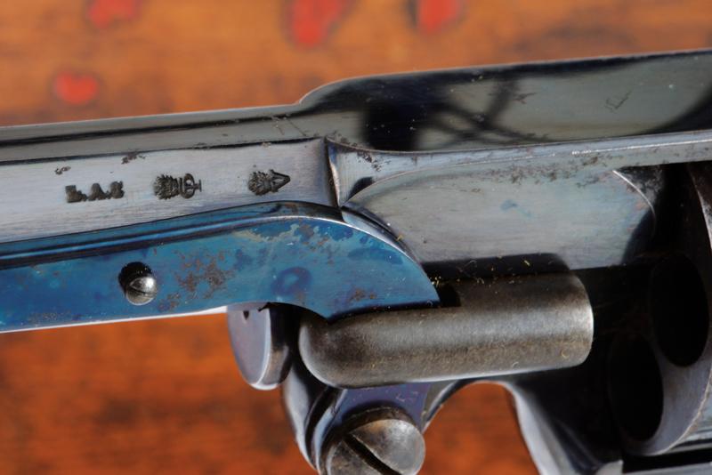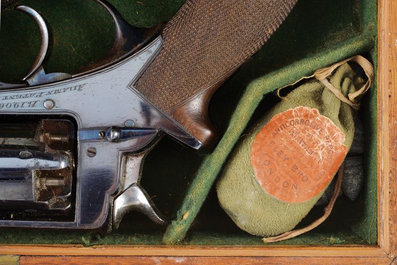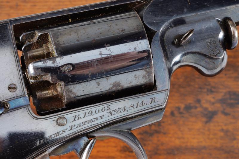 Raro revolver Adams a luminello, datazione: 1855 circa provenienza: Londra, Canna ottagonale, rigata, con alzo e mirino, cal. 11 mm; tamburo liscio a cinque colpi con punzoni del banco di prova di Londra. Castello delineato al bordo, marcato 'ADAM'S PATENT No. 3504' e con marca 'LAC' sotto corona entro uno scudetto. Sicura. Bellissima brunitura originale, al 95 %. Calcio in legno zigrinato, coccia in ferro. In cassetta di legno foderata in panno verde all'interno e recante etichetta di Henry Tatham a Londra, dotata di diversi assessori. lunghezza 31.5 cm.