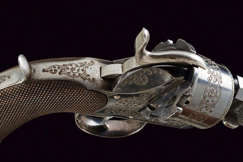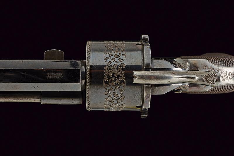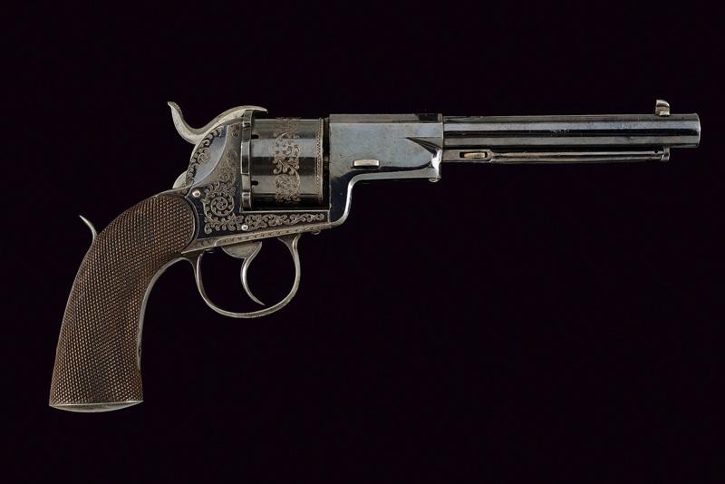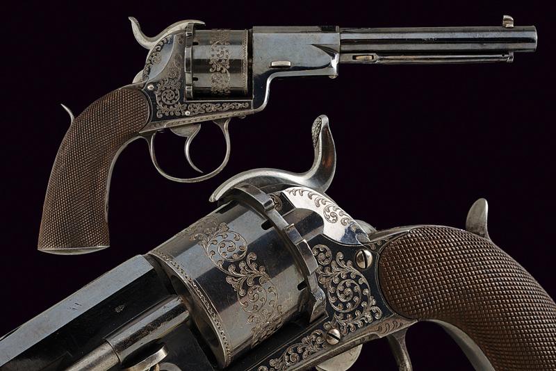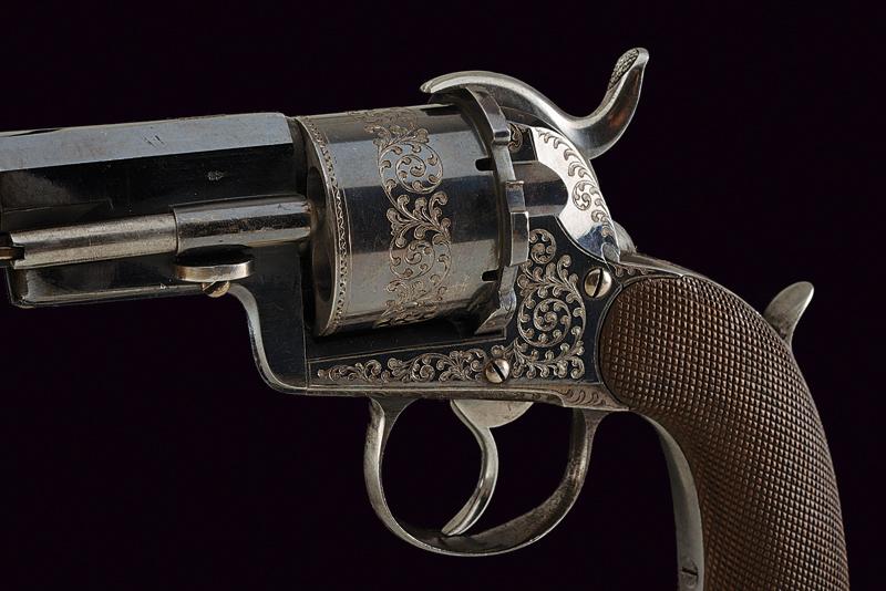 Raro e interessante revolver Pliers a spillo, datazione: Terzo quarto del XIX Secolo provenienza: Belgio, Canna tonda rigata (anima pulita, rigatura ben visibile), dotata di mirino, marcata al dorso 'A. PLIERS BREVETE', punzone 'V' coronato, cal. 11 mm. Tamburo a sei colpi recante cornice a racemi incisa. Meccanica ben funzionante, sia in singola che in doppia azione. Castello inciso en suite a racemi. Interessante meccanica con ghiera rotante dietro al tamburo: per ricaricare l'arma è necessario allineare correttamente la ghiera, è quindi possibile estrarne un segmento e così rimuovere i bossoli usati tramite l'estrattore (con fermo mancante) e caricarne di nuovi. Brunitura originale al 95%. Metalli molto ben conservati. Impugnatura zigrinata in legno, munita di linguetta di presa al dorso. Ponticello e impugnatura incisi en suite. lunghezza 30,5 cm.