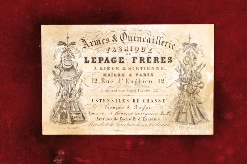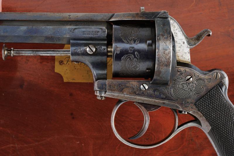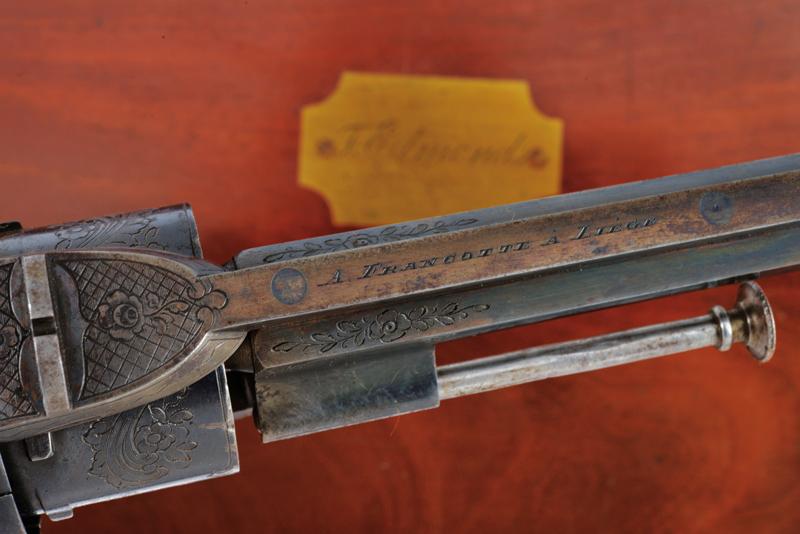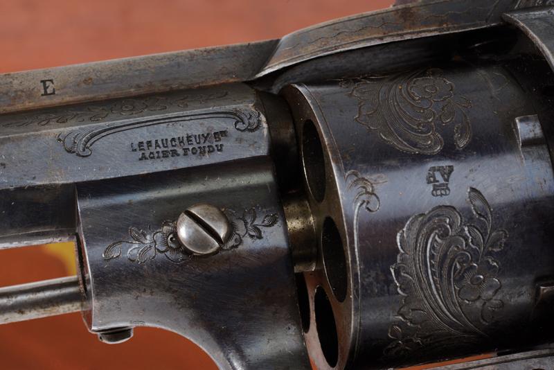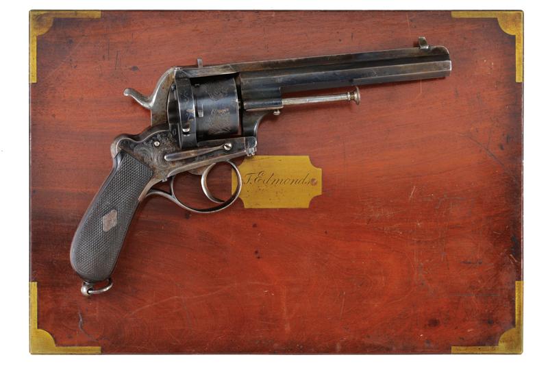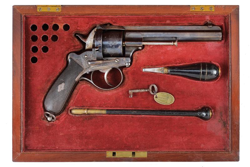 Bel revolver Lefaucheux a spillo in cassetta, datazione: 1870 circa provenienza: Liegi, Canna ottagonale, rigata, con bindella alta marcata 'A FRANCOTTE A LIEGI' e mirino, lateralmente marcata 'LEFAAUCHEUX BREVETE ACIER FONDU', 'E' e con incisioni floreali, cal. 11 mm; tamburo liscio a sei colpi inciso a motivi floreali e con punzone 'AF' sotto corona. Castello finemente inciso a motivi floreali con matricola '265xxx'. Guancette in legno zigrinato. Anello di sospensione. In cassetta di legno con targa in ottone 'F. Edmonds', foderata di velluto rosso (parzialmente liso) con due attrezzi e etichetta di LEPAGE FRERES a Parigi. lunghezza 30 cm.