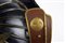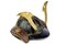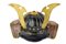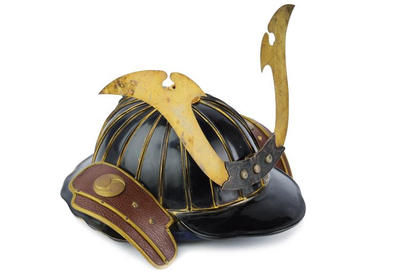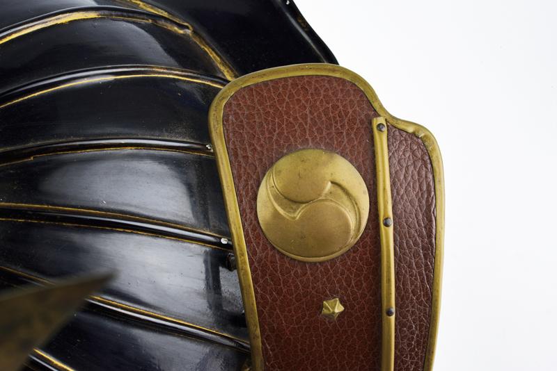 Raro kabuto per samurai con funzione di capo pompiere, datazione: Periodo Edo (1603-1867) provenienza: Giappone, Hachi in leggera lamiera laccata color nero e decorata a nervature, tehen-kanamono in metallo dorato, mabizaashi e shikoro lavorati en suite, bei fukigaeshi in ottone foderati di pelle color marrone e recanti Tomoe-mon. Maedate in ottone. Foderato all'interno di tessuto policromo. In tempi di pace ai samurai era anche assegnato, fra gli altri compiti, quello di prevenire e domare gli incendi, che ovviamente erano una grave minaccia per i centri abitati. altezza 24 cm.