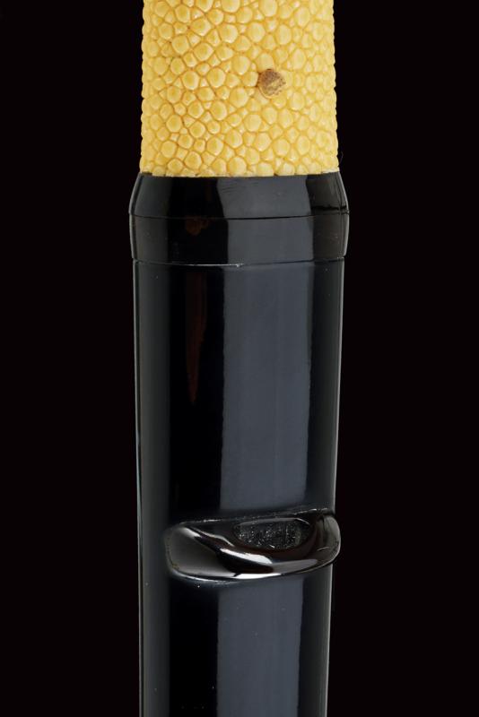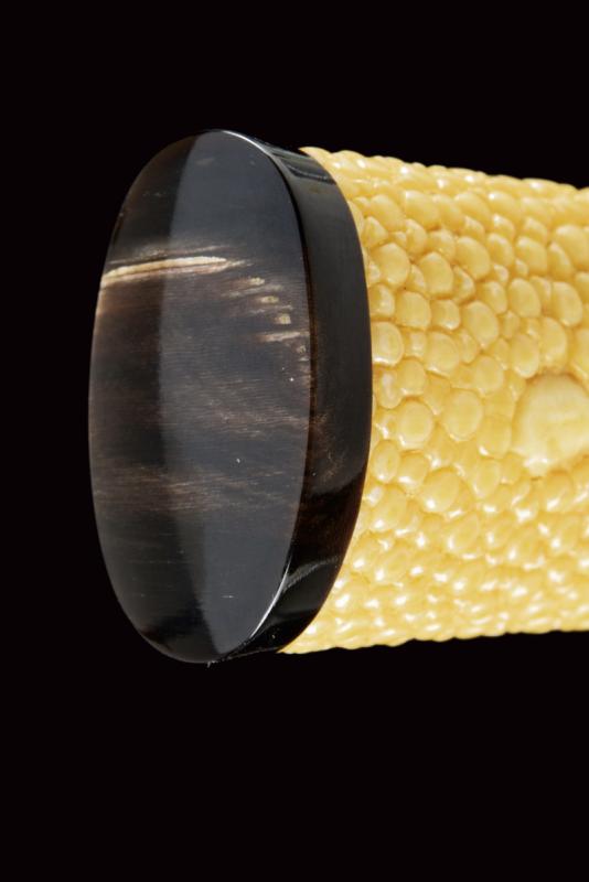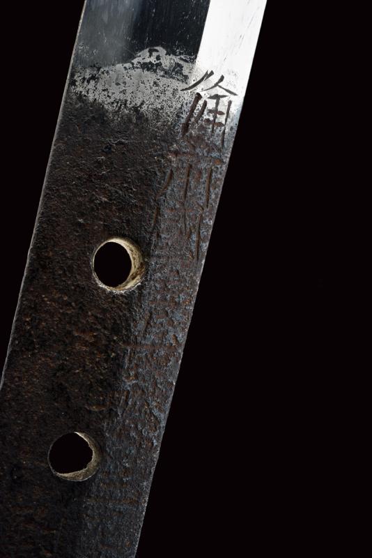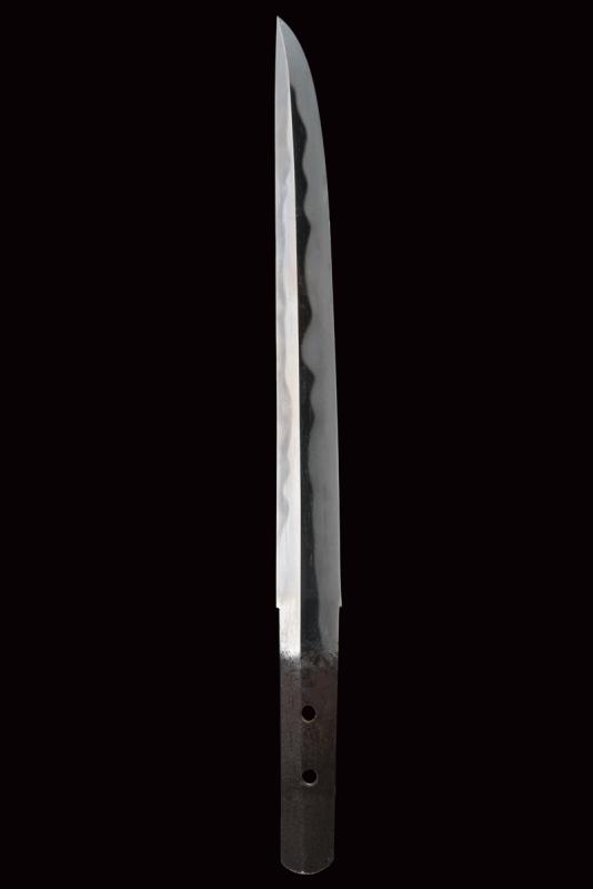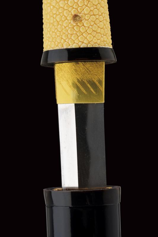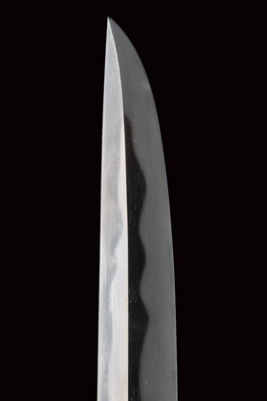 Bel tanto in koshirae, mei Osafune Yosozaemonjo Sukesada, datazione: 1600 circa provenienza: Giappone, Lama moroha zukuri (nagasa 21 cm.), notare hamon, jizo boshi, ubu nakago kuri-jiri con due mekugi-ana, mei 'Bizen no kuni ju Osafune Yosozaemonjo Sukesada' e data 'un giorno fortunato dell'undicesimo mese dell'era Tenbun (1552-1554)', habaki in rame dorato, shirasaya e koshirae moderni. Notevole opera di scuola Bizen, la più famosa e apprezzata nel Giappone medievale. Fotografato e descritto in ' Kimono e Samurai. Il Gesto. L' Eleganza. Lo Spirito', Alessandro Schiavetti, Bandecchi & Vivaldi Editore. Catalogo della Mostra, 2013, Roma, pag. 31, illustrato. lunghezza 34,5 cm.