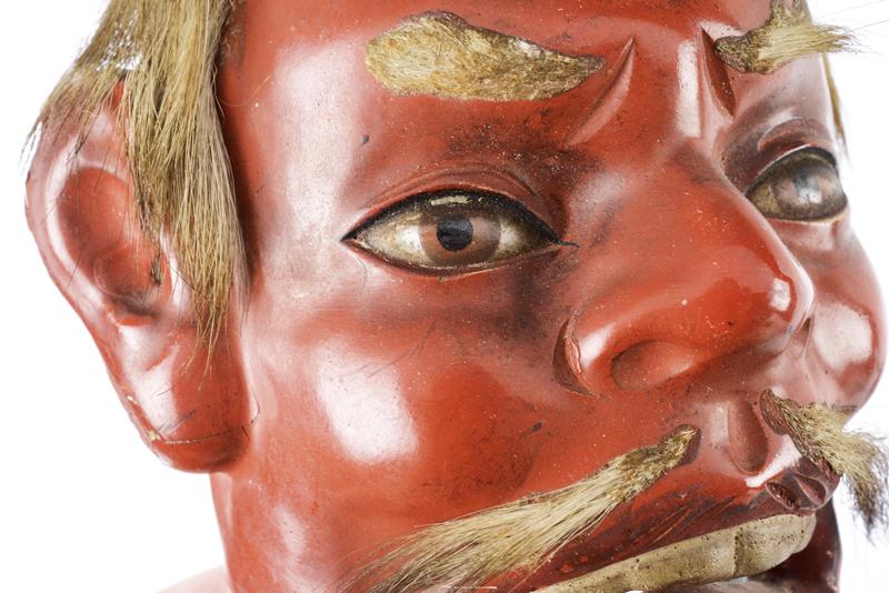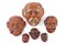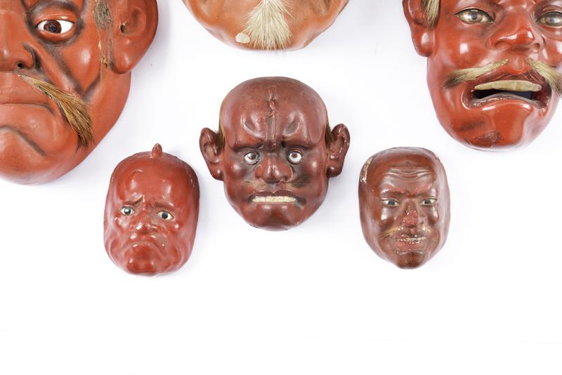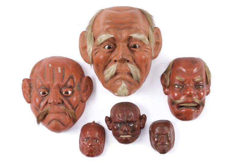 Lotto di sei maschere, datazione: XIX/XX secolo provenienza: Giappone, Stuccato, laccato e dipinto in policromia, lavorata in rilievo ad effigiare un volto, con occhi, naso e bocca, parzialmente decorati con peli; piccole mancanze alla lacca. altezza 6.1 - 16.4 cm.