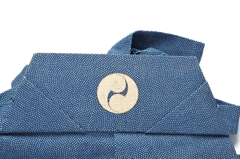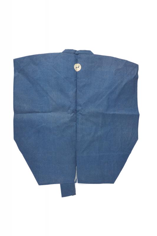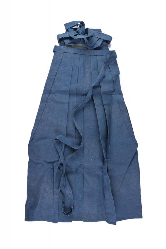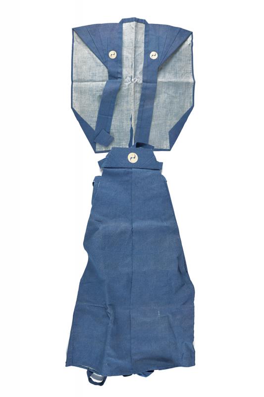 Bel kamishimo, datazione: XIX Secolo provenienza: Giappone, In due parti color celeste granulato bianco con mon bianco a forma 'Yin e yang' senza occhi. Mai usato. altezza 68 - 84 cm.