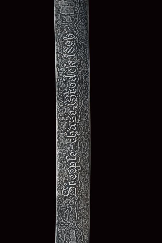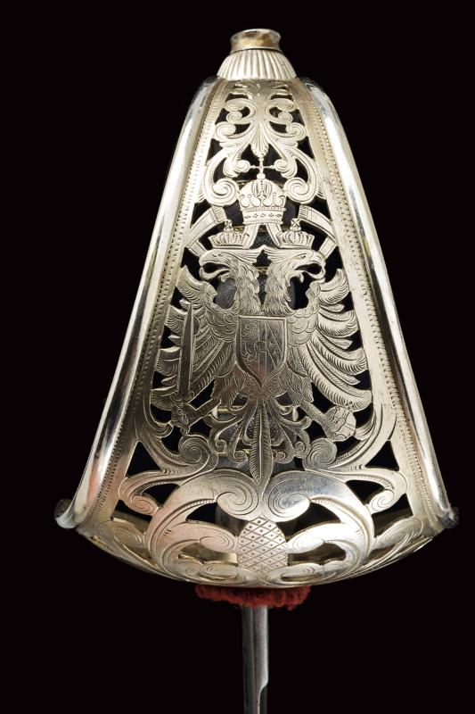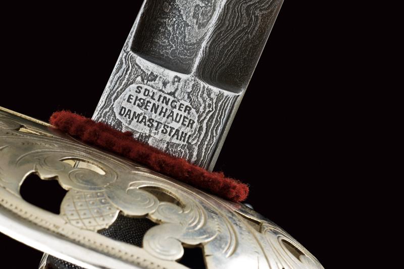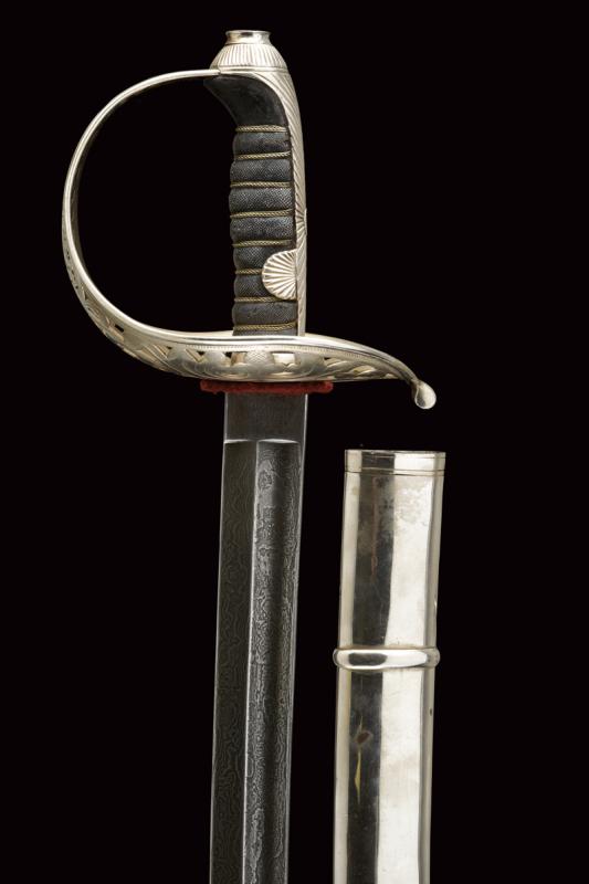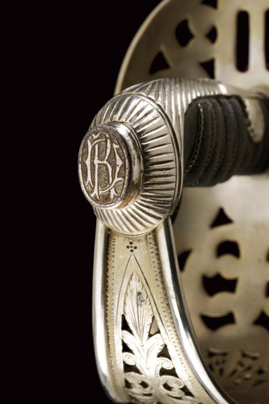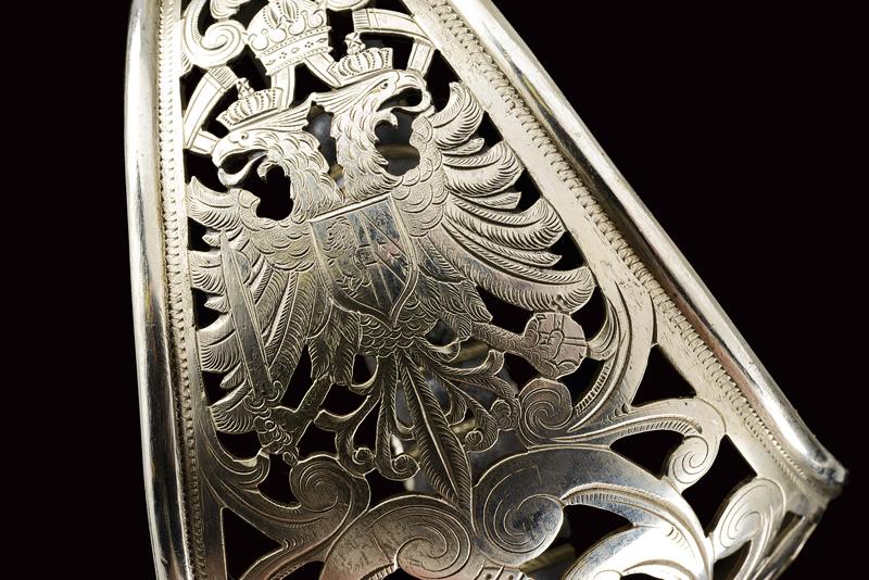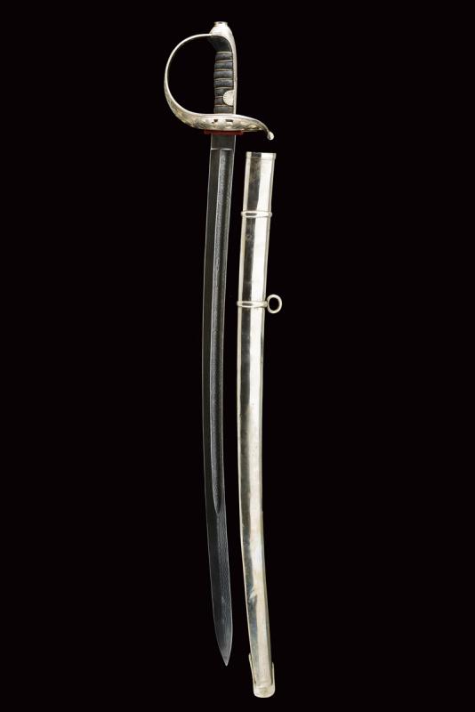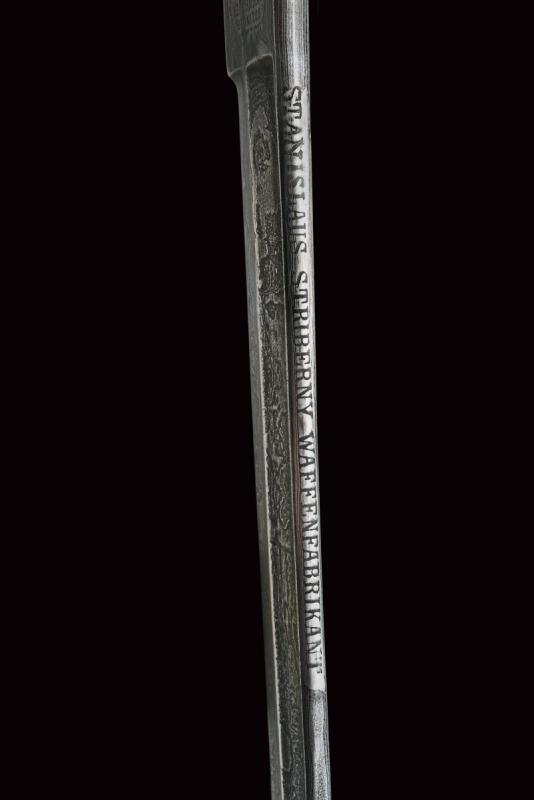 Sciabola Mod. 1869 da ufficiale di cavalleria della Legione Polacca, datazione: Fine del XIX Secolo provenienza: Impero austro-ungarico, Bella lama curva a un filo, punta e breve controfilo, sgusciata per due terzi su su una sola faccia, con elegante finitura in damasco. Recante al tallone sul lato di terza la marcatura 'SOLINGEN EISENHAUER DAMASTSTHAL'. Al dorso la firma 'STANISLAUS STRIBERNY WAFFENFABRIKANT'. Sul lato di quarta l'iscrizione 'Steeple-chase Grodek 1896'. Fornimento in ferro con nichelatura. Ampia guardia a vela riccamente traforata e incisa, recante l'aquila bicipite coronata caricata con emblema araldico sul petto. La cappetta lunga, con fine decoro a raggi scanalati che si irradiano da un bottoncino centrale. Il bottone dorsale con monogramma 'DR'. Anche il fodero con nichelatura ben conservata, dotato di una singola campanella fissa e un passante. Rara. lunghezza 99 cm.