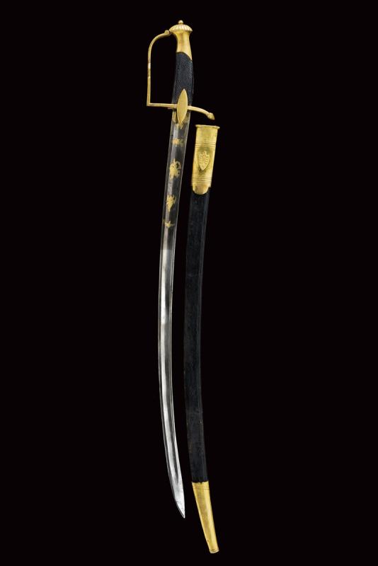 Sciabola da ufficiale dei volteggiatori o granatieri dei reggimenti di fanteria di linea, datazione: 1910 circa provenienza: Francia, Lama curva a un filo e controfilo con ampio sguscio centrale e scanalatura dorsale, la prima parte incisa e dorata su fondo blu a trofei e motivi floreali. Fornimento monoelso in ottone dorato con alette fermafodero, pomo scanalato ed impugnatura in legno zigrinato (piccola crepa nella parte posteriore). Fodero in cuoio con fornimento dorati, il gancio decorato a motivi floreali in bassorilievo. lunghezza 82.5 cm.