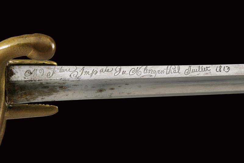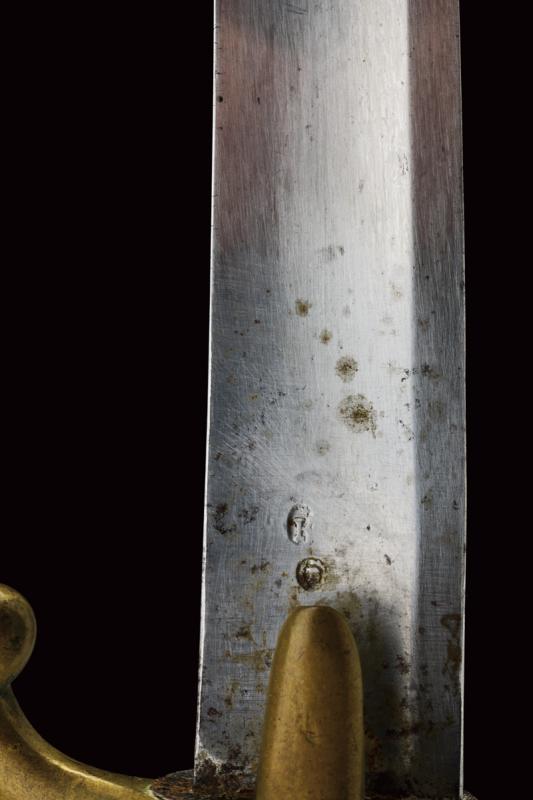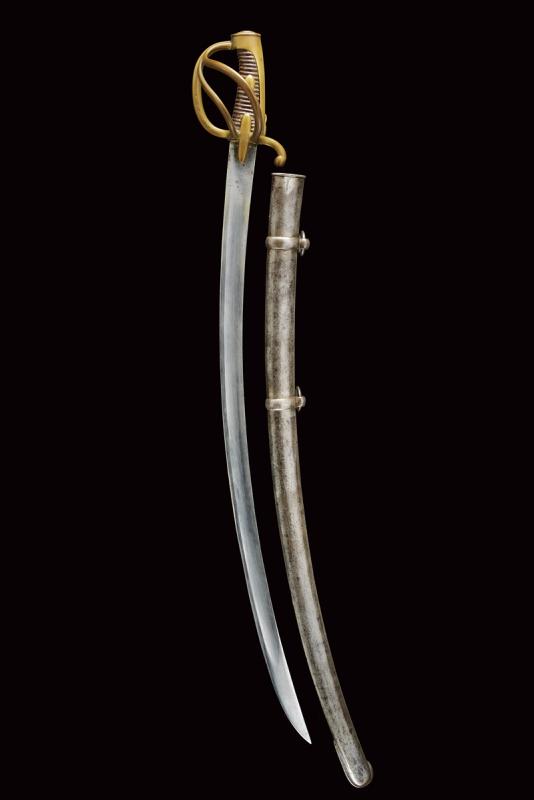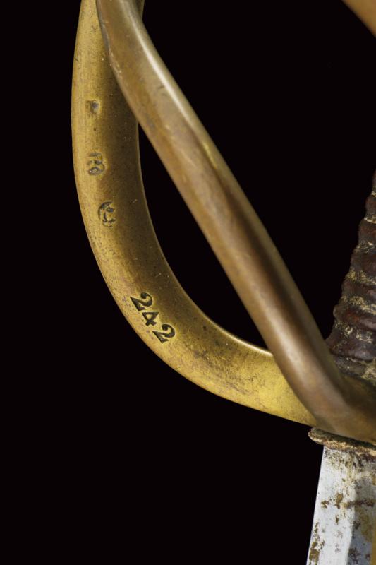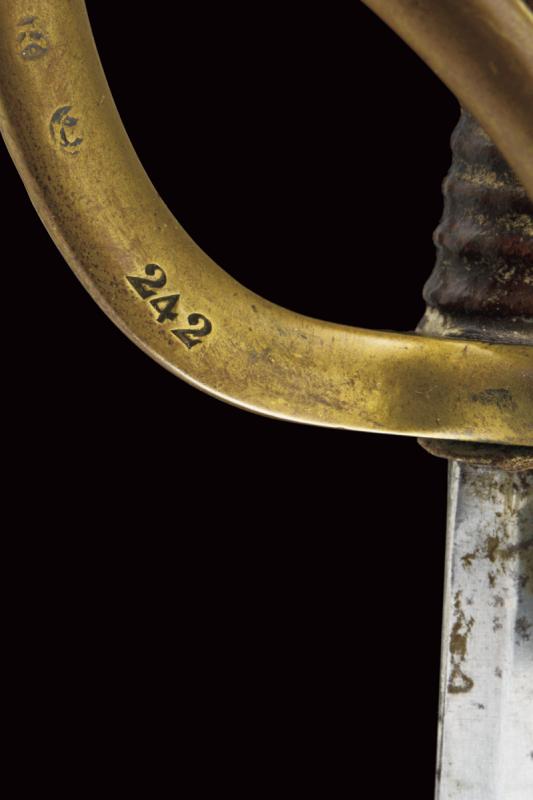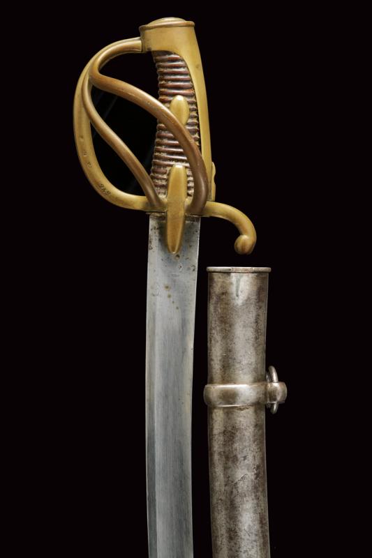 Sciabola per truppa dei cacciatori a cavallo modello AN XI, datazione: 1813 provenienza: Klingenthal, Lama curva a un filo e controfilo con ampio sguscio centrale e tallone, al forte punzoni 'K' sotto stella 'B' entro allori e 'L', il dorso con firma 'Mf.ure Imp.ale du Klingenthal, Juliet 1813'. Tipico fornimento in ottone con alette fermafodero e tre rami di guardia, cappetta lunga e vari punzoni tra i quali'K', 'B' entro allori e il numero '242'. Impugnatura rivestita di cuoio senza trecciola. Completa di fodero in ferro a due anelli di sospensione (manca la piccola vite dell'imboccatura). lunghezza 101.5 cm.
