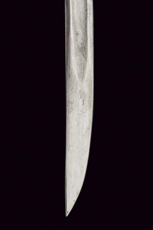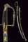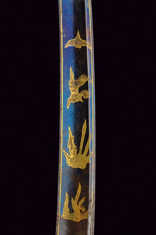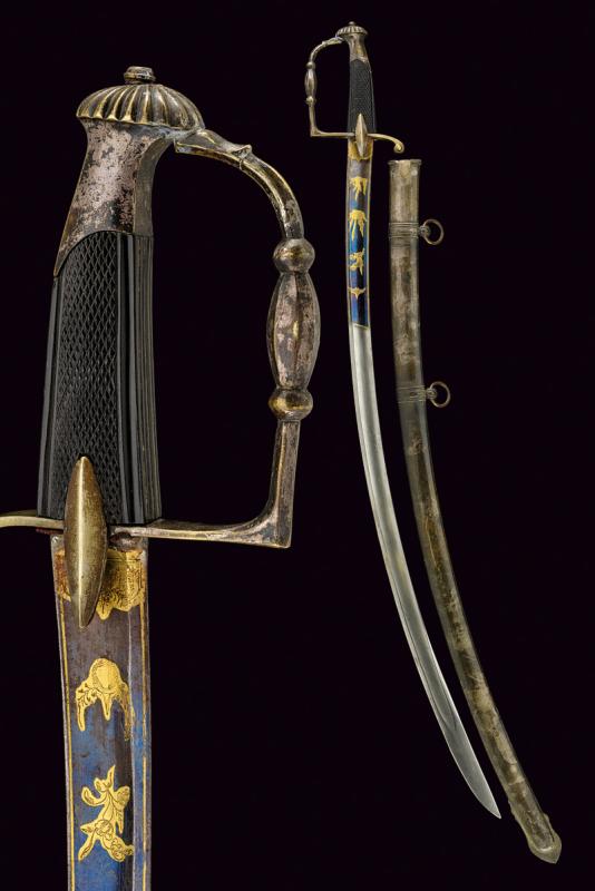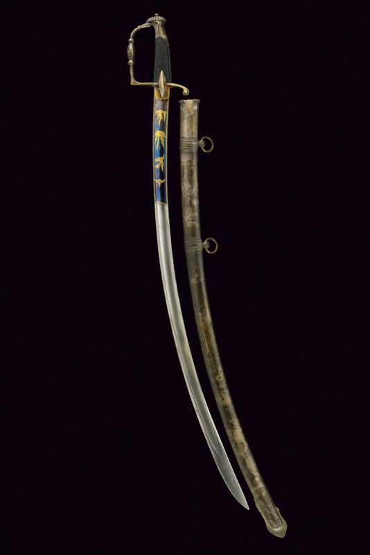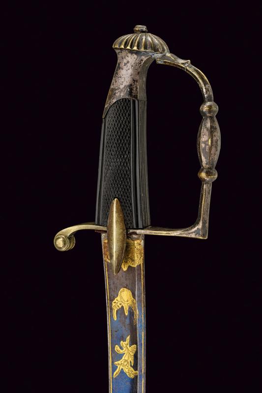 Sciabola da ufficiale di fanteria, datazione: primo quarto del XIX Sec. provenienza: Francia, Lama curva a un filo e controfilo con ampio sguscio centrale, incisa e dorata su fondo blu a trofei e motivi floreali nella parte iniziale; fornimento monoelso in bronzo con resti di argentatura, alette fermafodero, pomo scanalato ed impugnatura in ebano zigrinato e scanalato, la guardia recante un piccolo restauro di un segmento spezzato; fodero in bronzo con resti di argentatura. Due anelli di sospensione. lunghezza 99 cm.