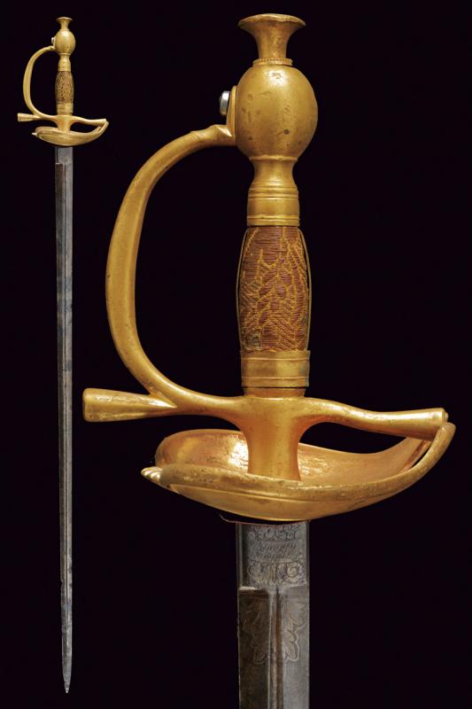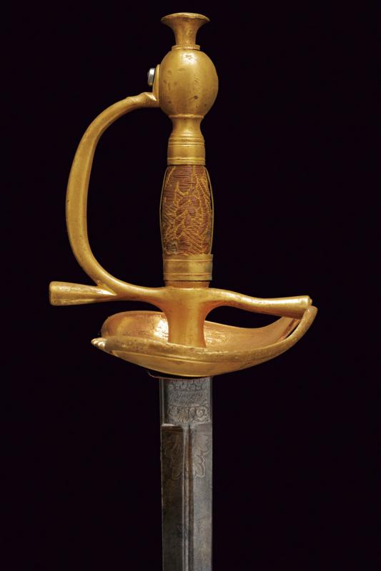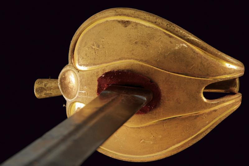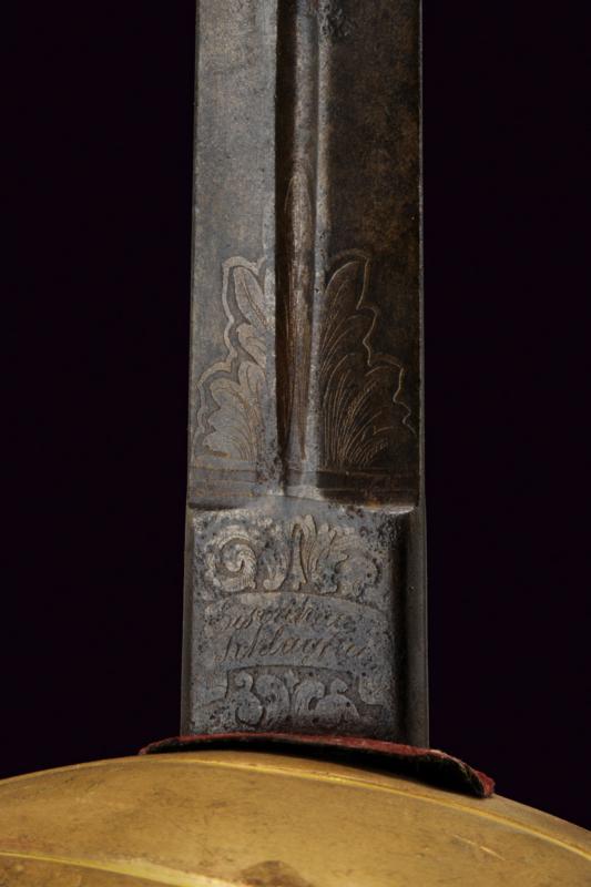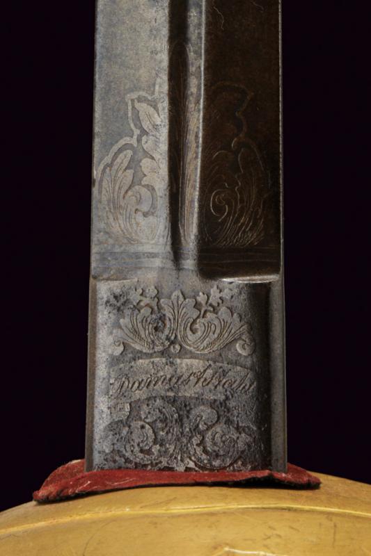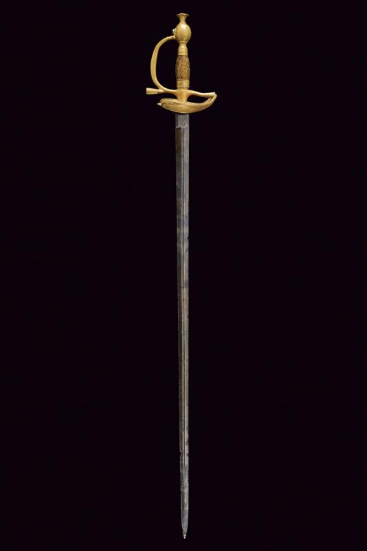 Spada da ufficiale, datazione: Prima metà del XIX Secolo provenienza: Germania, Lama dritta a due fili con scanalatura centrale, zone con danni da ruggine. Il tallone marcato 'Damast Stahl' e con marcatura di un fabbricante di Solingen. Fornimento in bronzo con resti di doratura, valva a cuore, pomo a prugna con alto bottone. Impugnatura in legno ricoperta con canutiglia e stoffa (raro rivestimento). lunghezza 102.5 cm.