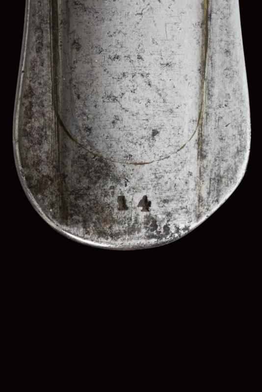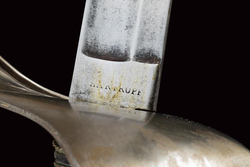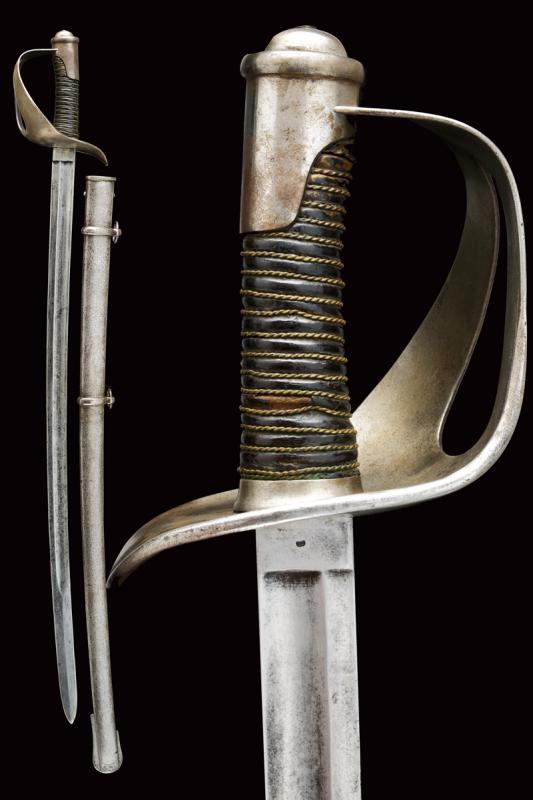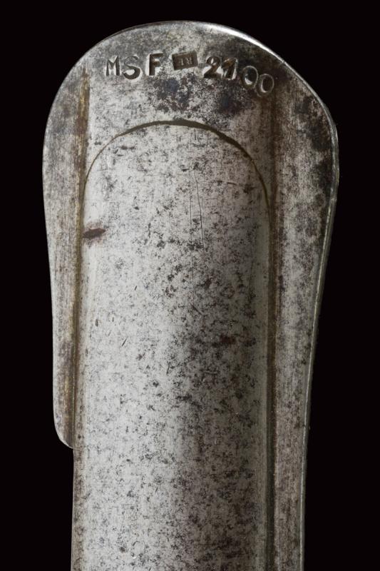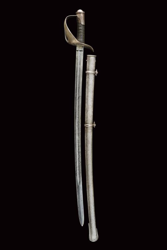 Sciabola da cavalleria Mod. 1860, datazione: Terzo quarto del XIX Secolo provenienza: Regno d'Italia, Lama curva a un filo e controfilo, costolata al debole, sgusciata, con un punzone alla base e su un lato e marcatura 'HARTKOPF' sul tallone. Ampio fornimento in ferro con spacco a goccia con punzone. Impugnatura con rivestimento di cuoio e trecciola in ottone (piccole mancanze), cappetta corta liscia. Fodero in ferro a due anelli di sospensione, la vela marcata ''MSF', con punzone 'RF' e con numero '2100'. lunghezza 104 cm.