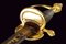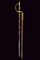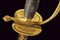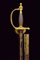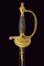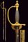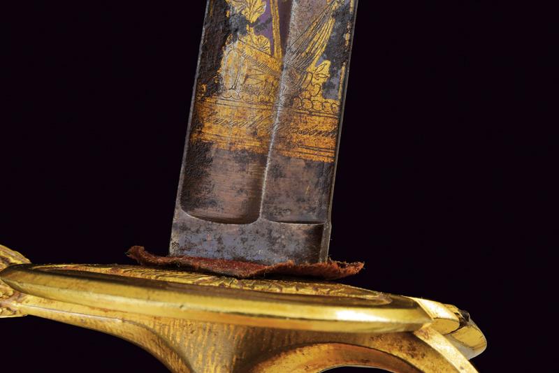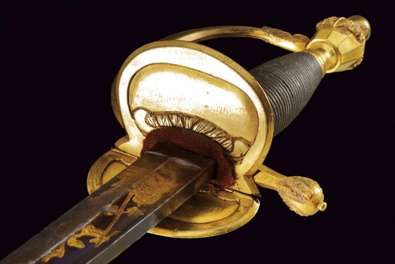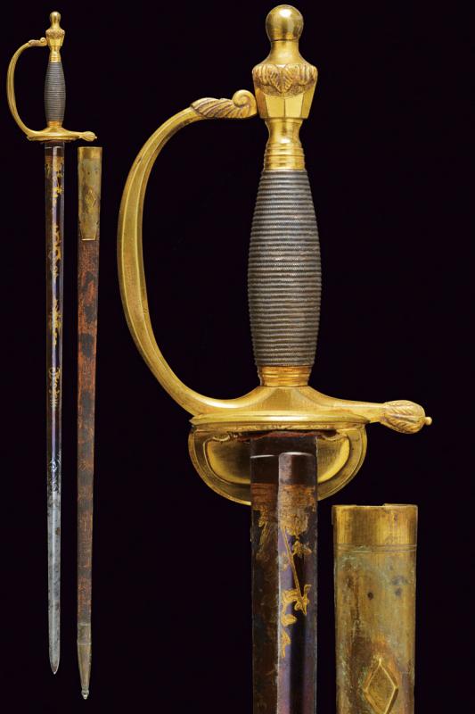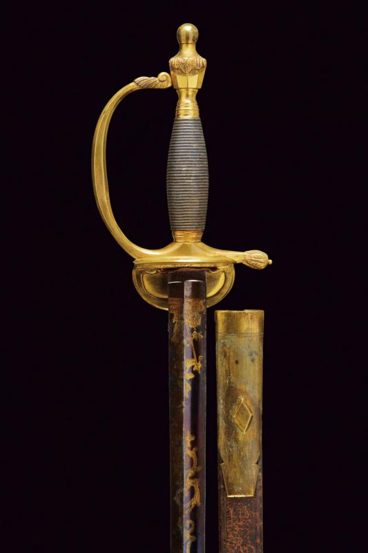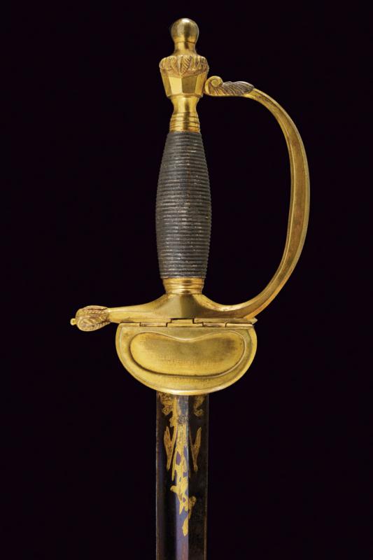 Interessante spada da ufficiale, datazione: Prima metà del XIX Secolo provenienza: Italia, Lama dritta a un filo e breve controfilo con ampio sguscio centrale, oltre la metà inciso e dorato su fondo blu a trofei e motivi floreali. Fornimento in bronzo dorato sul tipo tedesco con doppia valva, quella posteriore pieghevole, pomo faccettato e parzialmente decorato a motivi floreali in altorilievo. Impugnatura in legno rivestito di lamina d'argento lavorata a fingere la trecciola (simile a quella delle Albertine). Fodero in cuoio (segni d'usura) con fornimenti in ottone. lunghezza 96.5 cm.