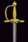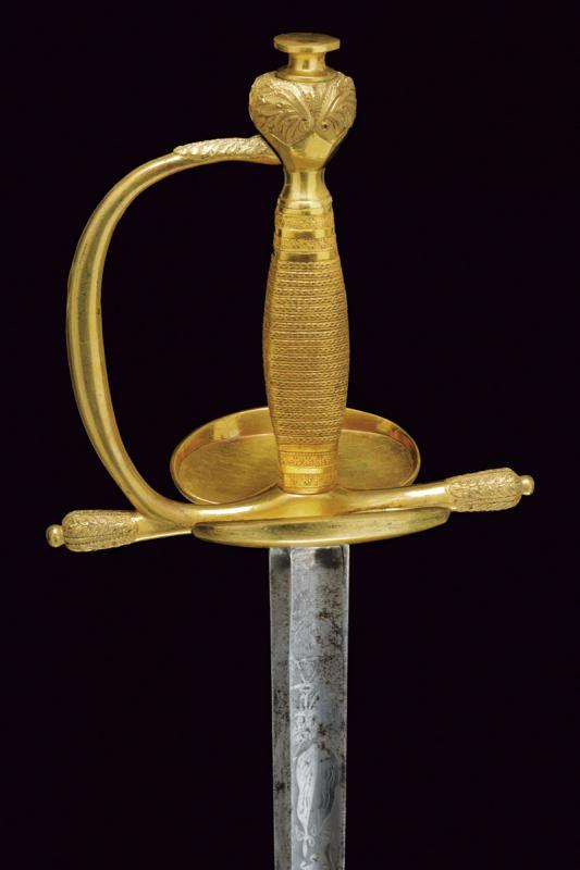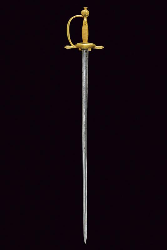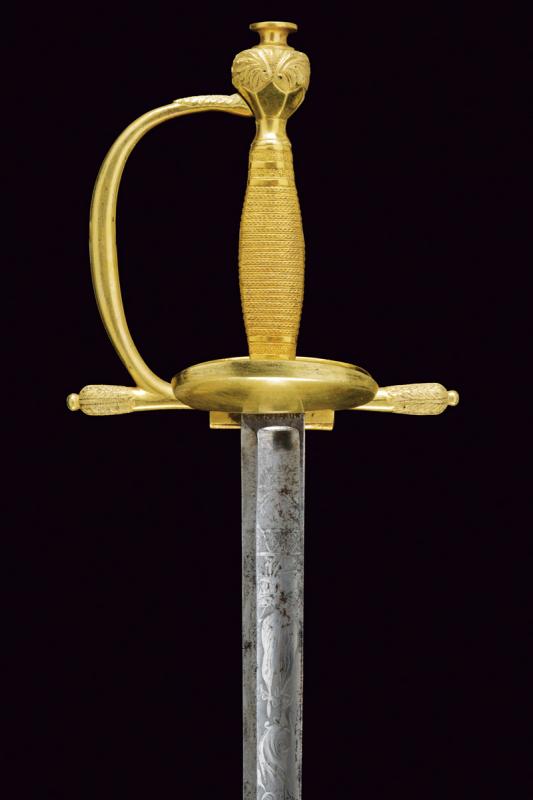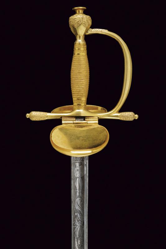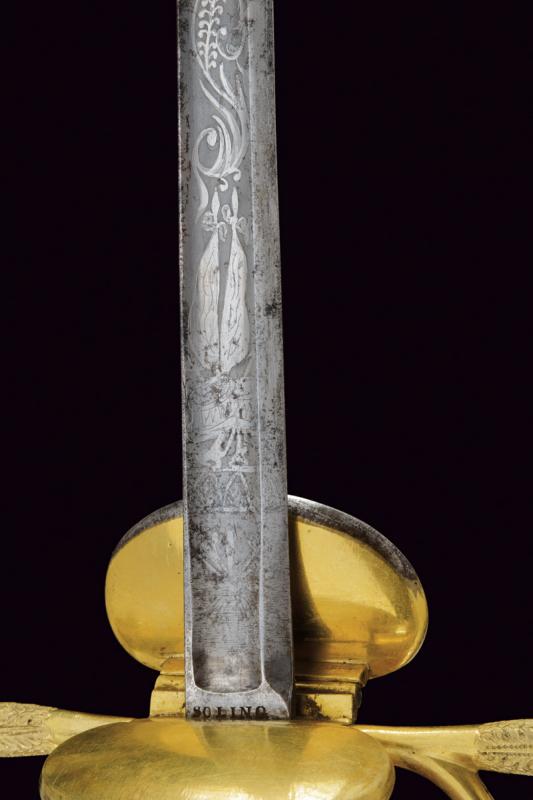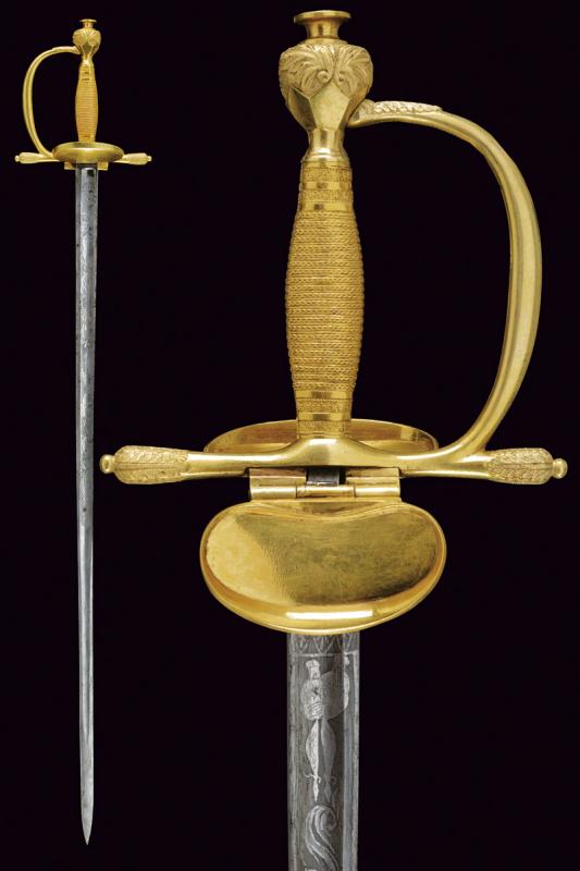Finissima spada da ufficiale, datazione: Prima metà del XIX Secolo provenienza: Italia, Lama a un filo e controfilo con ampio sguscio centrale, la prima parte incisa a trofei e motivi floreali, il tallone marcato 'SOLING' (per Solingen). Fornimento in argento dorato a mercurio con doppia valva liscia con bordo alzato, quella anteriore più piccola di quella posteriore che é pieghevole ed é munito al bordo esterno con una lama in ferro. Le estremità dell'elso e ramo di guardia finemente incisi a motivi floreali. Impugnatura massiccia lavorato a fingere la trecciola, le ghiere con bande incise a fiorame. lunghezza 94.5 cm.