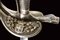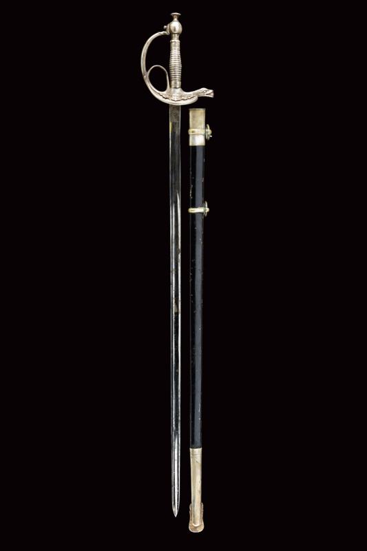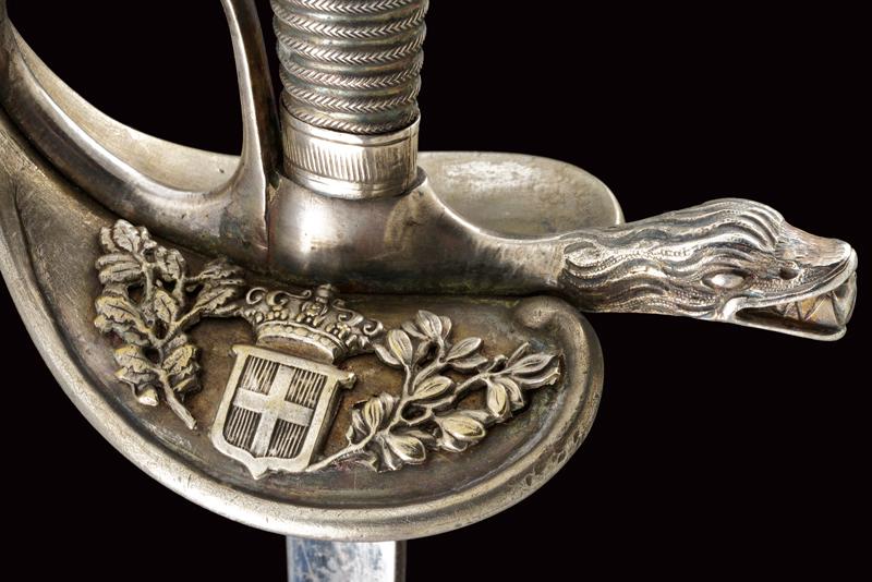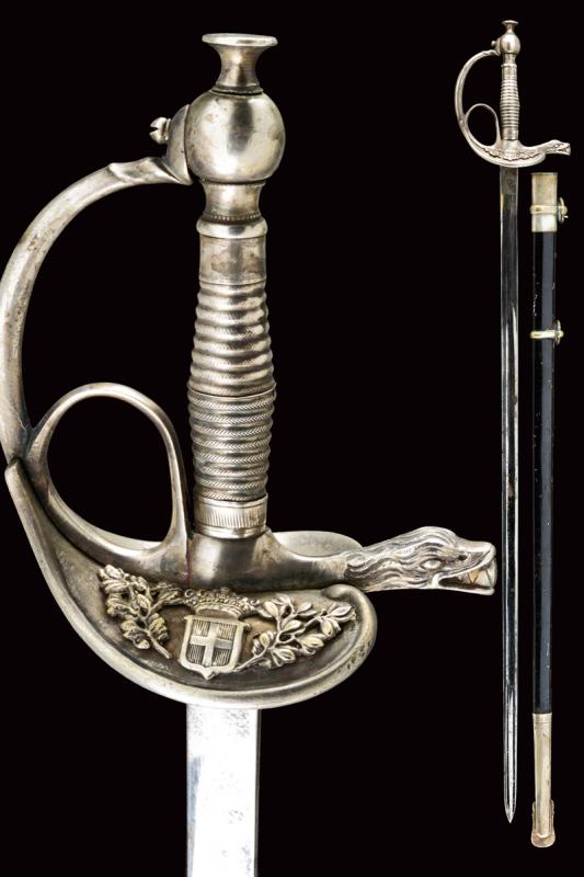 Rara spada Albertina mod. 1833 da ufficiale medico, datazione: Metà del XIX Secolo provenienza: Piemonte, Lama dritta a un filo e controfilo con scanalatura che si raddoppia verso il debole e breve tallone con marca; fornimento in metallo bianco massiccio con ramo dell'elso terminante in serpente, stemma sabaudo sulla pelta, impugnatura ricoperta in lamina d'argento con ghiere incise. Fodero in ferro annerito con fornimenti argentati e due anelli di sospensione. lunghezza 94 cm.