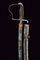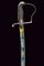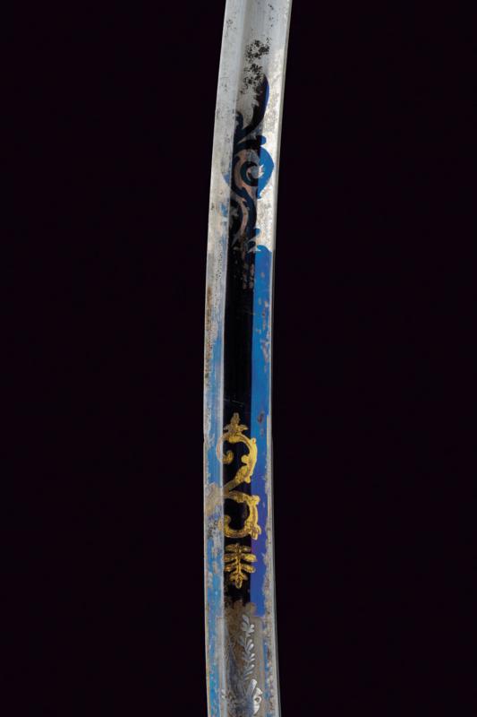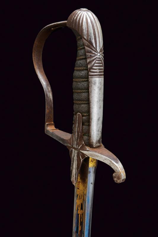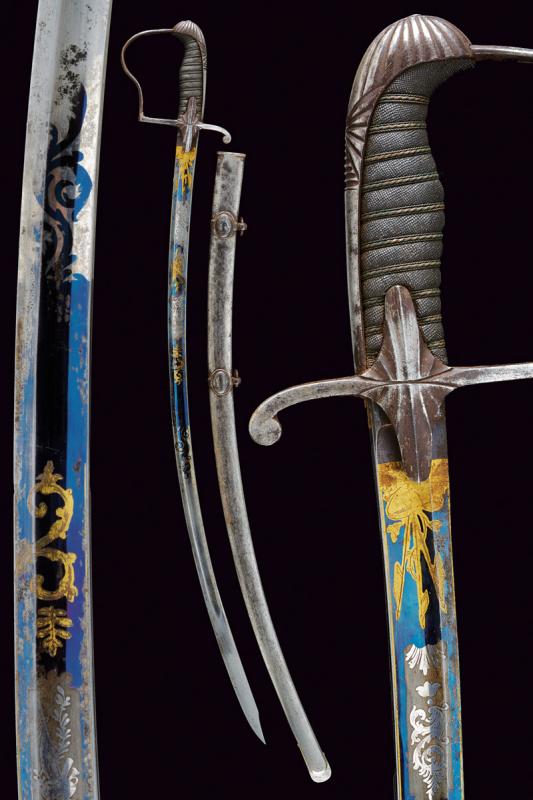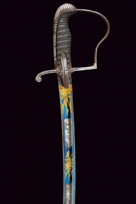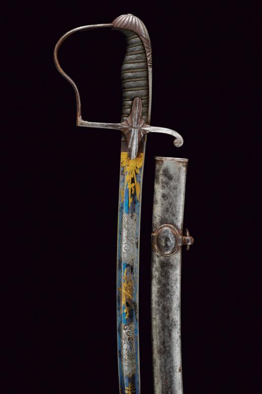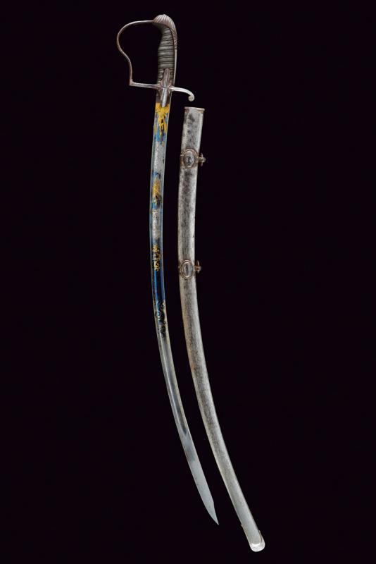 Sciabola da ufficiale con bellissima lama, datazione: 1850/60 provenienza: Granducato di Toscana, Lama curva a un filo e controfilo con ampio sguscio centrale, la prima parte incisa e dorata su fondo blu e opaco a trofei e motivi floreali. Fornimento monoelso in ferro con alette fermafodero e cappetta lunga decorata a scanalature. Impugnatura in legno rivestito con pelle di pesce e con trecciola metallica. Fodero in ferro a due anelli di sospensione su fasce convesse. Piccoli danni da ruggine. In patina. lunghezza 97 cm.