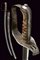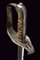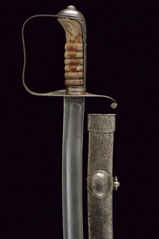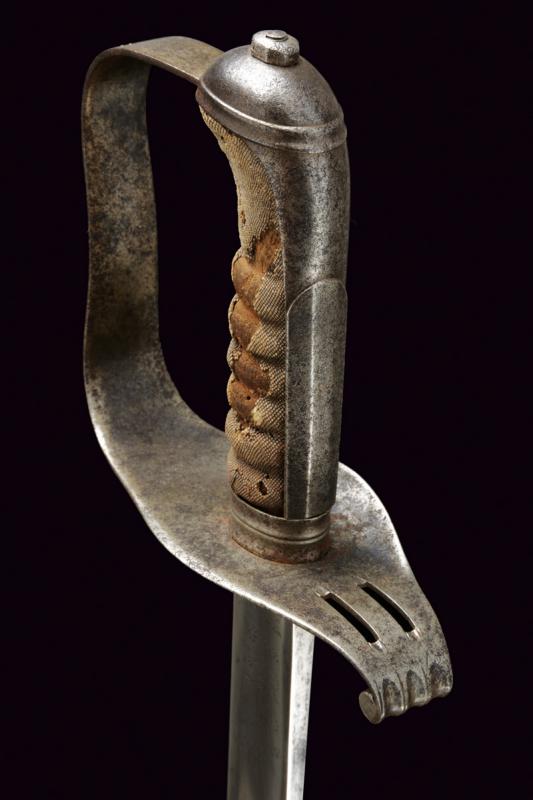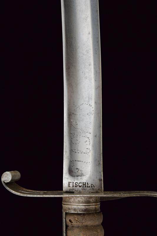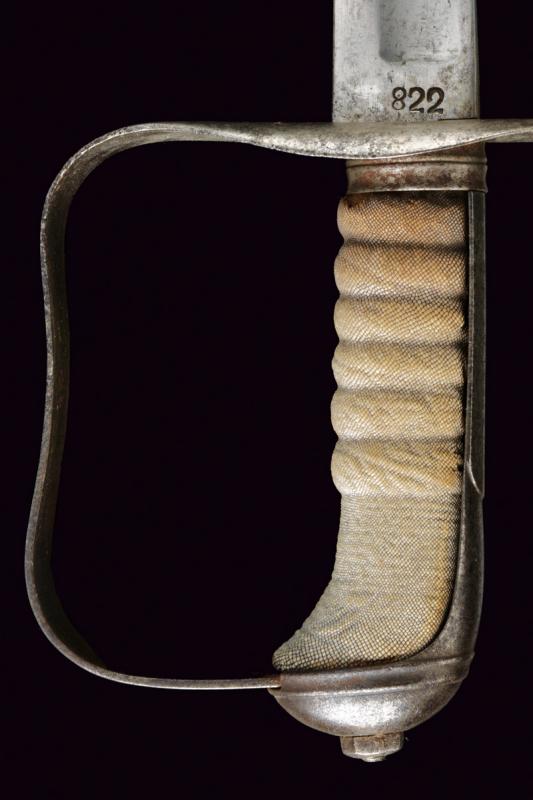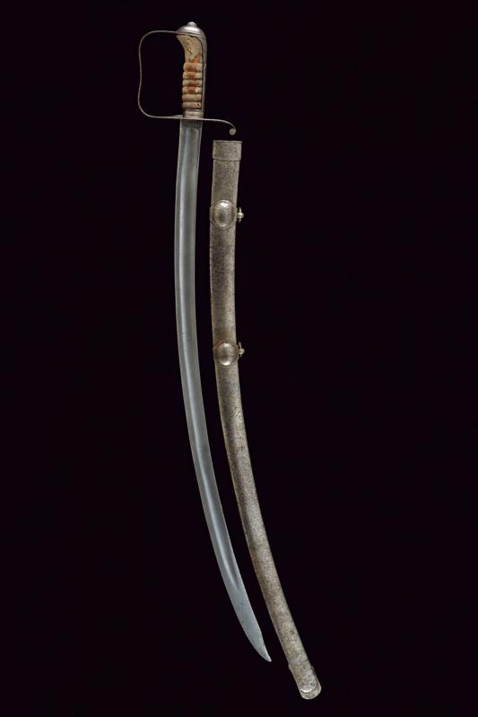 Sciabola sul modello austriaco, datazione: Secondo quarto del XIX Secolo provenienza: Ducato di Parma e Piacenza, Larga lama curva a un filo e controfilo con ampio sguscio centrale, il tallone marcato 'FISCHER' e, sull'altro lato '822'. Fornimento in ferro con largo e piatto ramo di guardia, cappetta lunga, faccettata alla base. Impugnatura in legno con resti di rivestimento da pelle di pesce senza trecciola. Fodero in ferro a due anelli di sospensione su larghe fasce convesse. lunghezza 97 cm.
