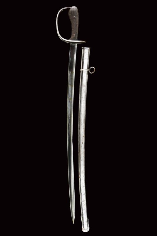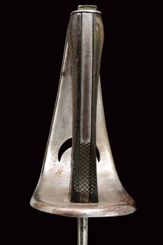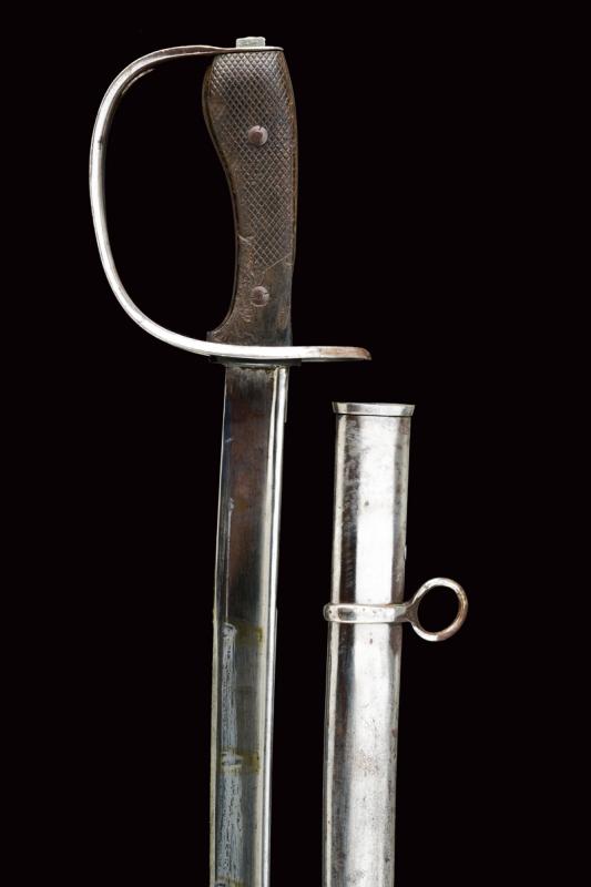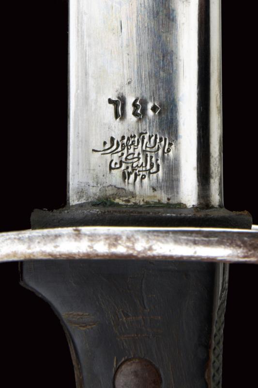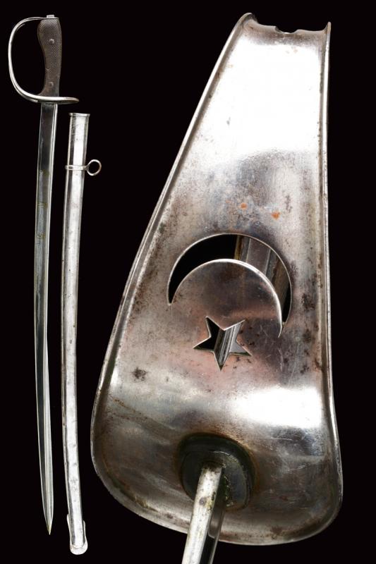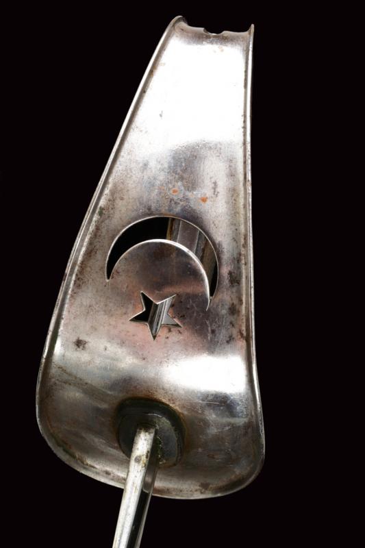 Sciabola da ufficiale, datazione: inizio del XX Sec. provenienza: Turchia, Lama curva a un filo, punta e breve controfilo, con dorso a bacchetta, recante alla base marcatura in caratteri arabi e numerazione. Fornimento in ferro. Ampia guardia con traforo a stella e mezzaluna. Impugnatura in corno zigrinato con scasso per il pollice al dorso. Fodero in ferro con un passante e una campanella fissa. Bottoncino circolare distaccato ma presente. lunghezza 99 cm.