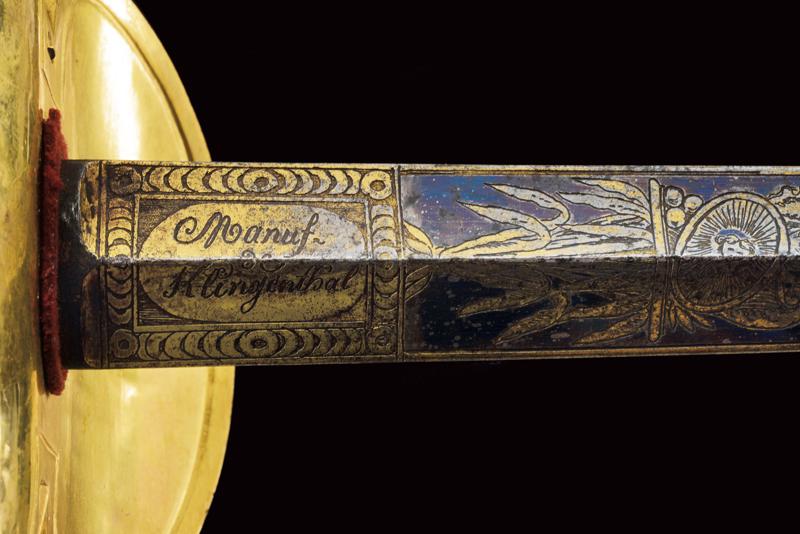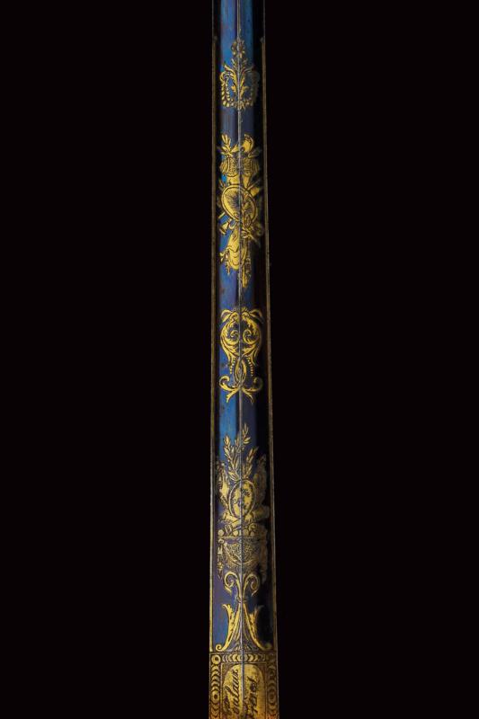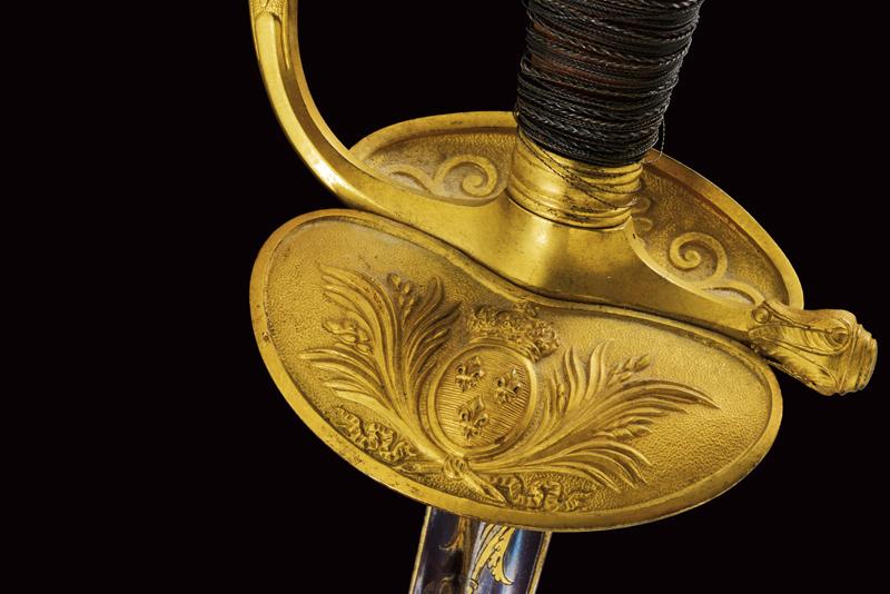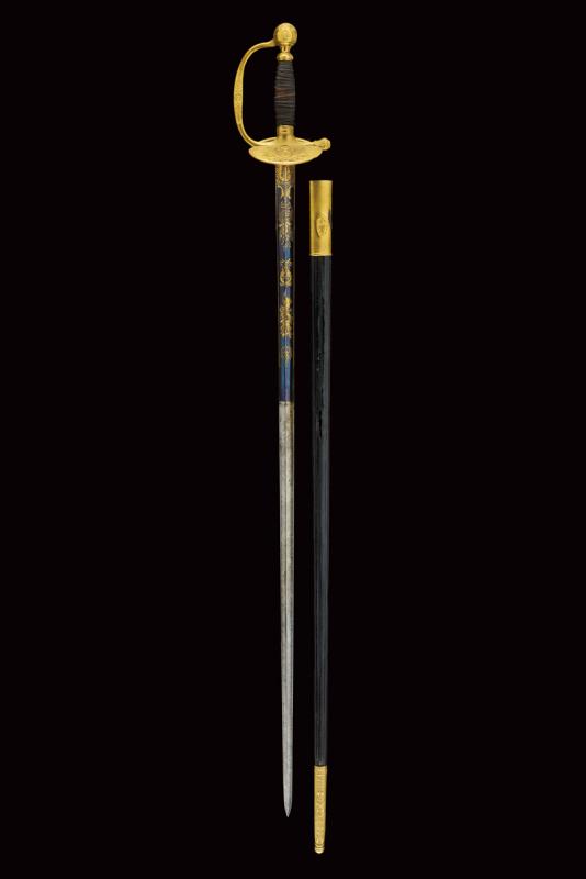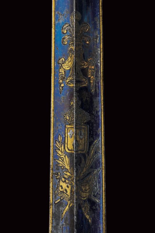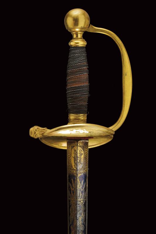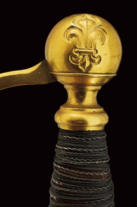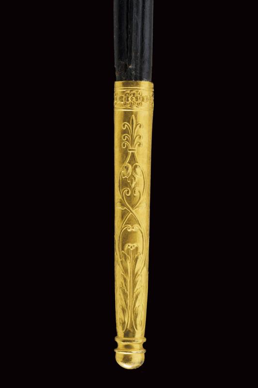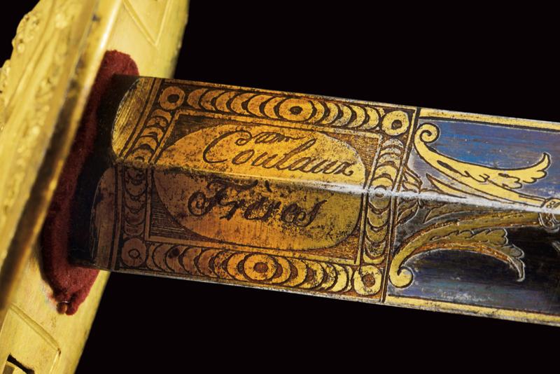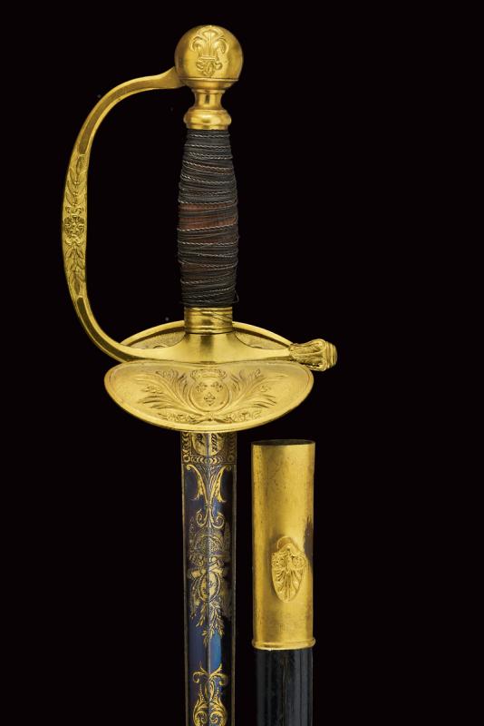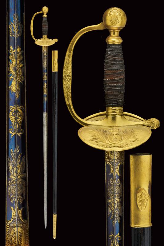 Spadino da ufficiale, datazione: 1820-30 provenienza: Francia, Lama dritta a sezione di losanga con facce incavate, a due fili, recante al forte resti di fondo brunito con belle incisioni a fiorami e trofei recanti resti di doratura. Sul lato di terza scudo fra cannoni incrociati con motto 'Vive le Roi'; alla base la firma 'Coulaux Freres'. Sul lato di quarta scudo a tre gigli sormontato da corona, alla base 'Manuf. a Klingenthal'. Fornimento in ottone dorato. Valva anteriore con scudo a tre gigli e corona in rilievo. Giglio intagliato anche al pomo, la guardia con fiori. Impugnatura in legno con resti di trecciola metallica. Fodero in cuoio con fornimenti in ottone dorato. lunghezza 100,5 cm.
