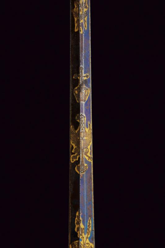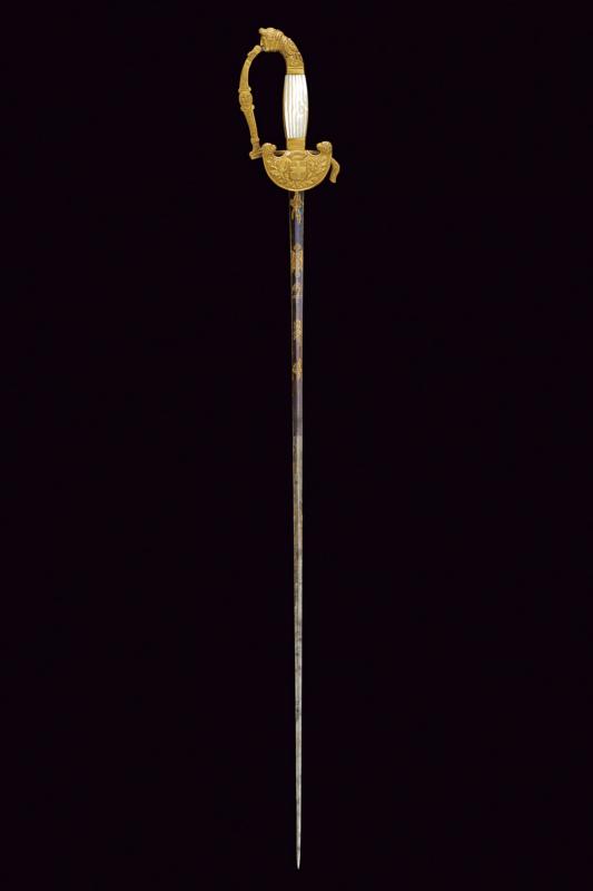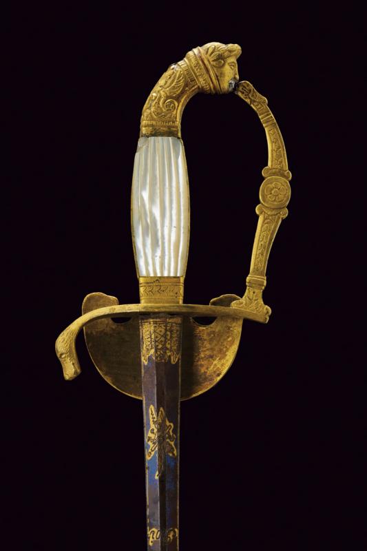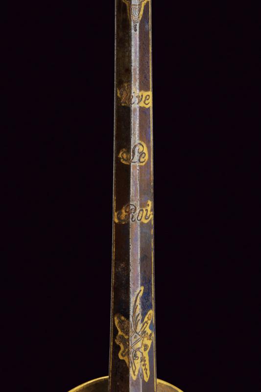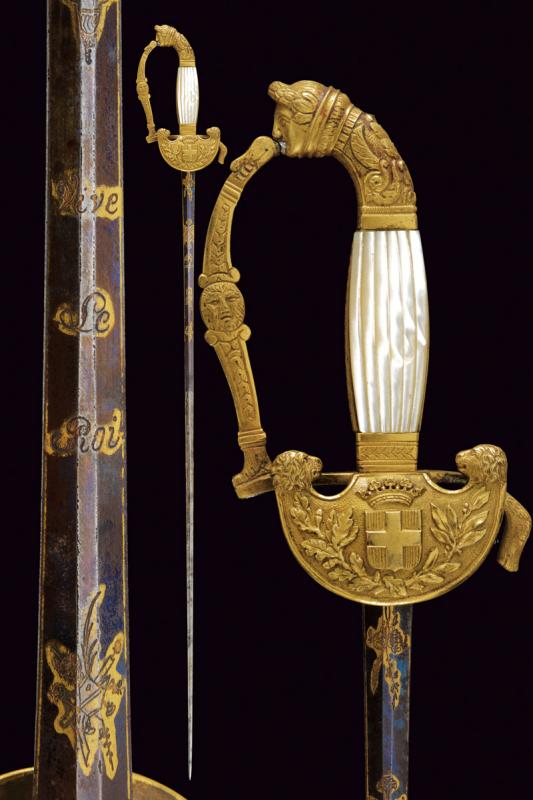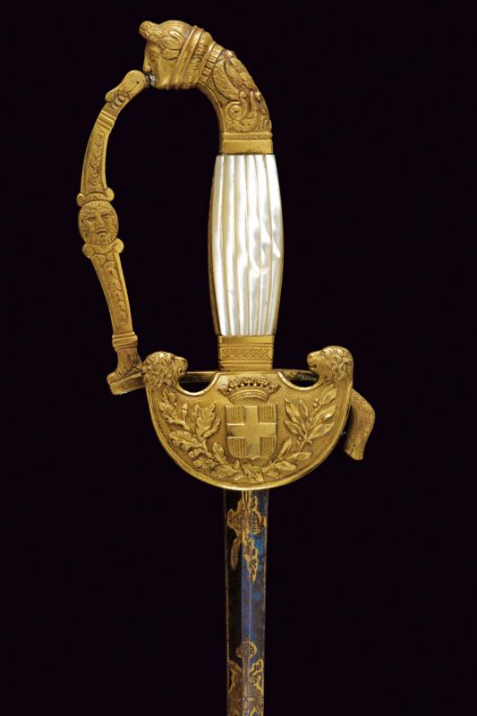 Spadino da diplomatico, datazione: 1840 circa provenienza: Regno di Sardegna, Lama a due fili di sezione esagonale, la prima parte incisa e dorata su fondo blu con Aquila Sabauda, motto 'Vive Le Roi', trofei e motivi floreali. Fornimento in ottone dorato con stemma Sabauda fra fronde d'alloro e di quercia sulla pelta incorniciato da due teste di leone. Guardia con mascherone, pomo con volto, guancette in madreperla scanalata. lunghezza 96.5 cm.