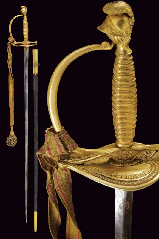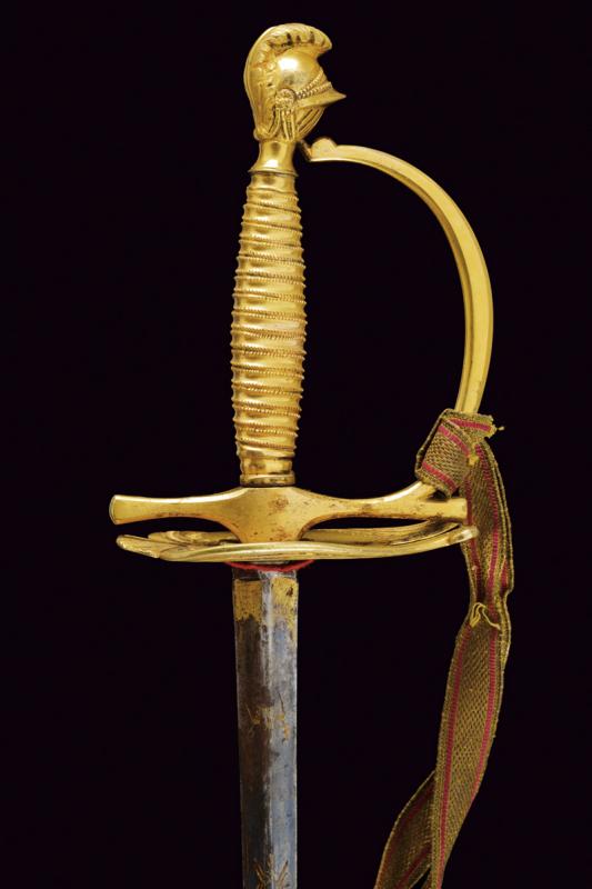 Spadino da ufficiale dell'Ordine Navale di Santo Stefano, datazione: Metà del XIX Secolo provenienza: Granducato di Toscana, Lama dritta a due fili di sezione esagonale, recante al forte piccole incisioni floreali e a trofei ageminate in oro su fondo blu, alcune zone con danni da ruggine; fornimento in bronzo dorato a mercurio, coccia a cuore con cornicette incise, elso con massello in rilievo, pomo a elmo con cimiero, impugnatura in bronzo incisa ad imitare la trecciola. Completo di dragona e fodero in cuoio (forti segni di usura) con fornimenti in ottone dorato. Rara. lunghezza 95 cm.