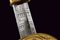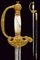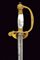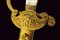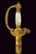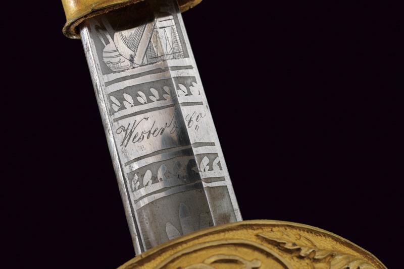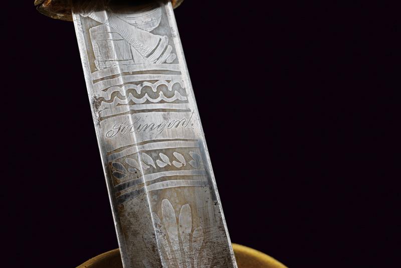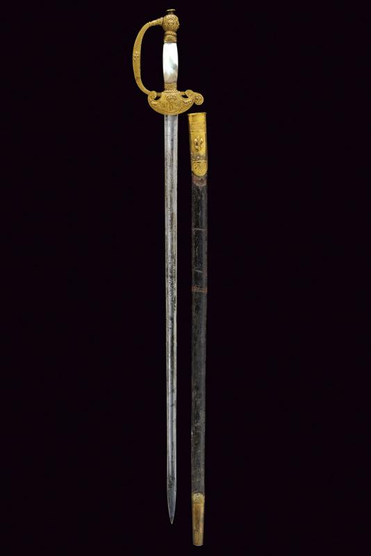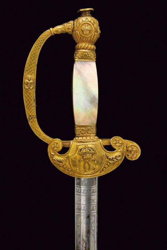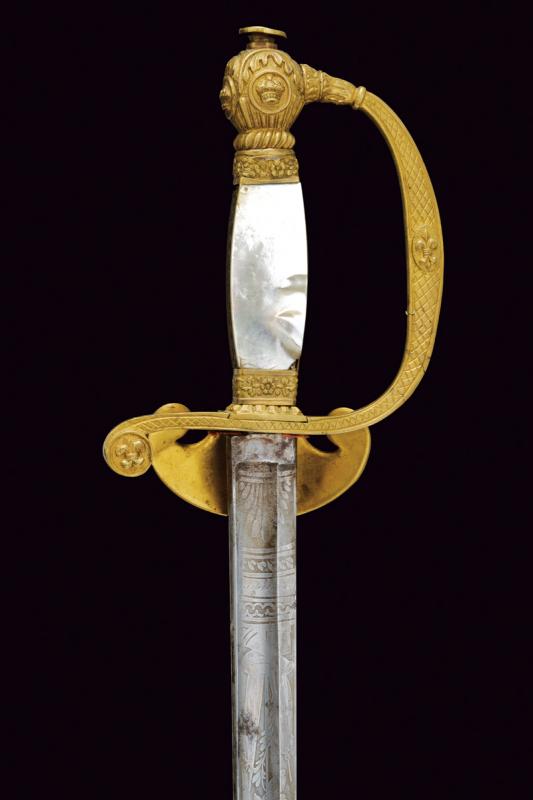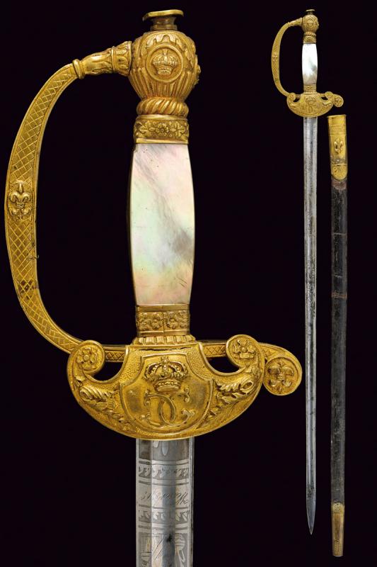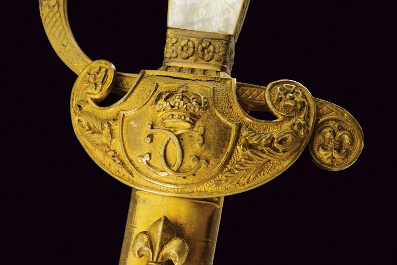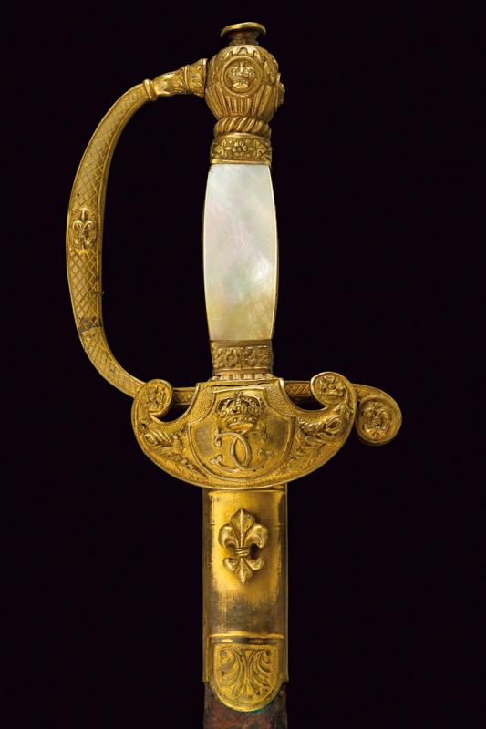 Spada da dignitario, datazione: Metà del XIX Secolo provenienza: Ducato di Parma e Piacenza, Lama dritta a un filo e controfilo con sguscio centrale, la prima metà finemente incisa a trofei e motivi floreali, la base firmata 'Wester & Co.' e 'Solingen'. Fornimento in bronzo con resti di doratura, pelta con monogramma di Carlo III sotto corona in scudetto, braccio dell'elso e guardia con giglio, pomo con corone. Impugnatura con guancette in madreperla. Completa di fodero in cuoio con fornimenti in ottone dorato, cappa firmata 'SASSI MILIANO'. Piccoli difetti. lunghezza 86.5 cm.