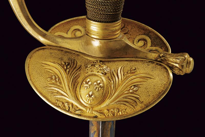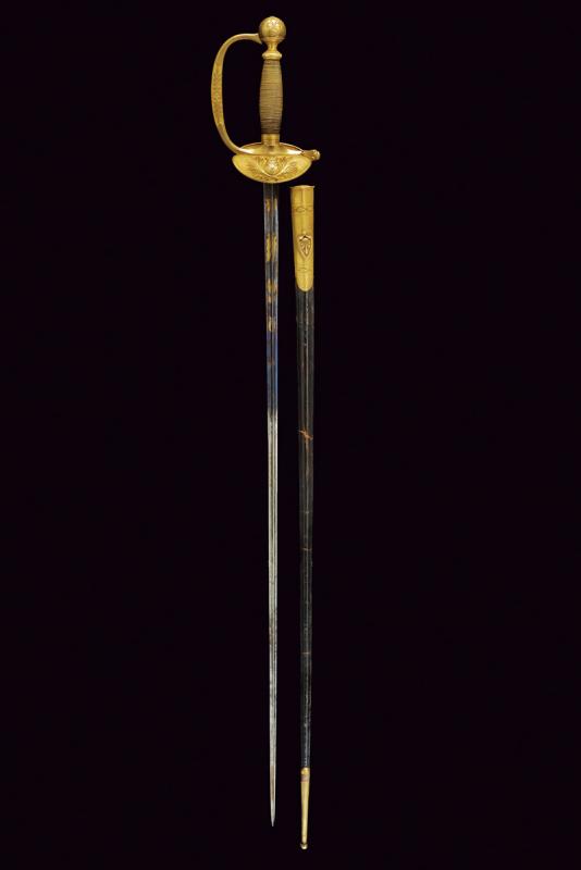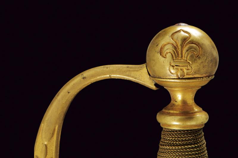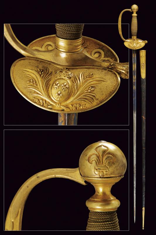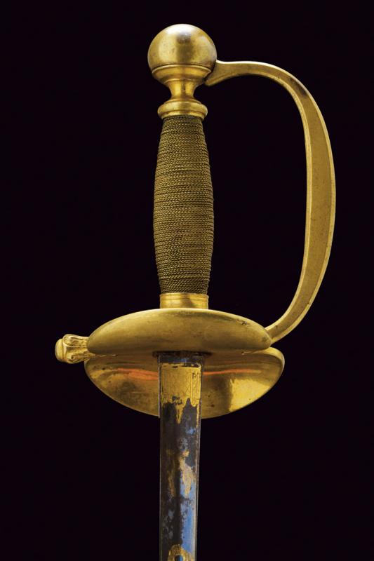 Bello spadino da ufficiale, datazione: Prima metà del XIX Secolo provenienza: Regno delle Due Sicilie, Lama di sezione triangolare con facce incavate, la prima parte incisa e dorata su fondo blu a trofei e motivi floreali. Fornimento in ottone dorato, la pelta con stemma a tre gigli sotto corona, guardia a motivi floreali in bassorilievo e pomo con giglio. Impugnatura in legno rivestito di trecciola metallica. Fodero in cuoio con fornimenti in in ottone inciso. lunghezza 95.5 cm.