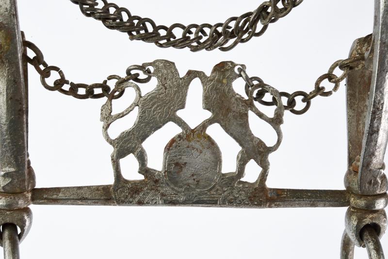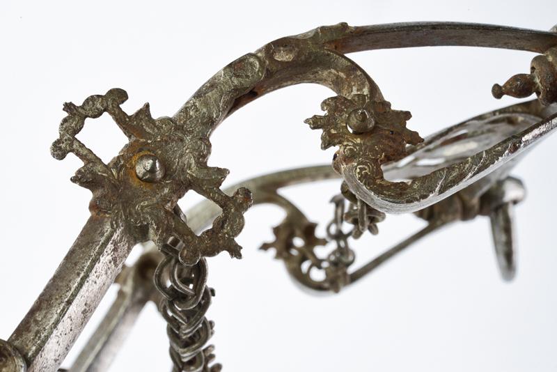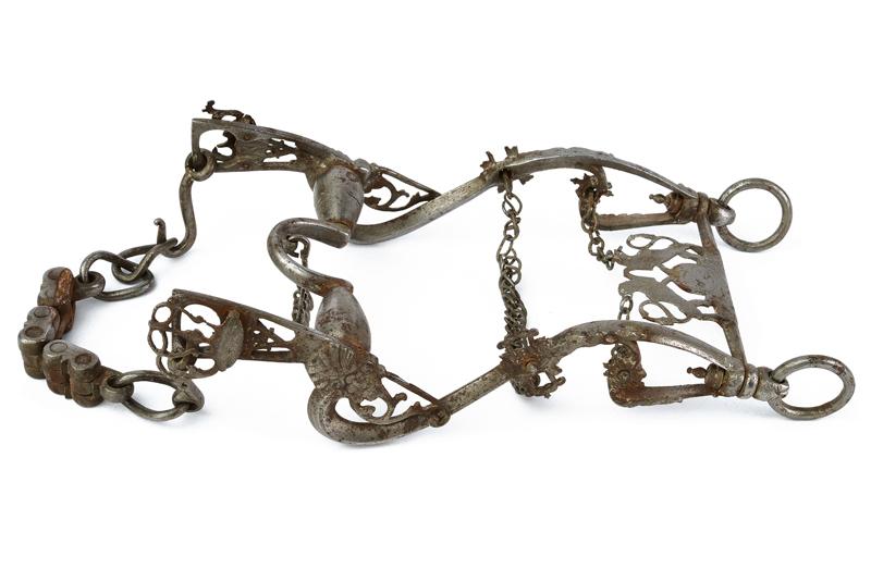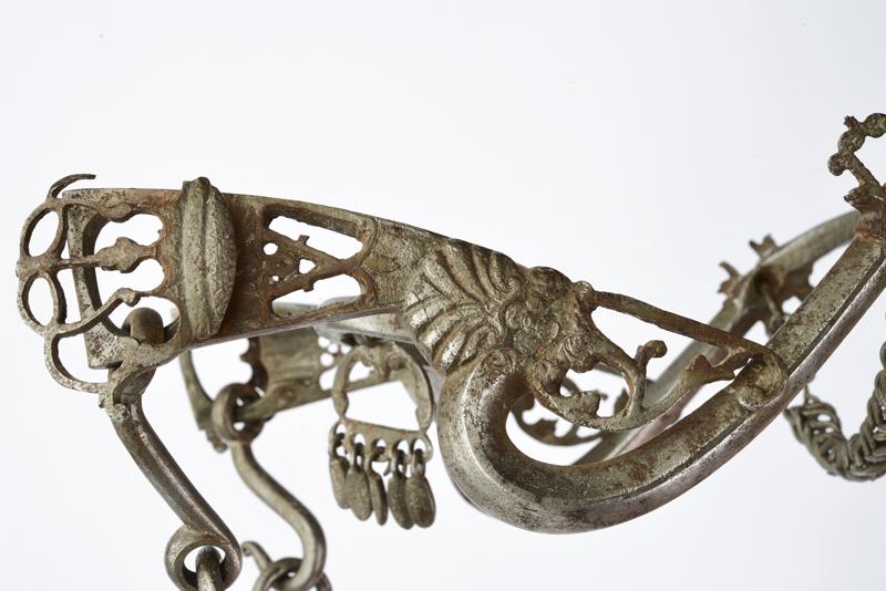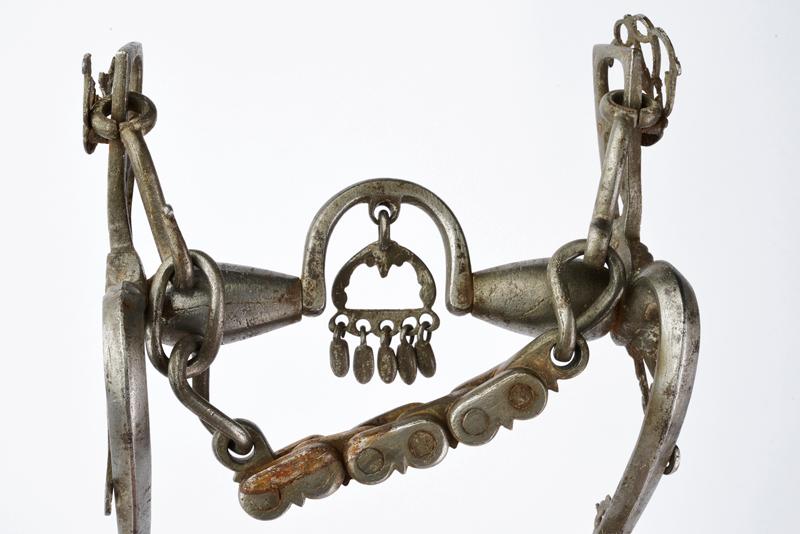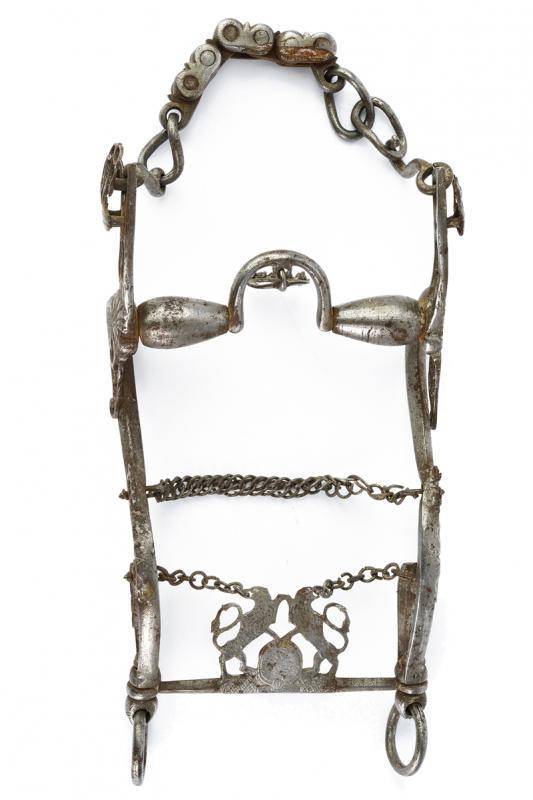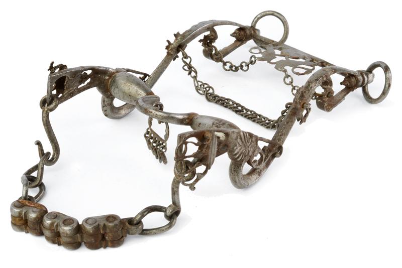 Morso, datazione: XVII Secolo provenienza: Francia, In ferro, con guardie operate ad intaglio, terminanti con voltoi e campanalle tonde articolate su fauci di ceffi animali a tutto tondo, imboccatura fissa con ponticello e scioglilingua, stanghette sempre intagliate a giorno, completo di barbozzale e catenelle. lunghezza 27 cm.
