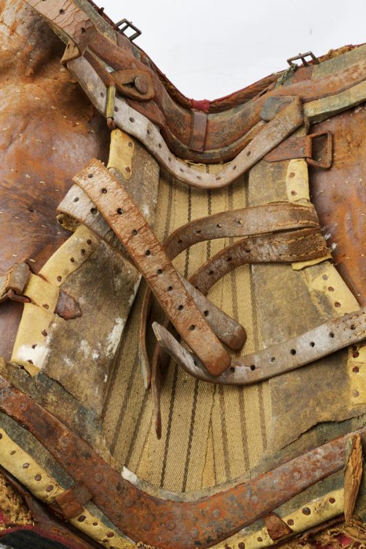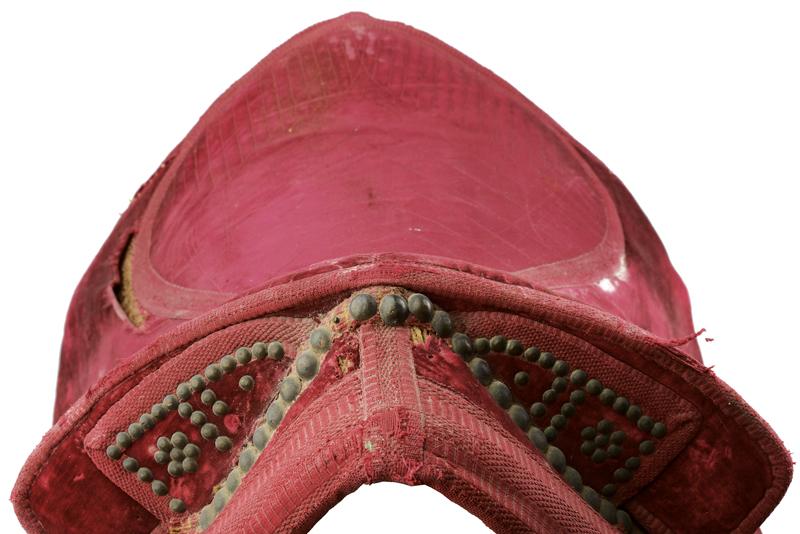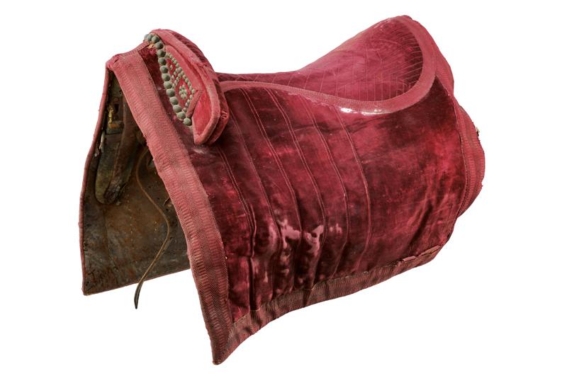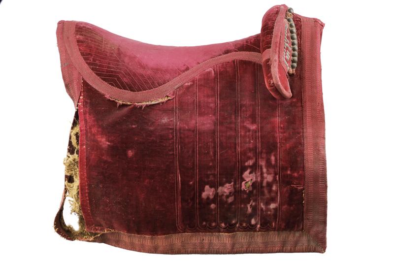 Sella da ufficiale Secondo Impero, datazione: 1870 circa provenienza: Francia, Struttura in legno rivestita di velluto bordeaux e con bordo in tessuto dello stesso colore. L'arcione anteriore rilevato e decorato con rivetti. Completa di cinghie in cuoio. Abrasioni e danni. Rara. dimensioni 70 x 25 x 48 cm.