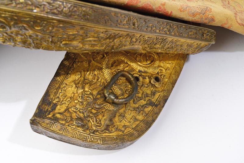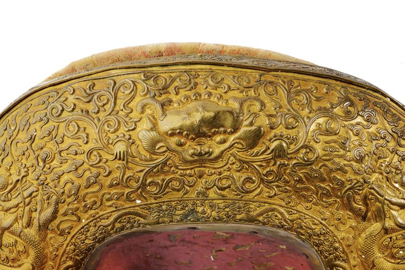 Straordinaria sella Sino-Tibetana, datazione: XVII/XVIII secolo provenienza: Tibet, In legno parzialmente laccato di rosso, con bellissimi fornimenti su tutte le superfici, ben visibili e in ottone con resti di doratura, riccamente sbalzati ed incisi a mascheroni, draghi e motivi floreali in rilievo. Gli arcioni con bordo lavorato en suite. I bordi dei fianchi a greca. La seduta con imbottitura rivestita di tessuto color beige con ricami in policromia. La parte inferiore recante un vecchio restauro con placca in rame. L' elemento centrale recante una firma; su un lato resti di un timbro in ceralacca rossa. Due cinghie in cuoio. Provenienza: importate collezione privata belga. dimensioni 35 x 29 x 52 cm.