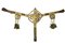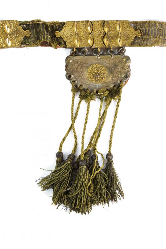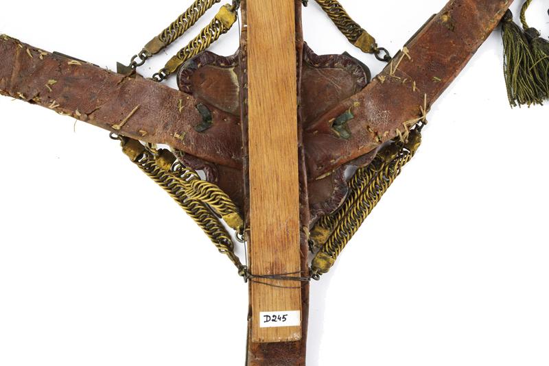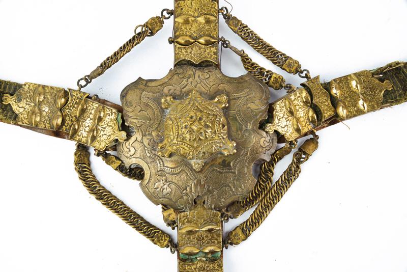 Rarissimo pettorale da cavallo, datazione: XVII Secolo provenienza: Ungheria, In marocchino rosso e fornimenti in ottone con resti di doratura. La placca centrale incisa e in parte lavorata in altorilievo. Dalla placca partono quatto bande decorate con tessuto verde e fornimenti in ottone inciso, quelle orizzontali con pendenti lavorati en suite con la placca centrale e munite di nappe. Le stringhe verticali con fornimenti decorati nello stesso modo. Tutti uniti da doppie catenine. Il tessuto con danni da usura e piccole mancanze. Di alta qualità. dimensioni 99 x 50 cm.