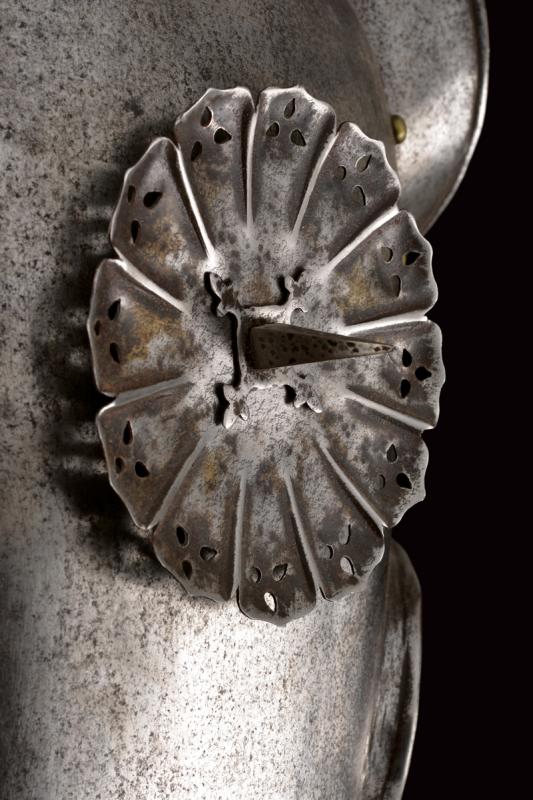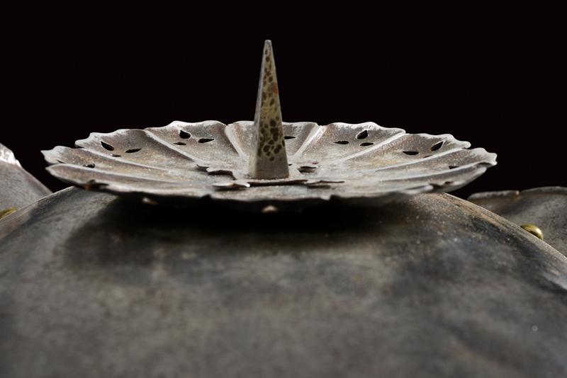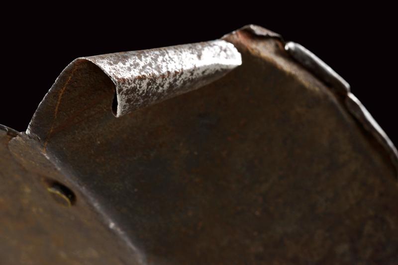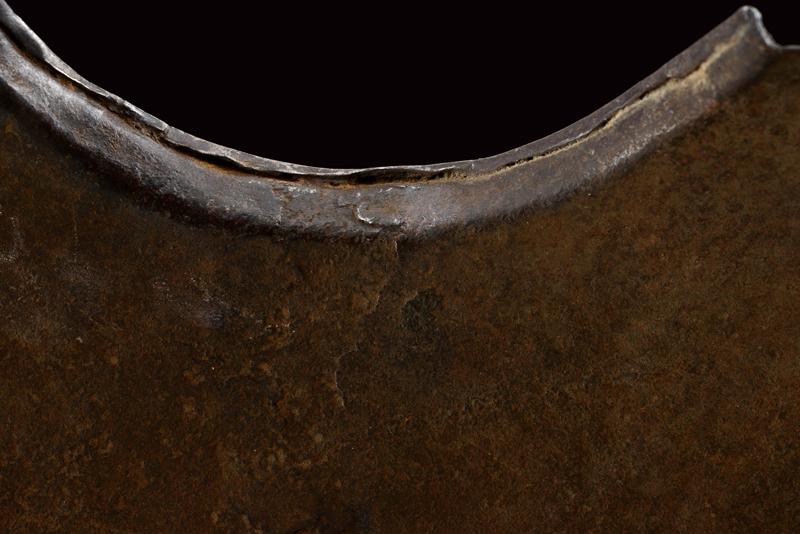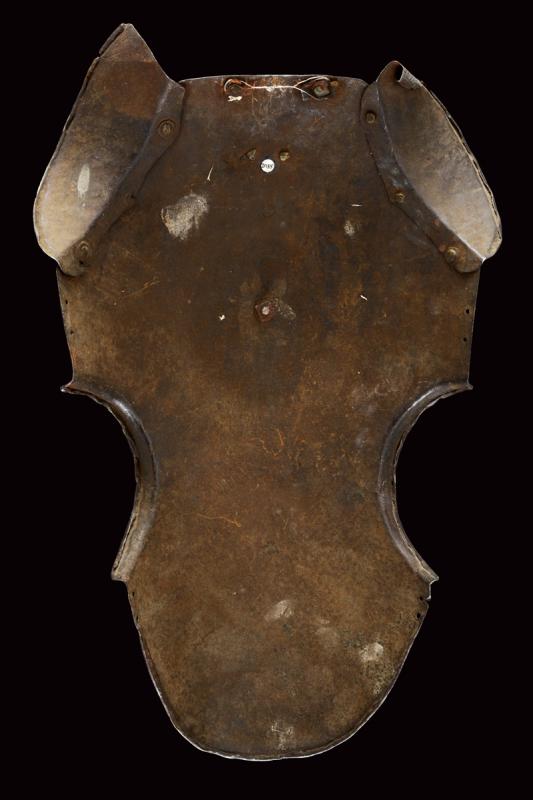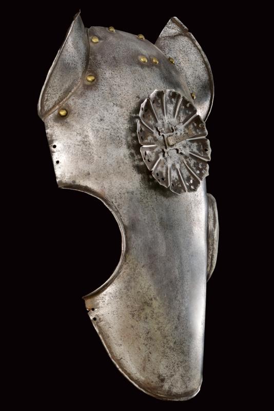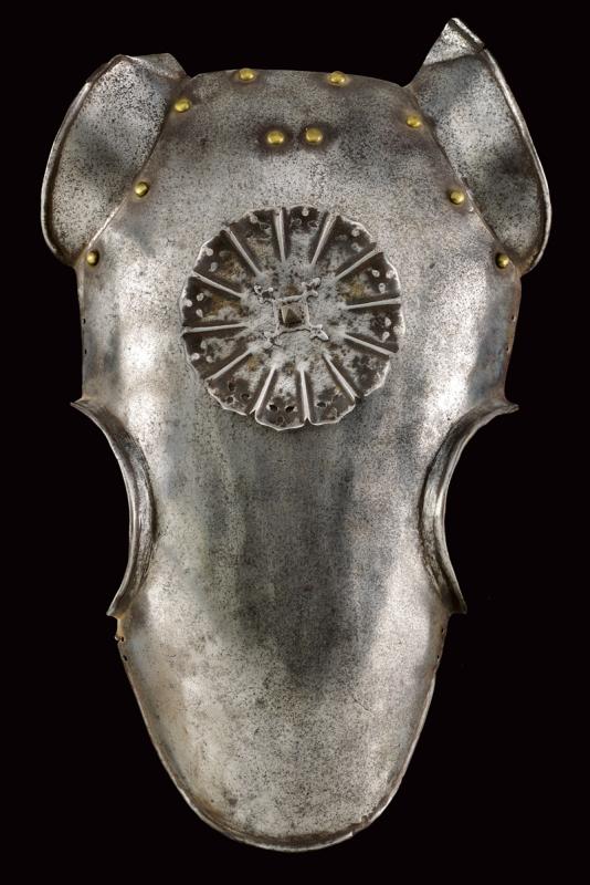Testiera da cavallo, datazione: 1600 circa provenienza: Francia, Di forma convessa, liscia, con paraocchi rilevati e orlati. La parte inferiore con bordo orlato, i paraorecchie rivettati e orlate, al centro rosetta intagliata e traforata (probabilmente del XIX secolo), con piccola cuspide faccettata e posata su un fornimento munito di quattro gigli. La parte interna con segni di martellature. Piccoli difetti. Pubblicata in 'Eperonnerie et parure du cheval', Brussels 2005, collezione La Boisseliere no. 219 pag. 150. dimensioni 42 x 24 cm.