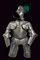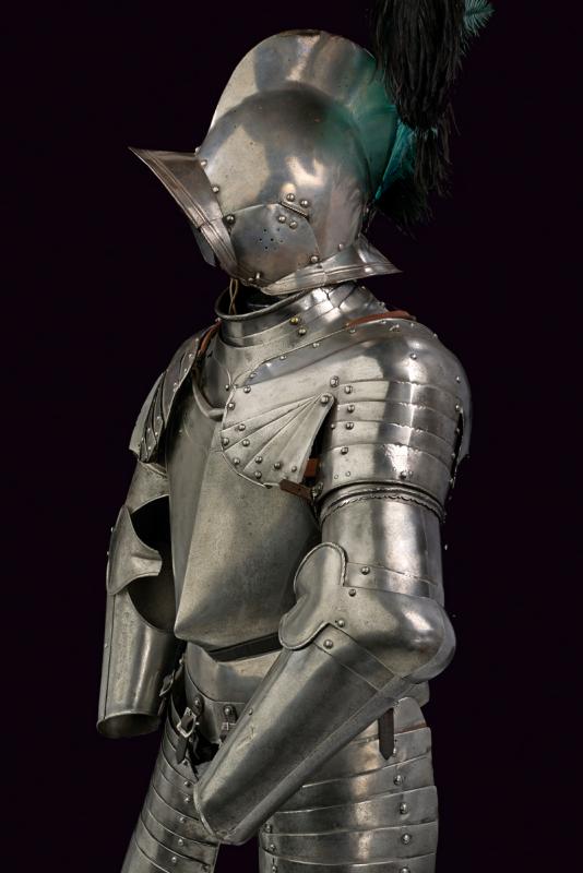 Corsaletto composito da uomo d'arme, datazione: Fine del XVI Secolo provenienza: Svizzera, Borgognotta dotata di coppo battuto in un unico pezzo, munita di alta cresta (riparazioni e piccoli danni al bordo); la tesa e la gronda in un unico pezzo con il coppo, entrambe aguzze, con margine a lista ribassata bordato da un cannellino e con bordo cordonato e inciso a fingere il tortiglione. Riverniciatura nera all'interno e alcune riparazioni recenti. Guanciali mobili con fori aeratori e bordo en suite con il resto dell'elmo. La gronda con punzone non chiaramente leggibile (Norimberga?). Goletta con scollo cordonato e lavorato a fingere il tortiglione, due lame di collo su ciascun lato e le lame di padiglione con spigolature. Petto costolato in mezzeria con tapul ben pronunciato, al centro un'incisione a croce svizzera, scollo e guardascella con spesso cordone inciso a fingere il tortiglione, la falda a due lame; i fianchi con spigolature. La schiena con margini a lista ribassata, cannellino decorativo allo scollo e falda in un unico pezzo con la piastra dorsale. Spallacci alla svizzera (due parti asportate sul retro), dotati di ali a lamelle sventagliate. Bracciali interi; i semicannoni superiori di braccio con bordo a intaglio festonato e canale di rotazione inciso a fingerre il tortiglione, cubitiere con alette in un unico pezzo; bordi cordonati e incisi a fingere il tortiglione. Scarselle a nove lame (una con riparazione e una sostituzione recente). Bell'insieme con caratteristiche non comuni. Manichino non incluso. altezza about 120 cm.