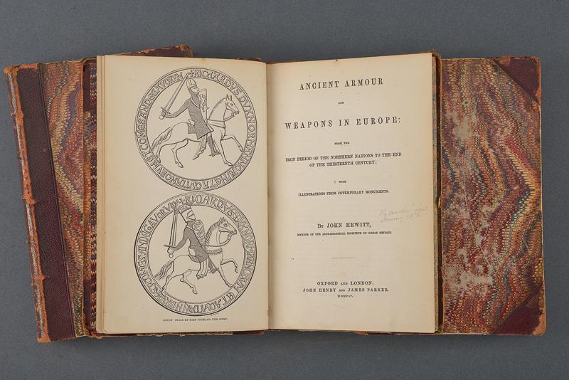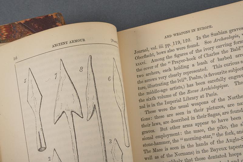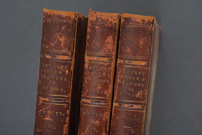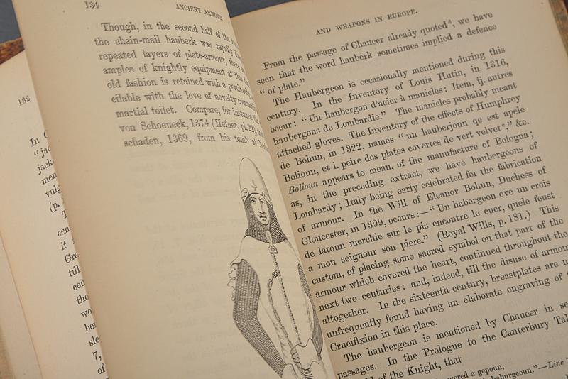 Hewitt, John, datazione: 1860 provenienza: Londra, 'Ancient Armour and Weapons in Europe', John Henry and James Parker, Oxford and London, MDCCCLX; tre volumi; 387, 343 e 420 pagine con innumerevoli illustrazioni in b/n, copertine rigide con dorso ed angoli in pelle (parzialmente abraso), impressioni e titolo in oro. All'interno ex libris 'Frank Greenhill'. altezza 22.5 cm.