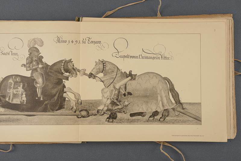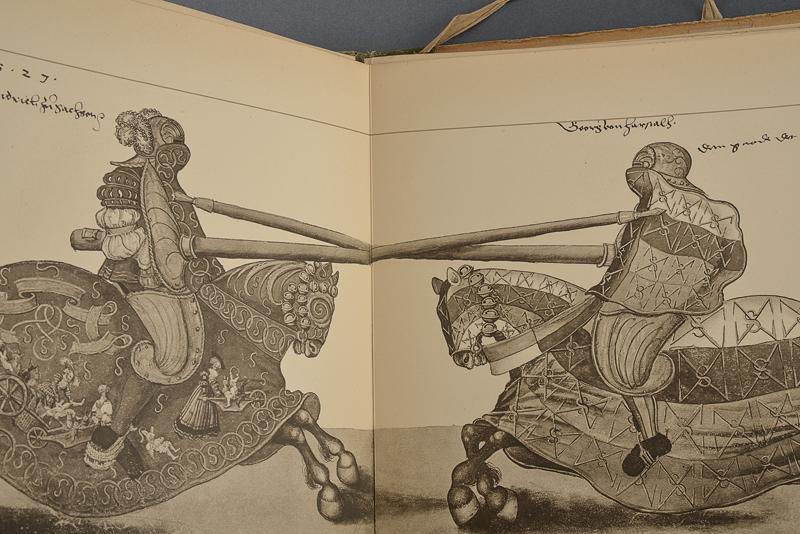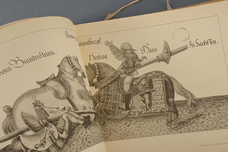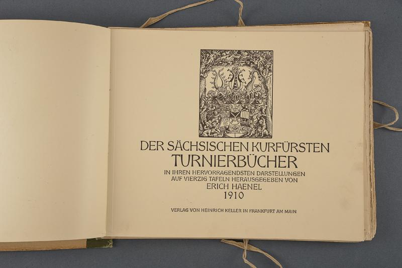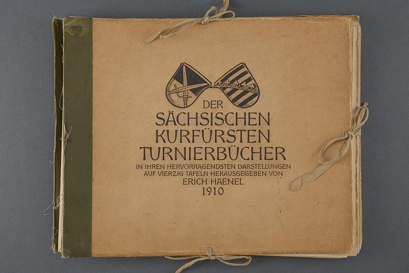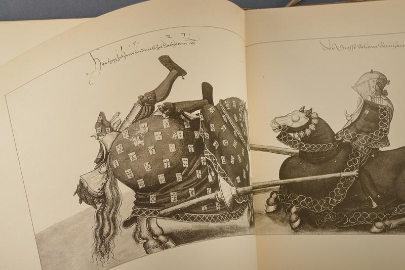 Haenel, Erich, datazione: 1910 provenienza: Francoforte, 'Der sächsischen Kurfürsten Turnierbücher, in ihren hervorragendsten Darstellungen auf vierzig Tafeln', Verlag von Heinrich Keller in Frankfurt am Main, 1910. 52 pagine di testo e 40 tavole. Molto raro. altezza 30 cm.