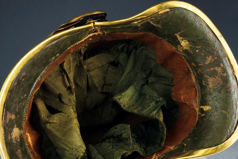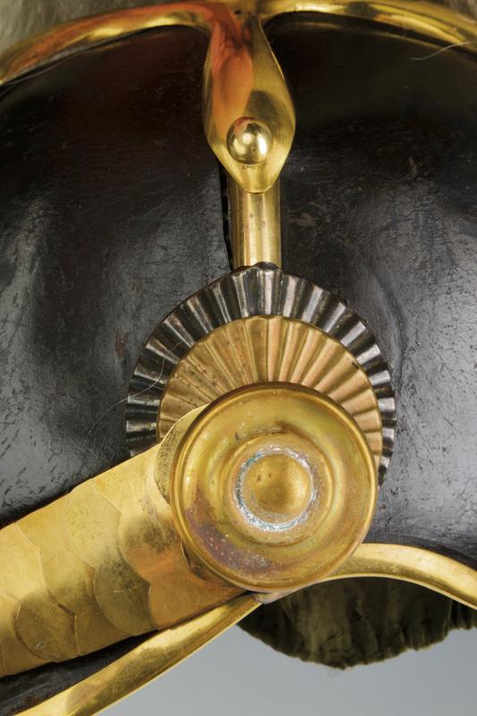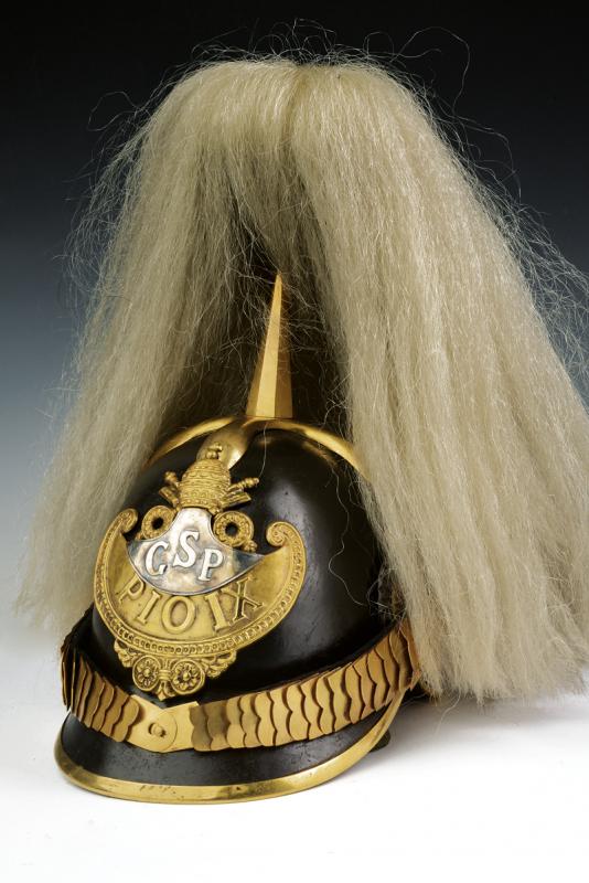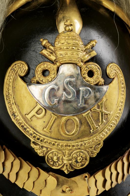 Elmo per ufficiale della Guardia Svizzera, datazione: Metà del XIX Secolo provenienza: Stato Pontificio, Coppo in cuoio annerito con metallerie dorate, coccarda oro-argento, fregio con lunetta argentata rercante a sbalzo le lettere 'GSP', completo di pennacchio originale in crine bianco, interno in broccato di seta verde e alluda in pelle marrone. Raro esemplare del primo tipo. Un esemplare simile nel Museo Stibbert a Firenze, Boccia, 1975, no cat. 776. altezza 35 cm.