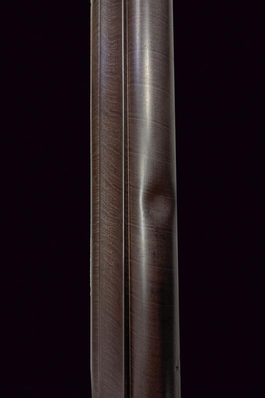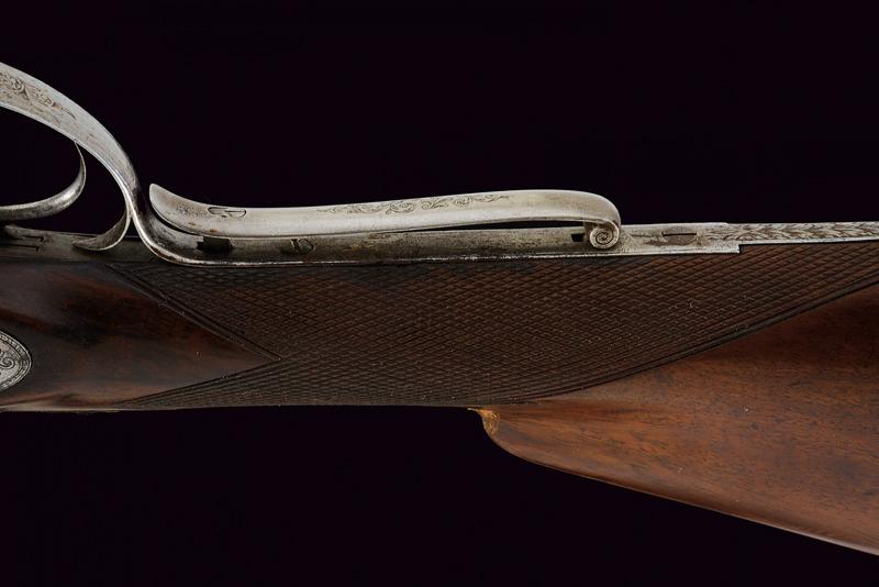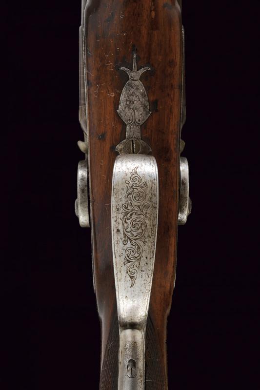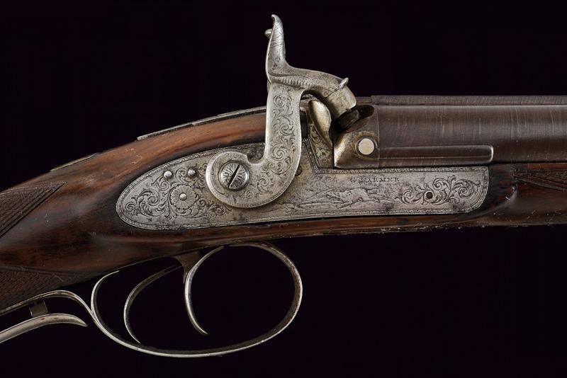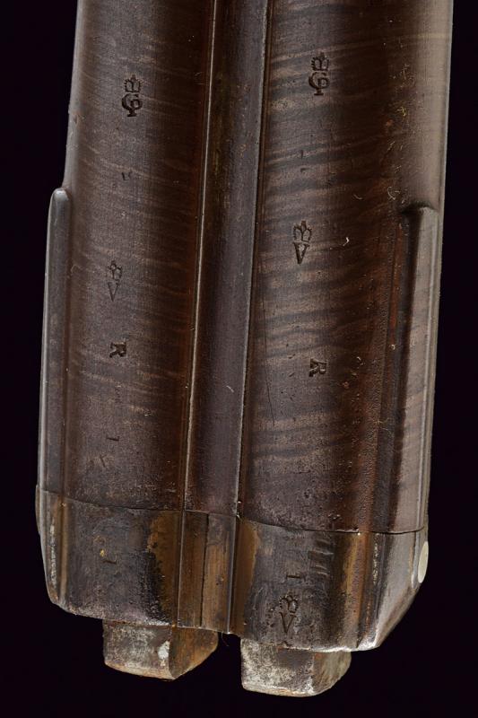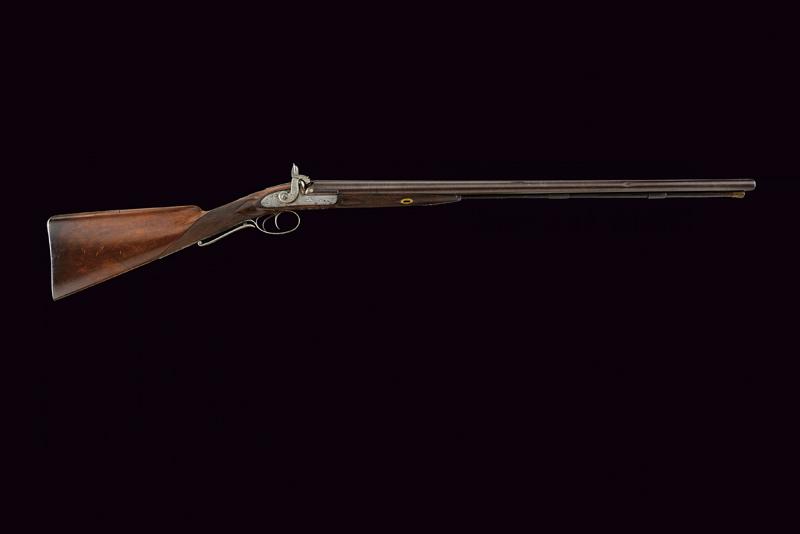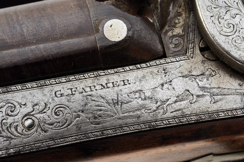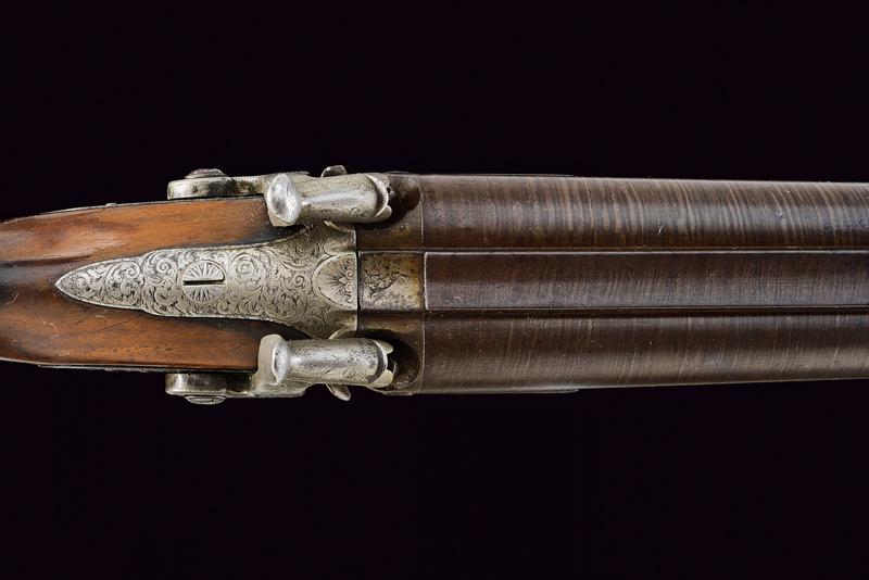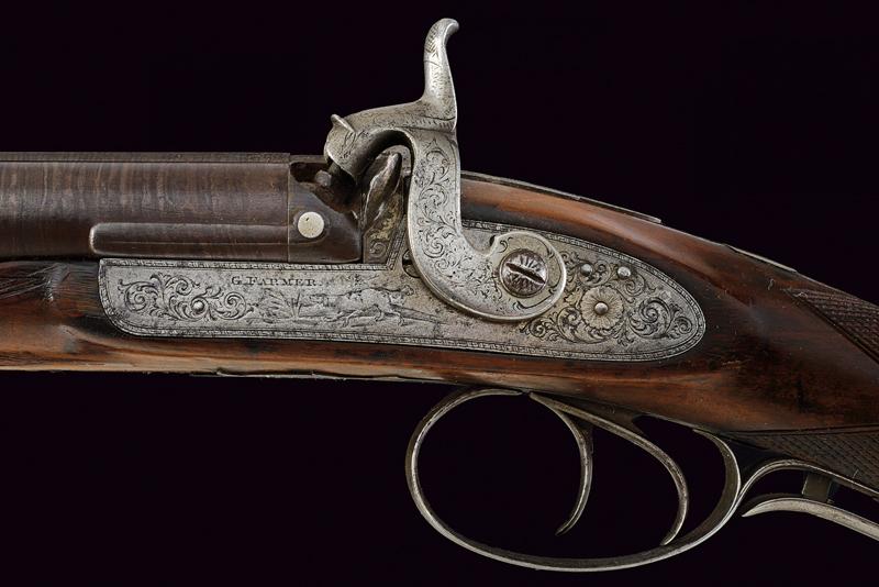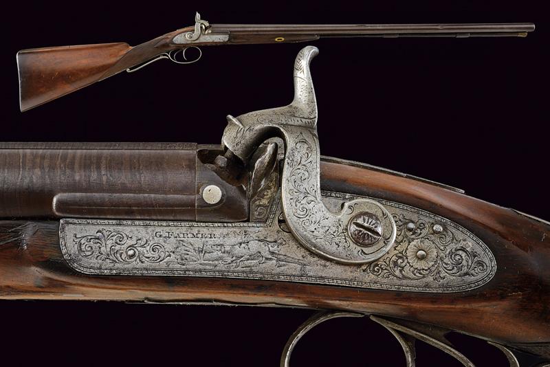 Bella doppietta a luminello di Farmer, datazione: Metà del XIX Secolo provenienza: Inghilterra, Canne lisce, tonde, a tortiglione (una con doppia un'ammaccatura laterale), con un volatile inciso alla base, bindella e mirino, cal. 17 mm; codetta finemente incisa a motivi floreali. Batterie a molla in avanti firmate 'G. FARMER' ed incise con scene di caccia e a motivi floreali. Calcio ed astina in legno con poggiamano e collo zigrinati (piccolissimi difetti). Fornimenti in ferro decorati en suite. Dietro al ponticello la sicura a pressione. Le canne con punzone del banco di prova di Londra nella parte inferiore. lunghezza 117.5 cm.