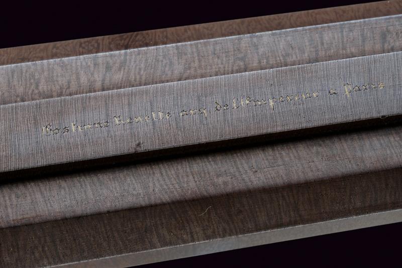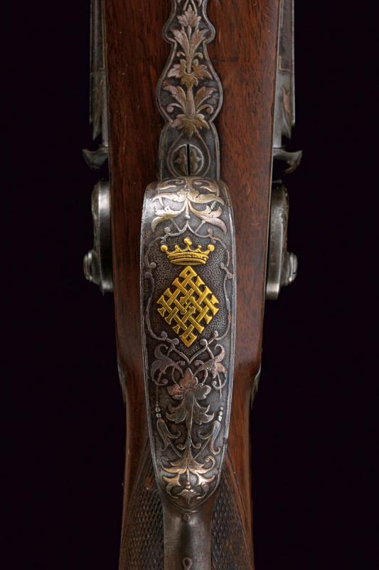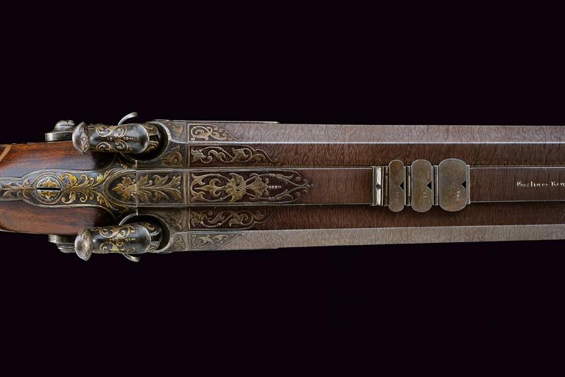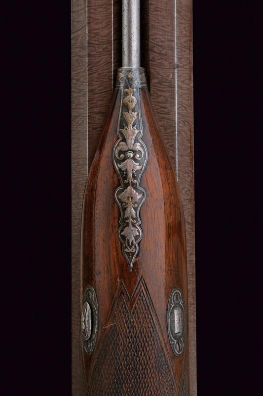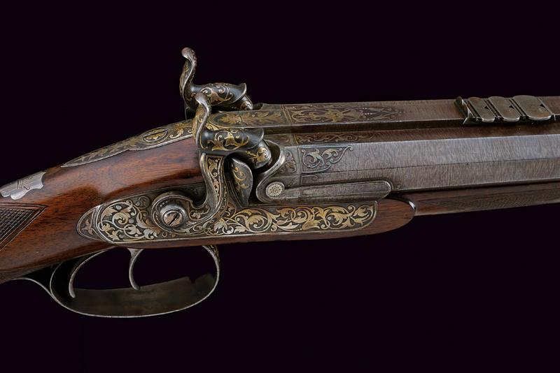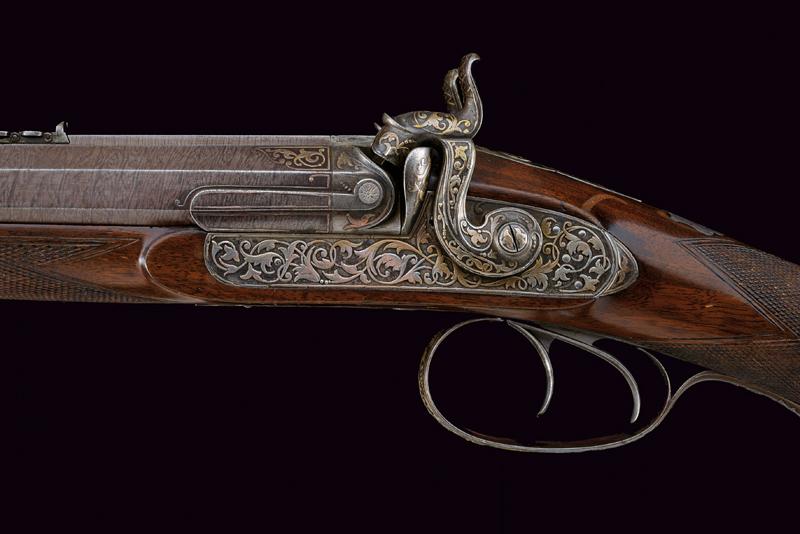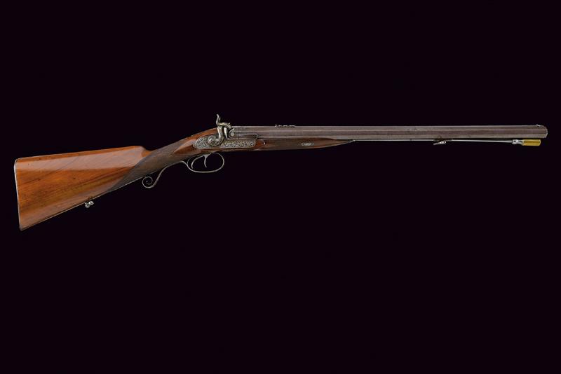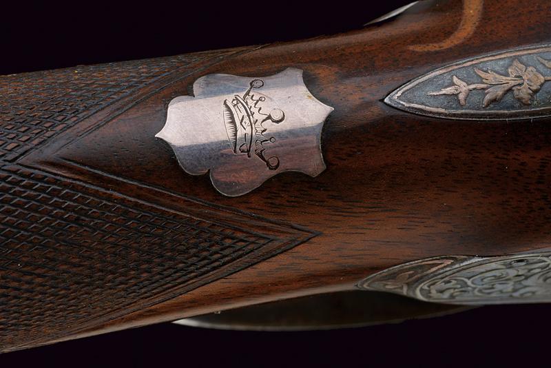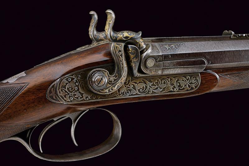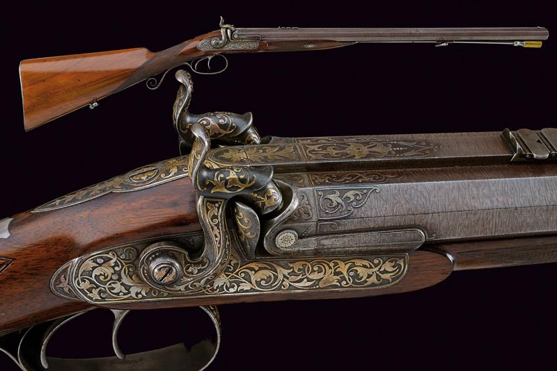 Doppietta a luminello di Gastinne Renette, datazione: Metà del XIX Secolo provenienza: Parigi, Canne ottagonali rigate, a torcione, munite di bindella dotata di mirino, di tre alzi pieghevoli marcati rispettivamente '200', '150', '100' e di uno fisso, firmata 'Gastinne Renette arq. de l'Empereur a Paris', alla base agemine in argento a volute e motivi floreali realizzati in rilievo, cal. 18 mm; la codetta lavorata en suite; batterie a molla in avanti, anche queste lavorate in argento come anche i cani e le basi dei foconi; mezza cassa in legno zigrinata sotto le canne ed al collo; fornimenti in ferro lavorati come le batterie, ponticello con ricciolo e doppio grilletto, ornato con una corona dorata sopra ad un disegno geometrico, la stessa corona è riprodotta sullo scudetto al dorso. Raro ed elegante. lunghezza 103 cm.